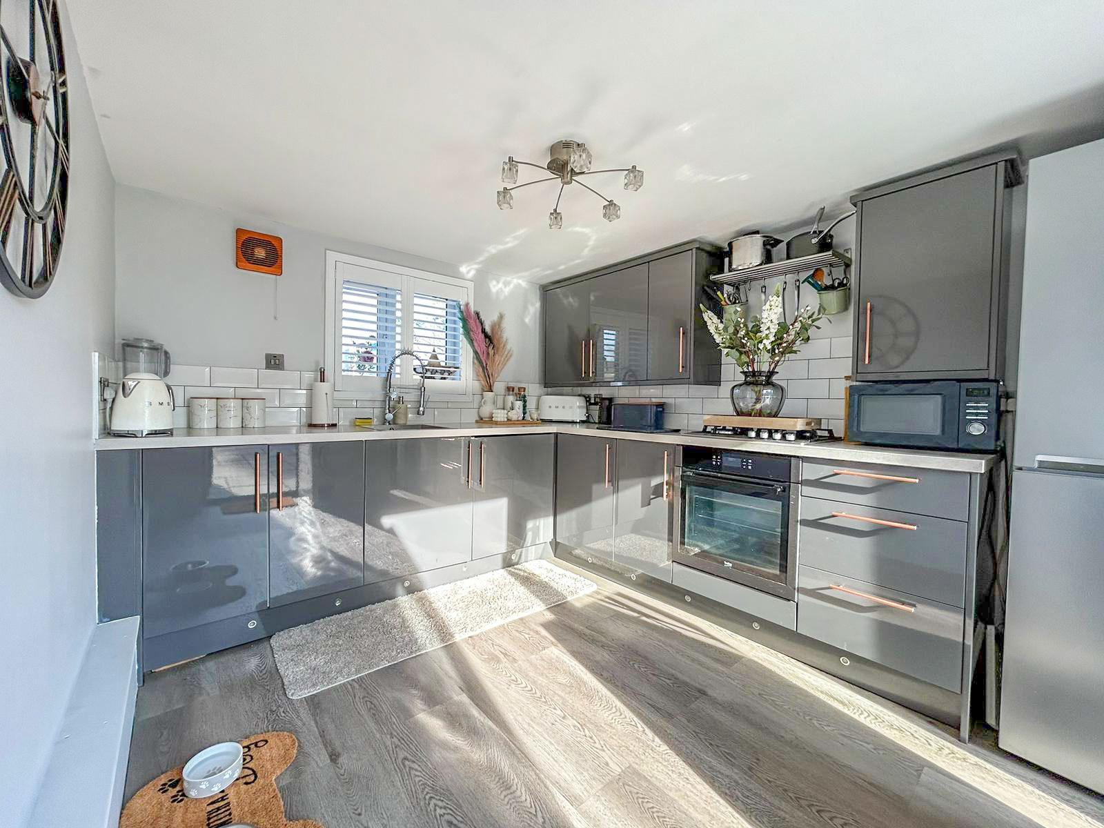 A ground floor entrance porch leading to the hall with the staircase to the first floor, off the hallway is a spacious living room with large windows allowing lots of natural light. As you carry on through the hallway you have the ground floor double bedroom to the right, with a large built-in wardrobe. To the left of this you have your modern fitted kitchen with a built in gas hob, sink and double doors offering access to the rear garden. Lastly you have your open planned sitting room/dining area with bi fold doors, also leading onto the large, enclosed garden.