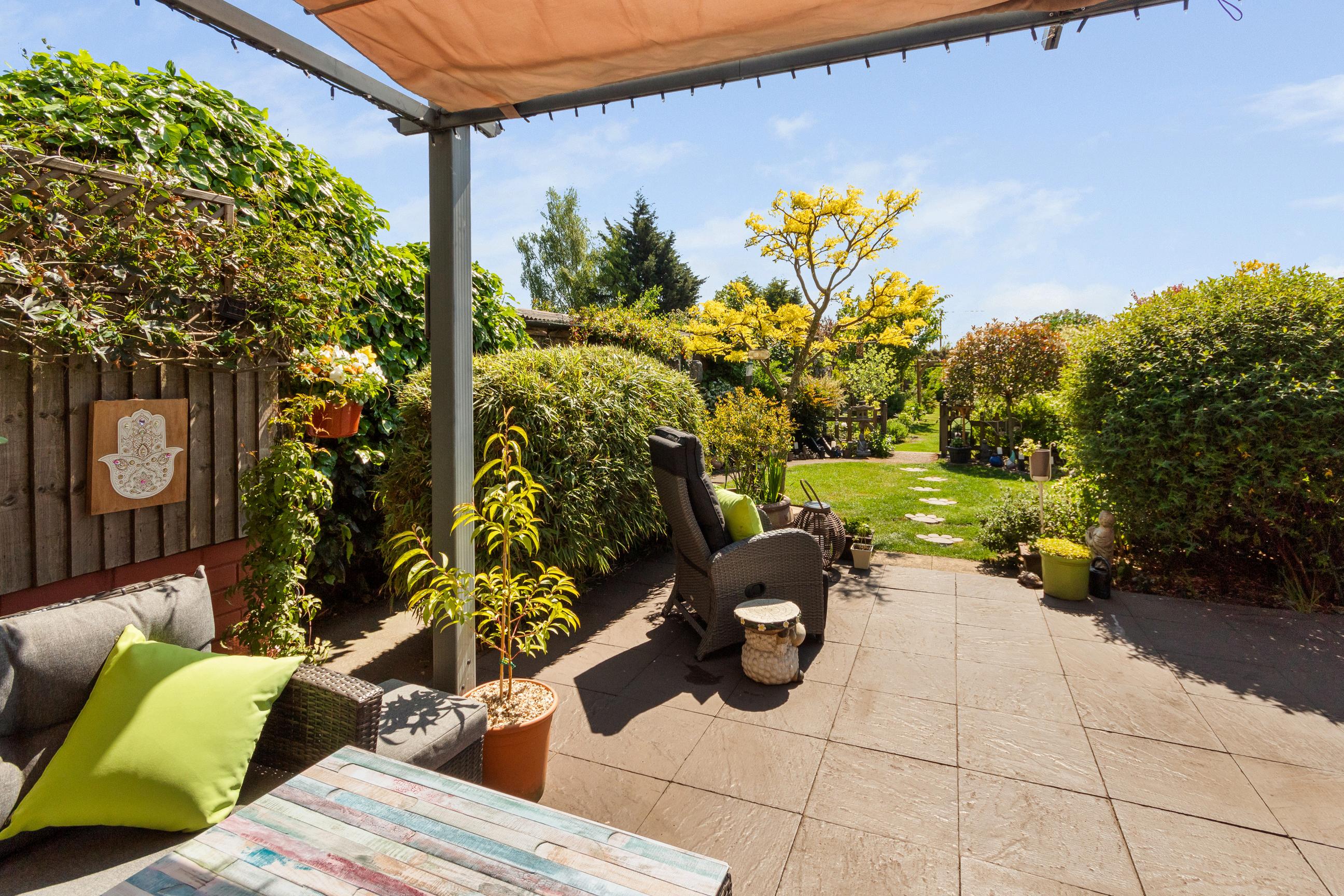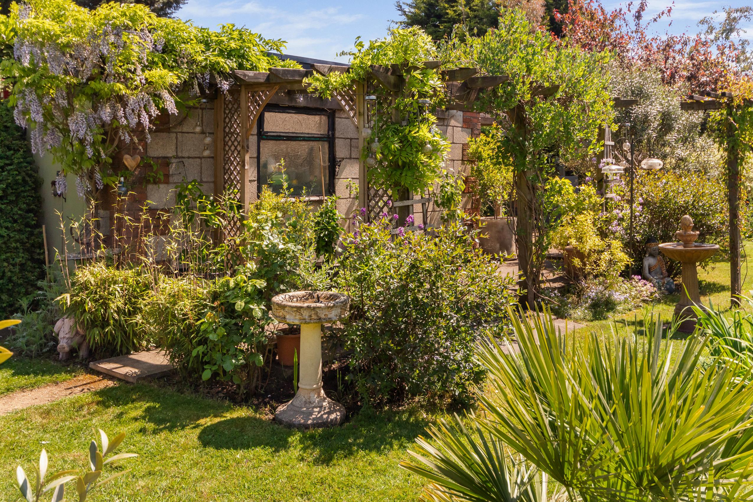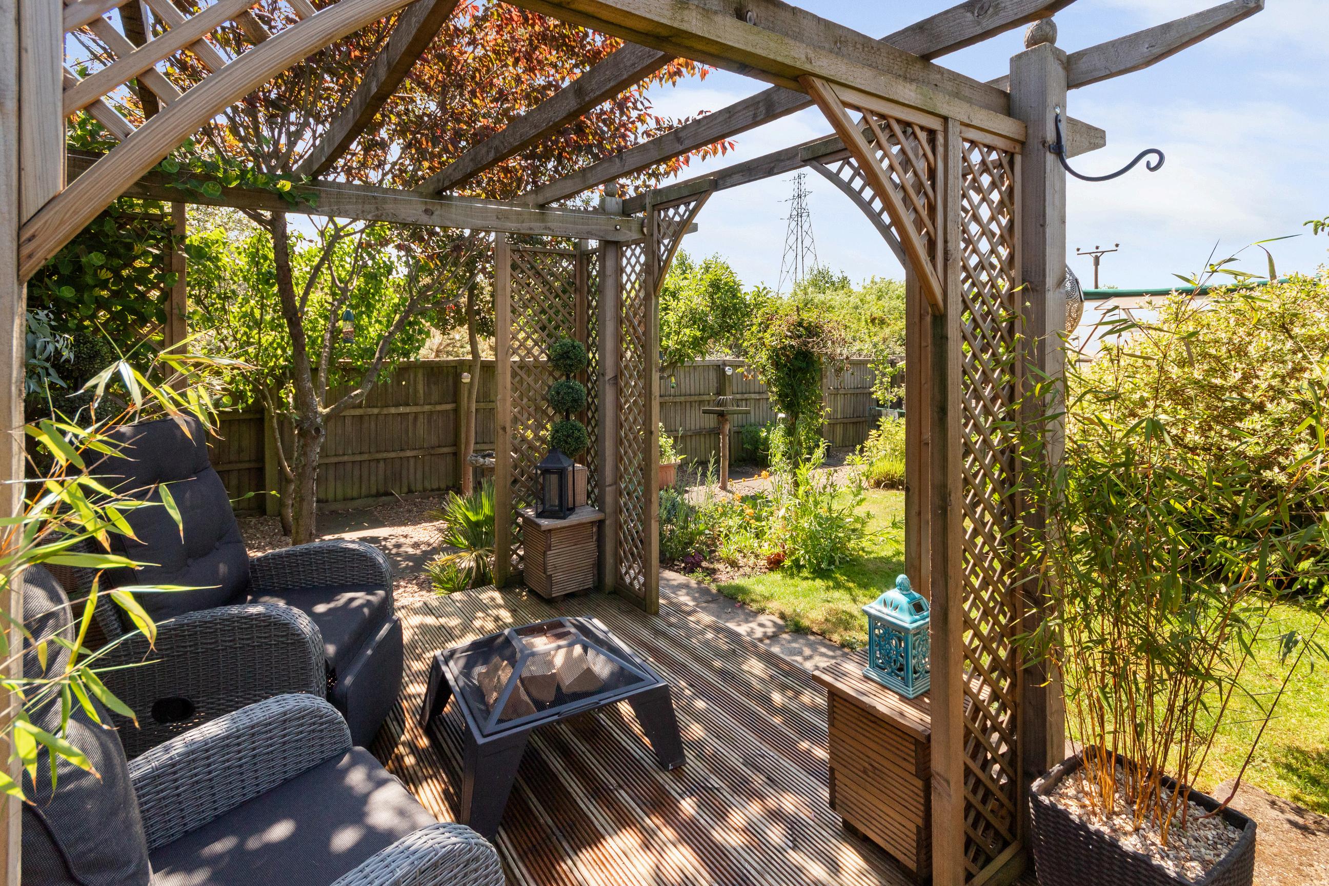 To the rear of the property is an impressive garden, which is a true standout feature. Substantial in size and largely laid to lawn, the space is self-seeding so surprisingly low maintenance, is framed by mature trees, a fishpond, and attractively planted borders, all combining to create a serene and private outdoor retreat. A paved patio offers the perfect spot for al fresco dining and entertaining, while multiple seating areas are thoughtfully placed to enjoy sunshine throughout the day