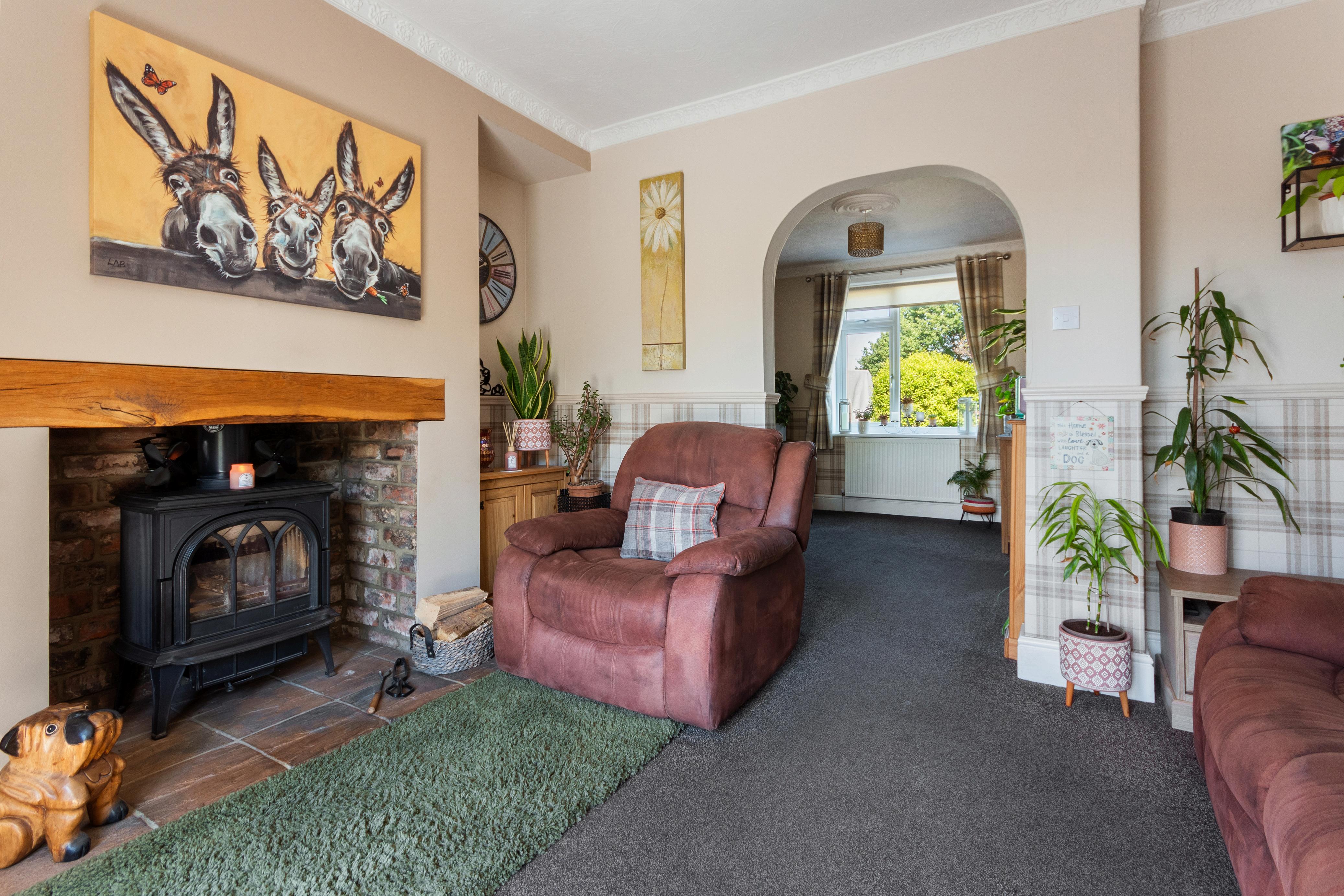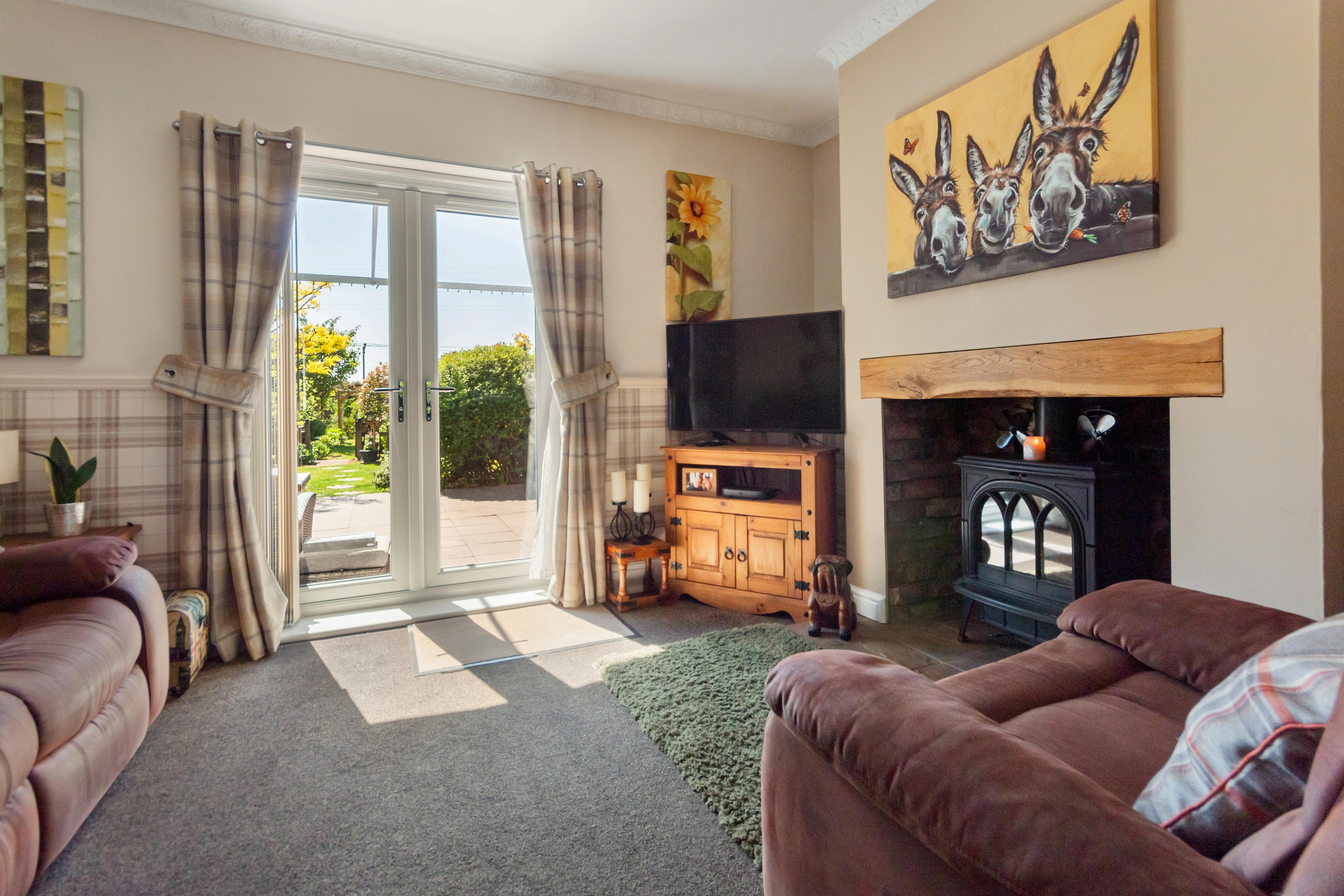 To the front of the property, the dining room offers a bright and formal setting, perfect for family meals or entertaining guests. To the rear, the spacious lounge enjoys a lovely garden outlook and boasts a feature inset brick fireplace with a log burning stove that is complimented with a wooden mantle above, and French doors opening onto the patio, creating a seamless indoor-outdoor connection and a light-filled atmosphere throughout the day.