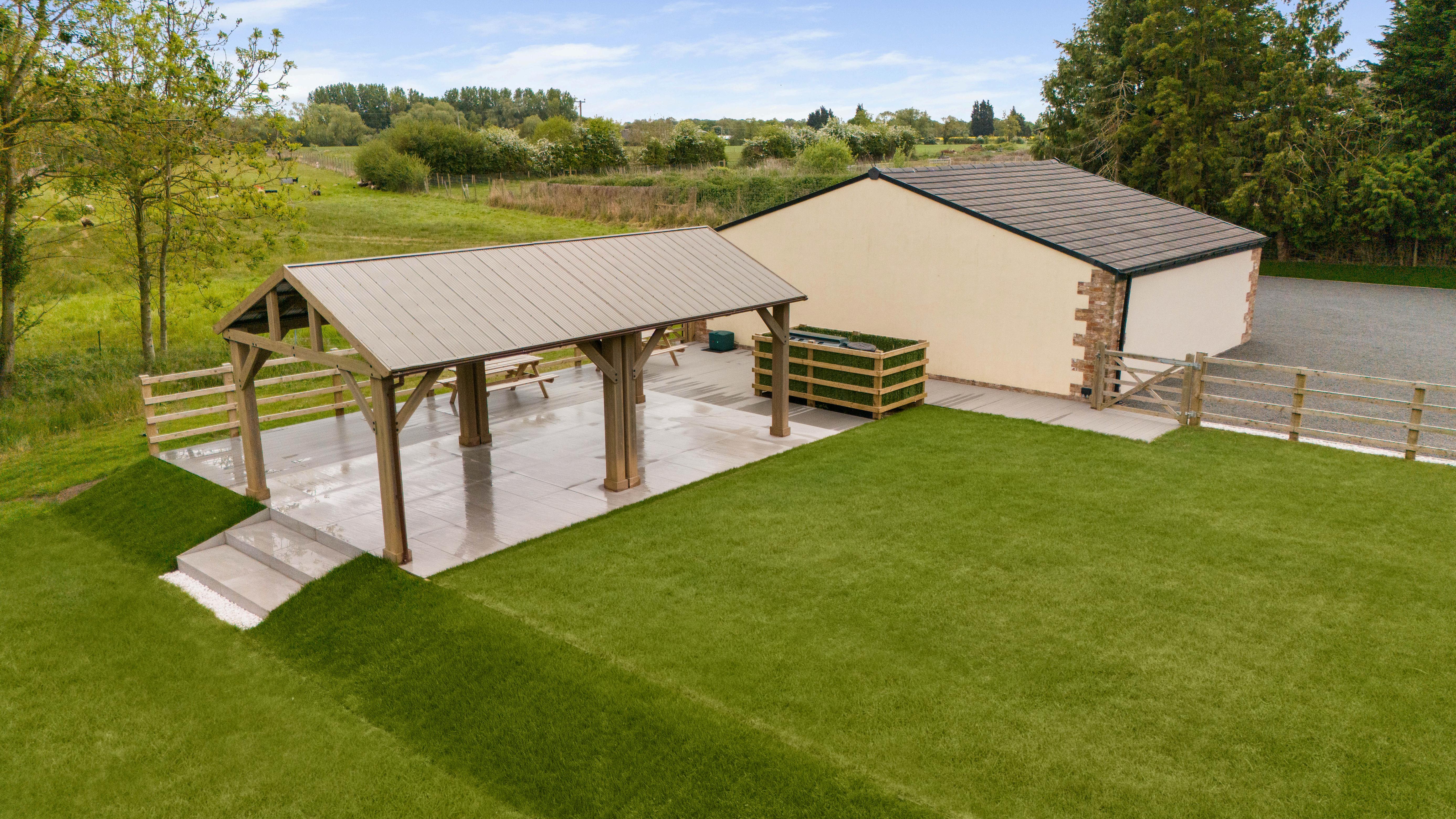 Set within approximately 3.7 acres, the property enjoys an enviable position surrounded by open countryside. Curved boundary walls frame the entrance, where electric gates lead onto a wide gravelled driveway. Expansive lawns, porcelain patios, and matching pathways encircle the house, while a covered barbecue area invites year-round enjoyment of the outdoors. For added practicality, an oversized garage with twin doors is designed to comfortably accommodate two large vehicles and is equipped with EV charging point.