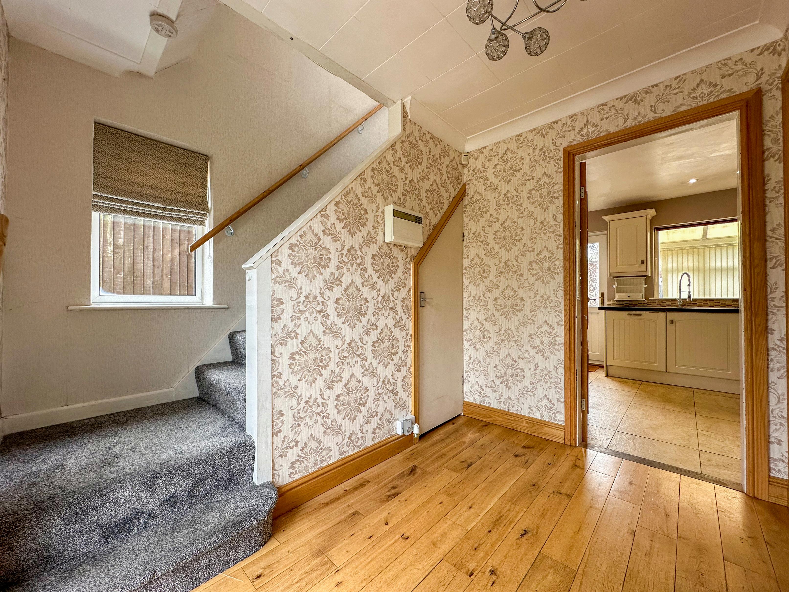 Stepping inside this welcoming entrance hallway you are greeted with a dog-leg staircase leading to the first-floor landing with a storage cupboard below and opens up into the warm and welcoming dual aspect living room that boasts a decorative cast-iron feature fireplace Leading from the living room through a set of French doors is the adjoining conservatory that offers lovely views of the rear garden.