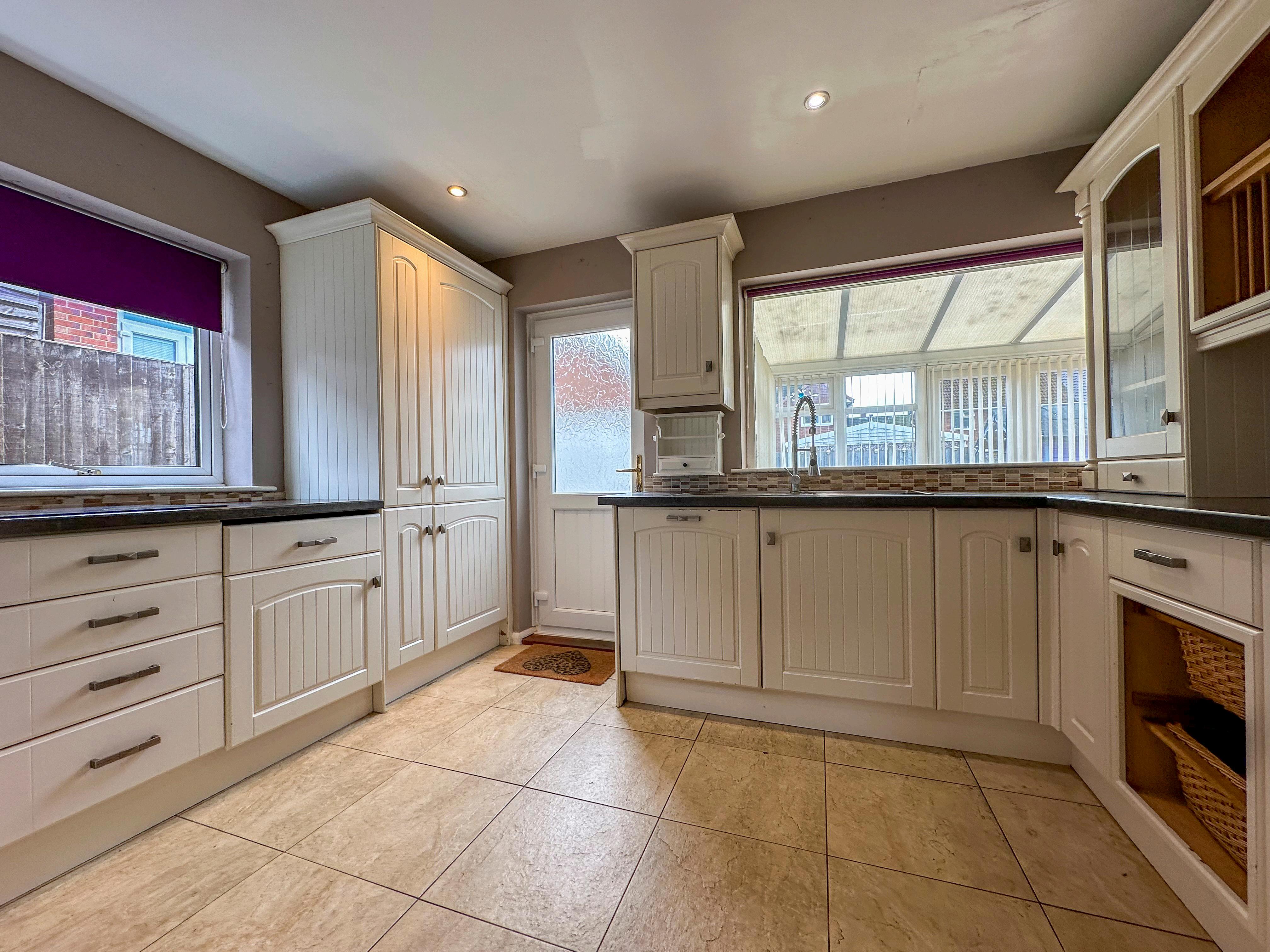 Leading off the central hallway is the well-designed kitchen that is complimented with shaker style fitted cabinets and a built-in double oven and induction hob, an integrated dishwasher and fridge/freezer with a uPVC door leading to the rear garden.