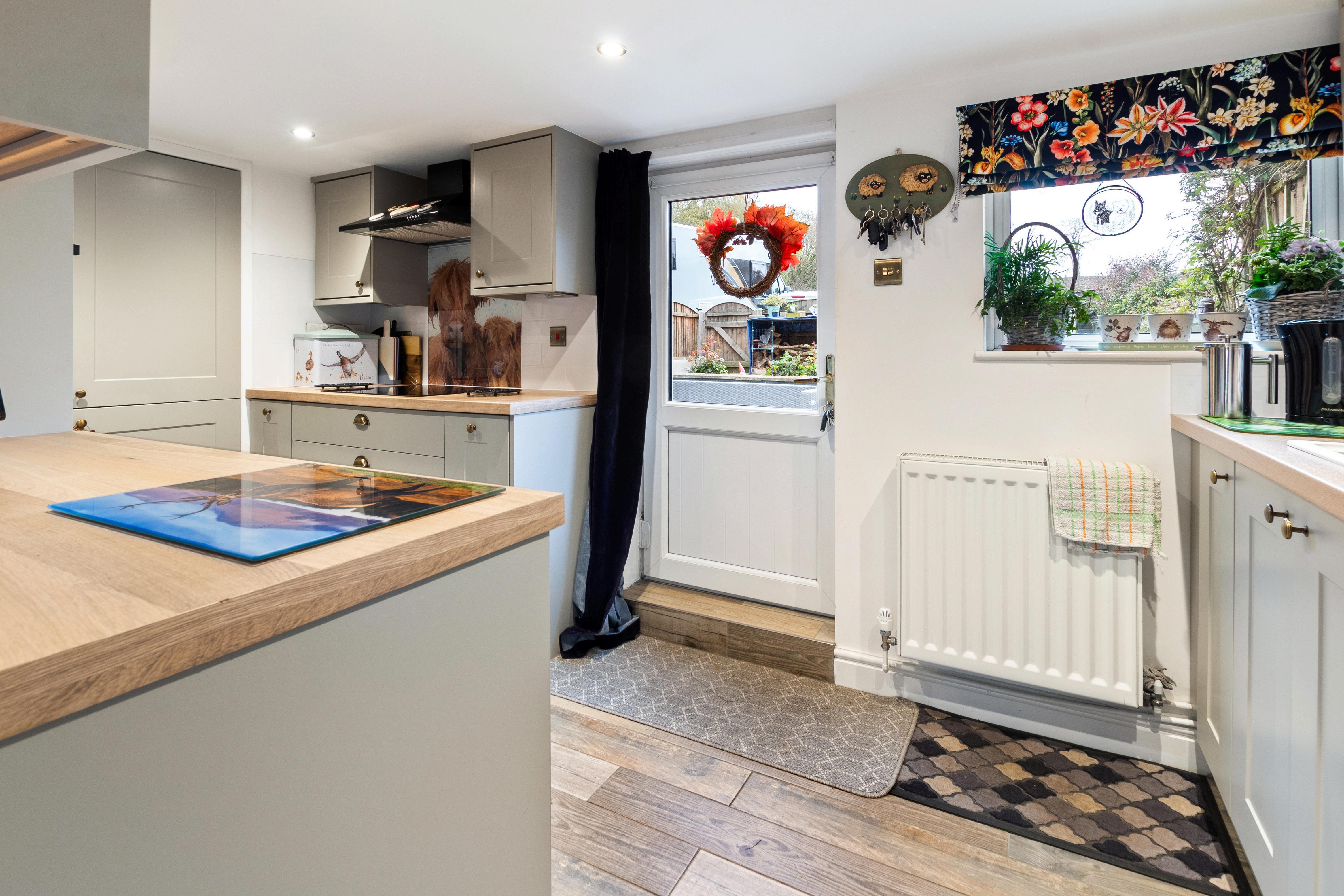 Upon entering through the rear of the property, you’ll be greeted by a newly fitted, stylish kitchen featuring integrated appliances and plenty of cupboard space. The kitchen leads through to two welcoming reception rooms, each showcasing characterful beamed ceilings and wood-burning stoves, perfect for cosying up during colder months. Additionally, the ground floor features a sleek and contemporary shower room, complete with a generously sized walk-in shower, adding modern luxury to the traditional charm of the cottage