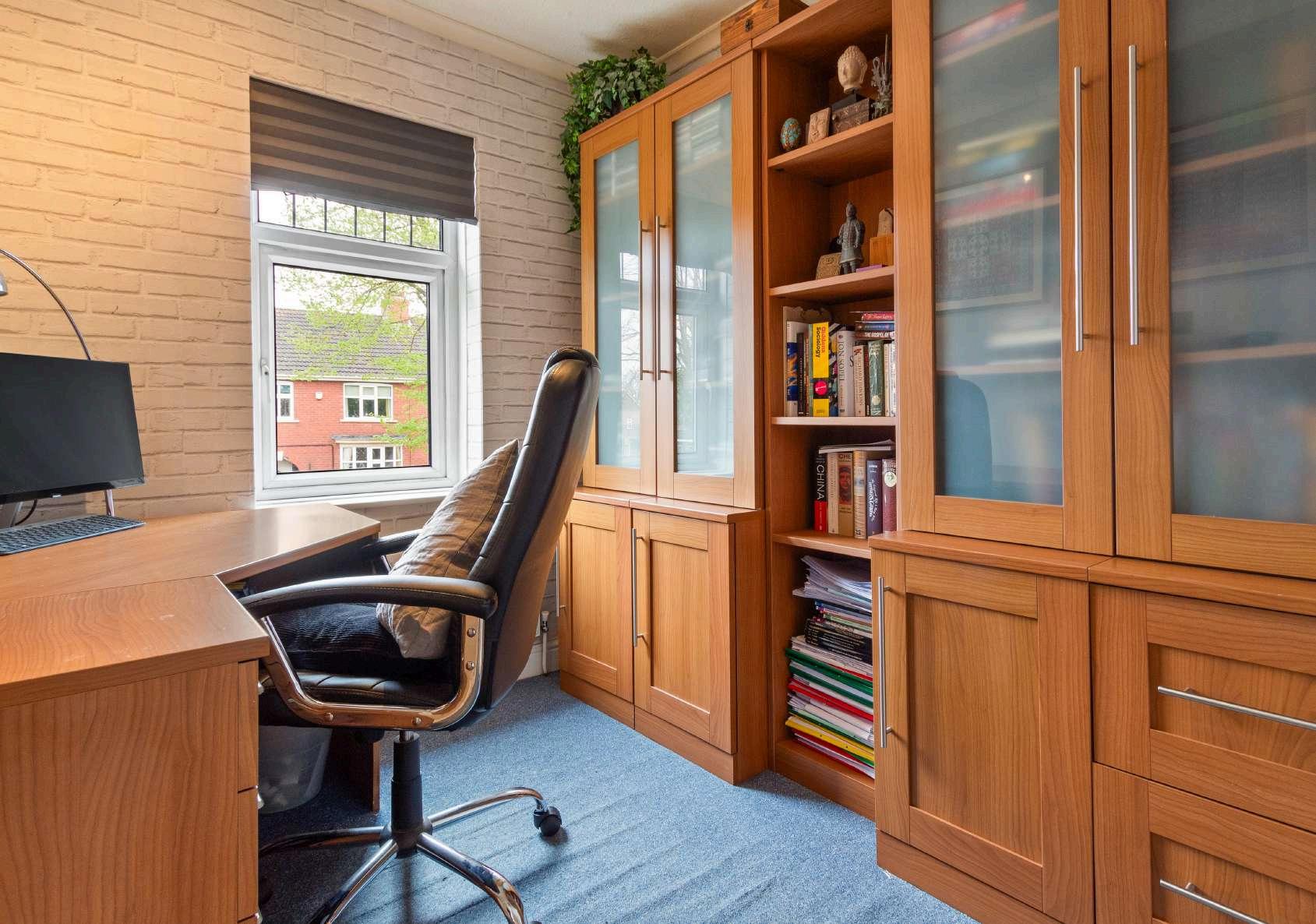 Upstairs, the first floor boasts three well-proportioned bedrooms, including a generous master bedroom to the rear that boasts fitted wardrobes, a second double bedroom to the front aspect that also boasts fitted wardrobes, and a third single bedroom that is currently utilised as a study. The family bathroom is sleek and functional, providing a three-piece suite, with a bath that is complimented with a shower above, a hand wash basin and a W.C.