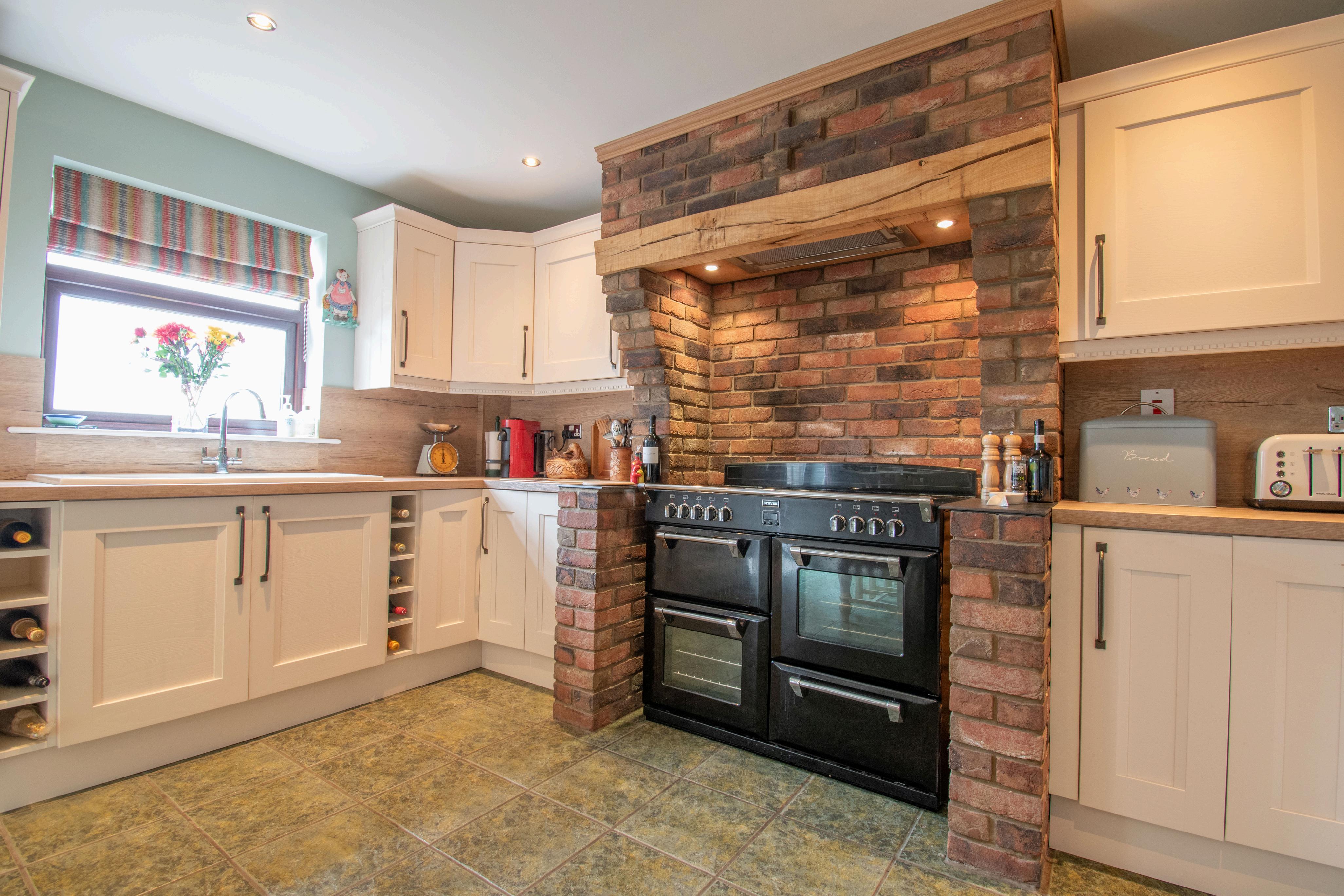 The kitchen is fitted with cream shaker-style cabinets and includes a Stoves cooker. The room comfortably accommodates a family dining table, and French doors offer a delightful garden view. A practical, fitted utility room provides space forwashingappliancesandhasanentrancetothesideofthehouse.