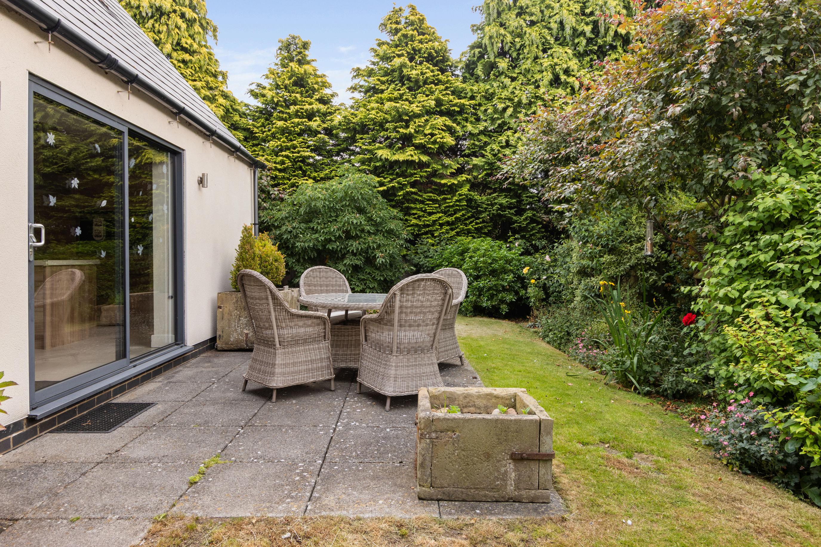 Externally, the home sits on a private, secluded plot with mature trees and shrubs bordering the garden. A shared access road leads to ample off-road parking and a garage with an electric roller door, cleverly adapted to include a rear home office or hobby room.