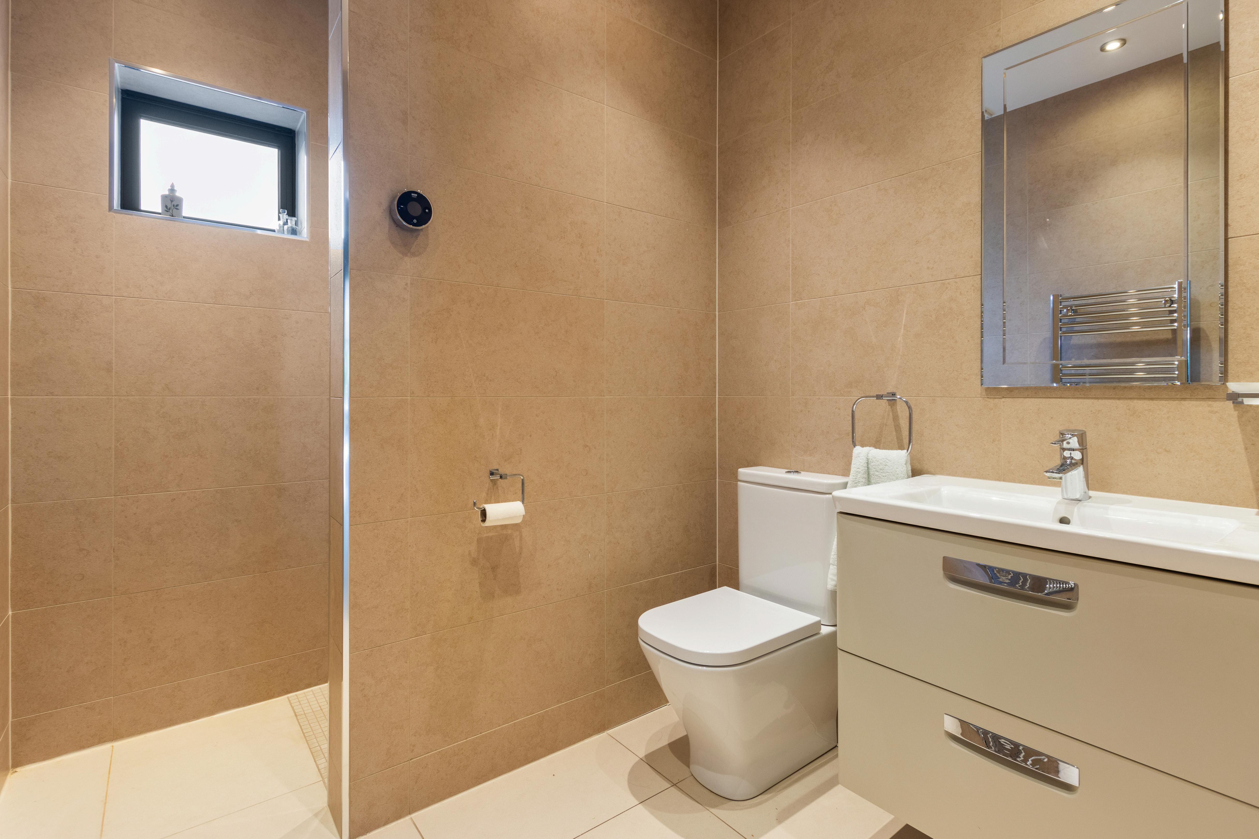 The master bedroom offers built-in wardrobes and a stylish en-suite shower room, while the second generous double bedroom also benefits from fitted storage. A fully tiled, contemporary shower room with walk-in shower completes the immaculate interior.
