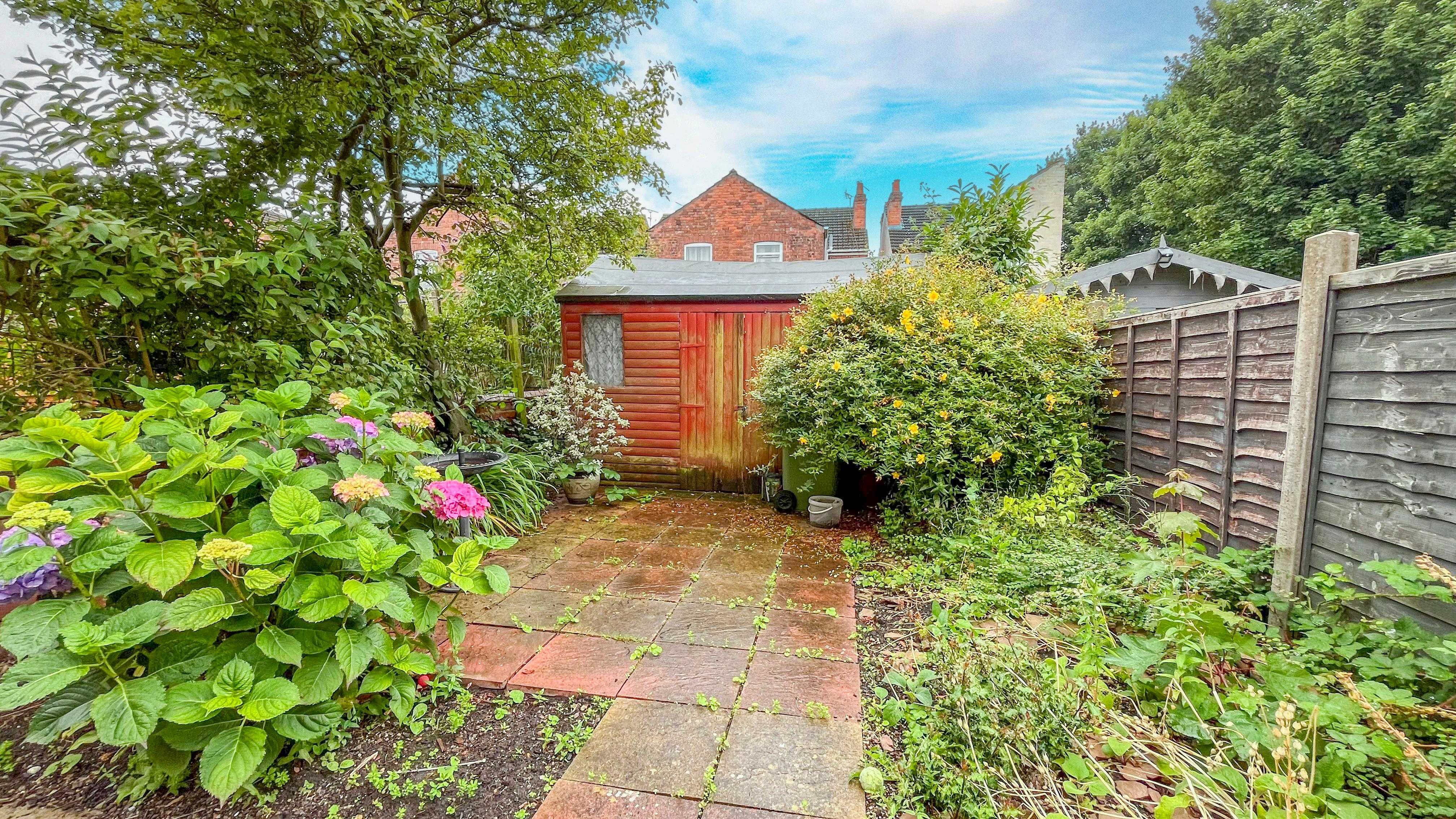 Outside, the front of the property features a low-maintenance walled buffer garden with a shared access pathway leading to the rear garden. The fully enclosed rear garden offers two outhouses, a courtyard, a paved patio area for low maintenance, planted borders, and a spacious timber garden shed.