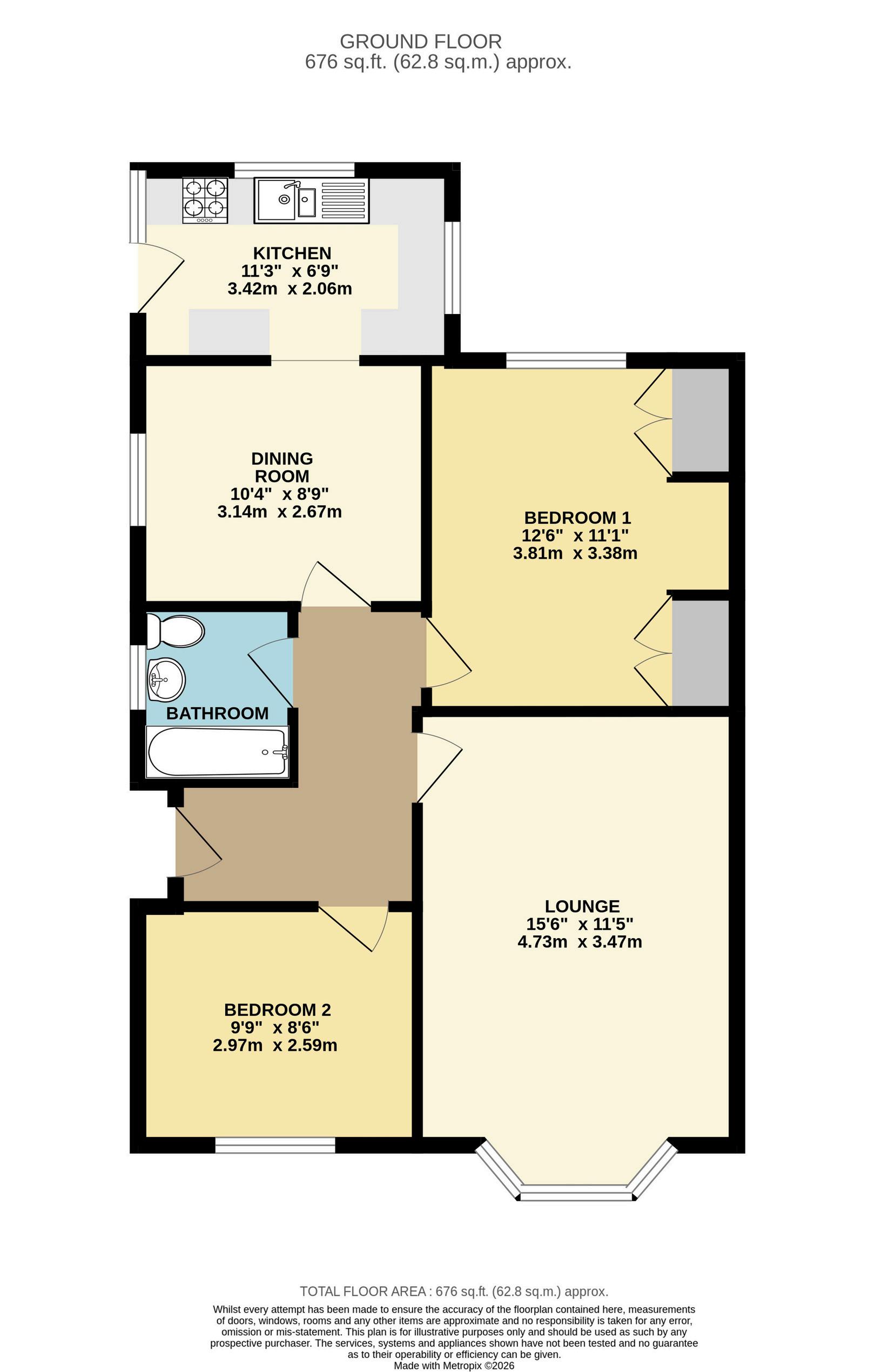 A side entrance hall provides access to all rooms, giving the property a practical and easyflowing layout. To the front sits a comfortable lounge featuring a bay window that brings in plenty of natural light. There is a small double bedroom at the front of the bungalow, while the main double bedroom is positioned at the rear and benefits from built-in wardrobes.