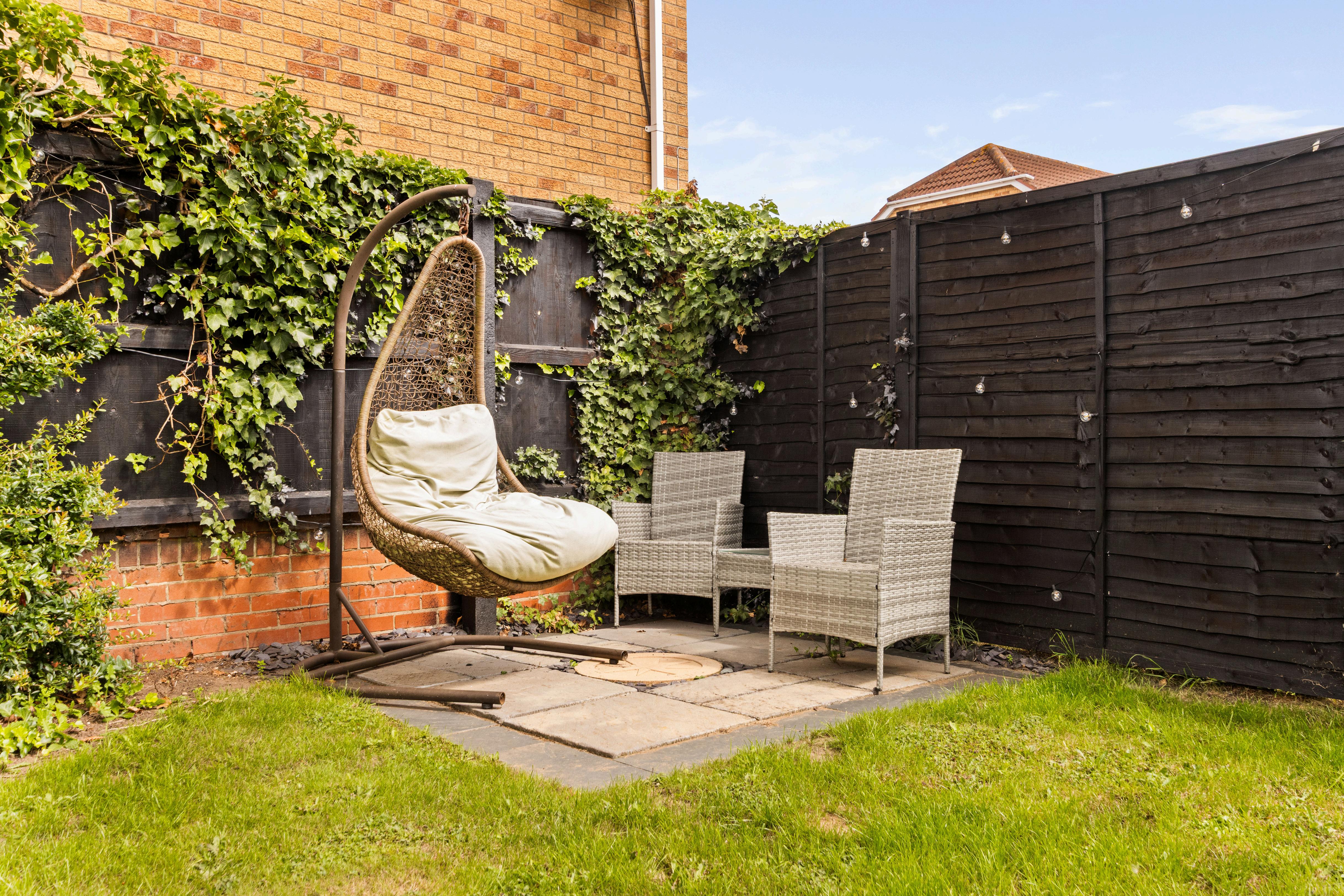 Outside, the residence impresses with a neatly landscaped front garden complemented by a driveway extending alongside the house to a gated rear garden. The rear garden, enclosed by fencing, offers a serene retreat with a lawn and patio area, perfect for outdoor gatherings or peaceful relaxation.