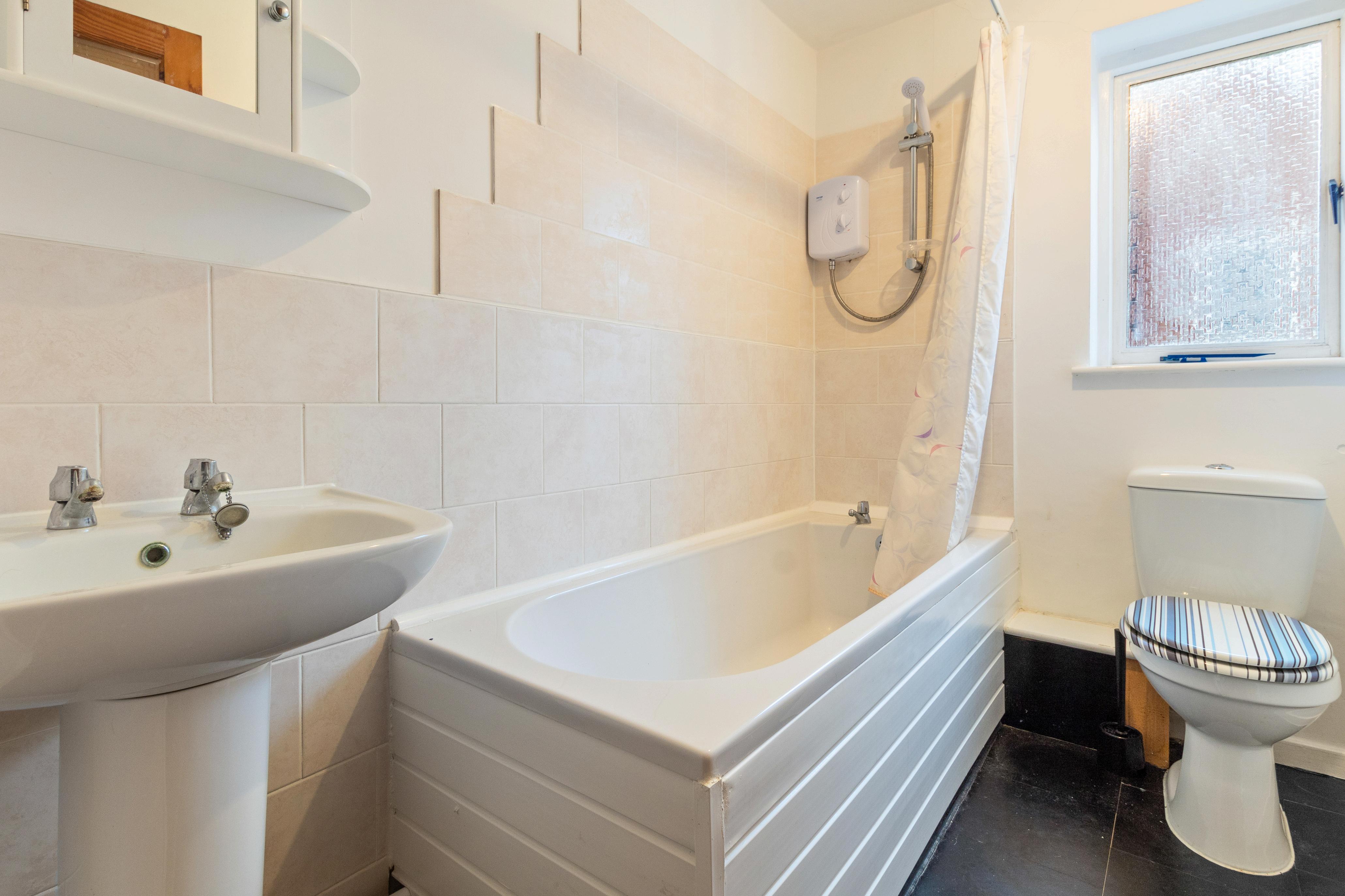 The first floor boasts two spacious double bedrooms, providing ample space for comfort and relaxation. Both bedrooms are served by a well-appointed family bathroom, which is partially tiled for a modern look. The bathroom features a white three-piece suite, including a bath with an over-bath shower, a hand wash basin, and a low-level flush W.C., ensuring all your needs are met with style and convenience.