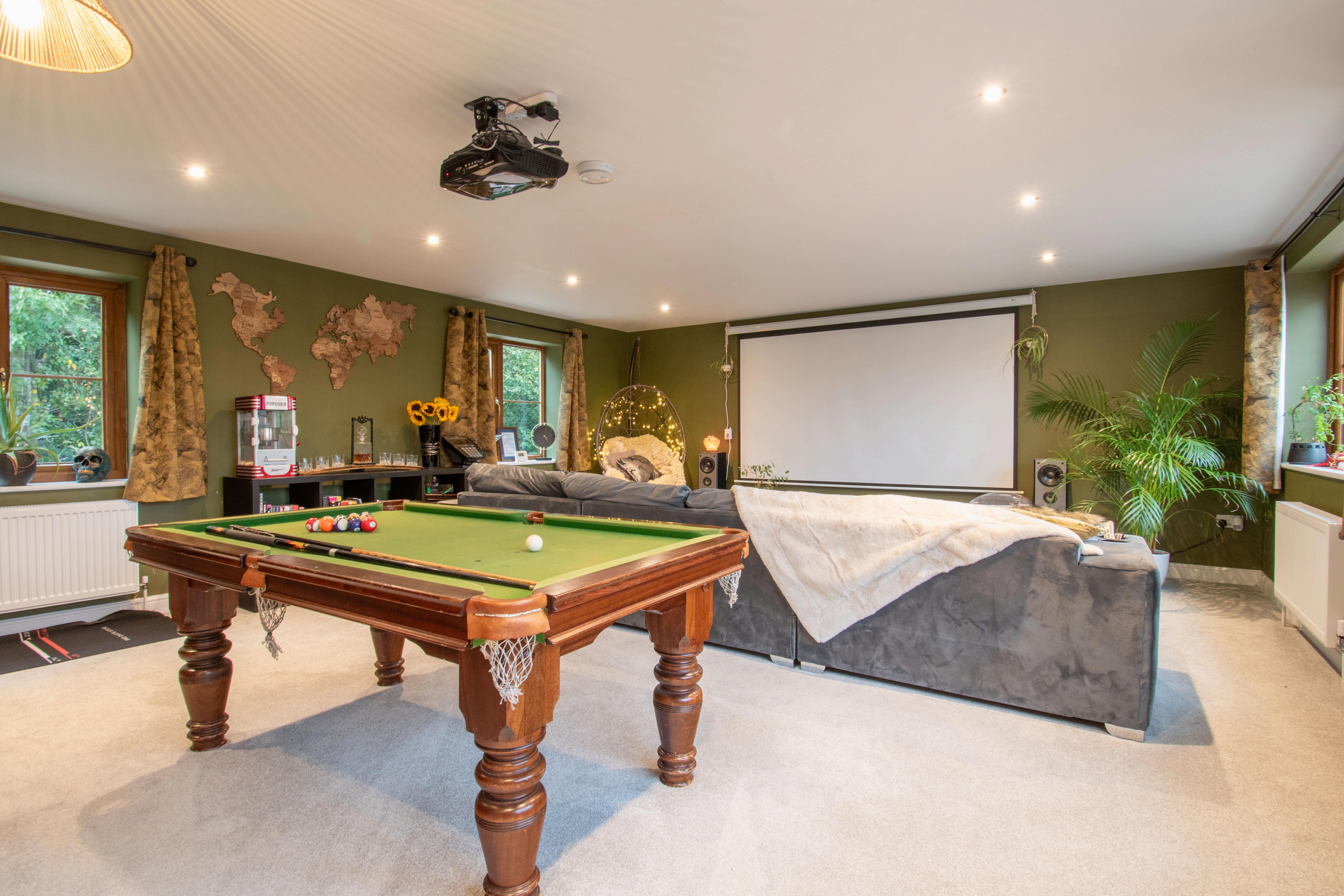 The entrance hall provides access to two distinct areas: one leading to the main house and the other to the games room. The owners have crafted an impressive, versatile space in the games room. It features a seating area that doubles as a cinema, complete with a projector screen ideal for family movie nights. Additionally, this space integrates seamlessly with the expansive entertaining and gaming areas within the room. A spindled staircase leads to a versatile home office, which can also serve as a fifth bedroom for guests. This twostory wing presents an excellent opportunity for conversion into a self-contained or semi-contained annex, ideal for accommodating an extended family.