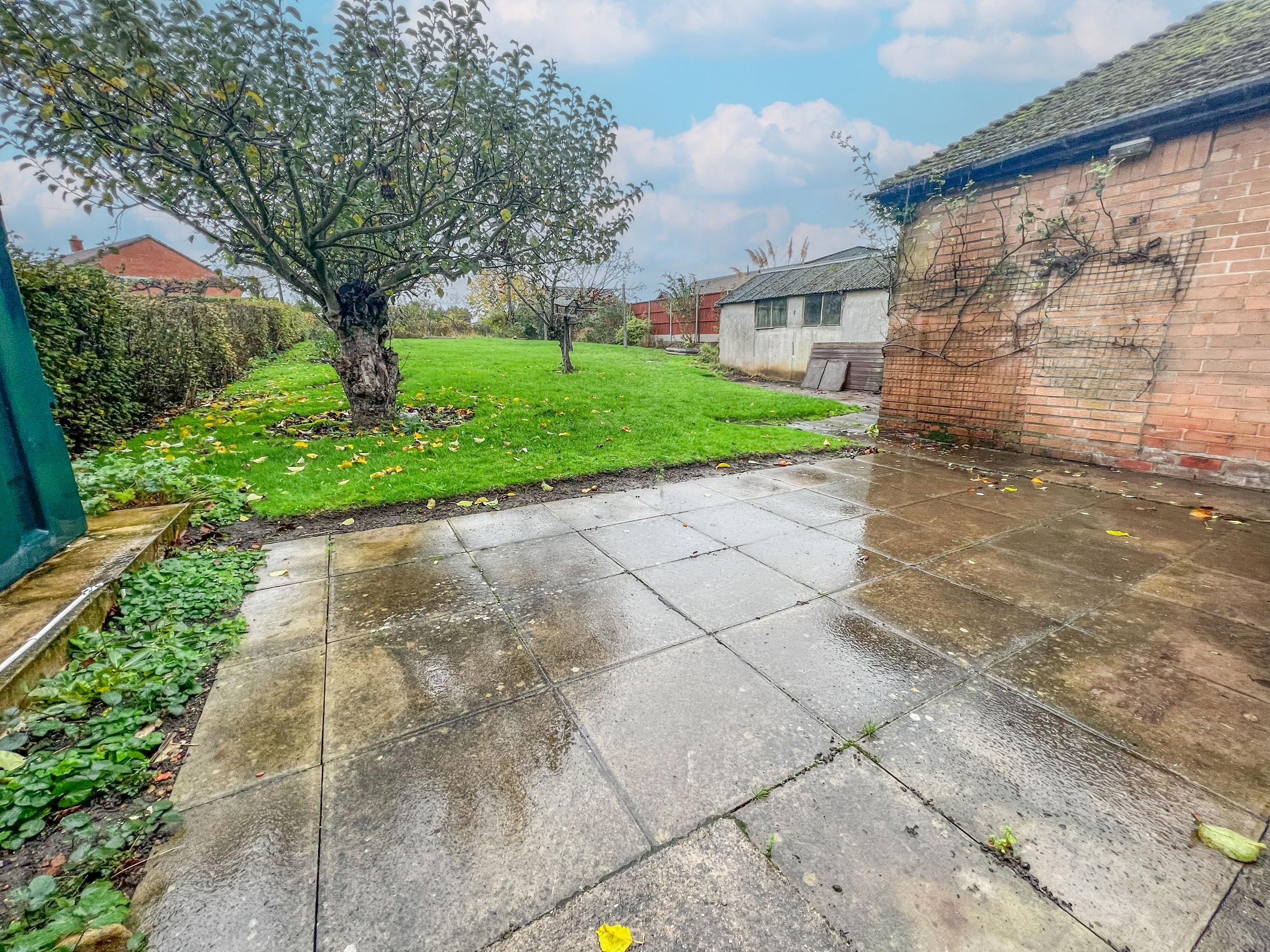 Rear garden being mainly laid to lawn with multiple trees and shrubs, paved patio area ideal for entertaining in the summer months and ramped access to the back door.