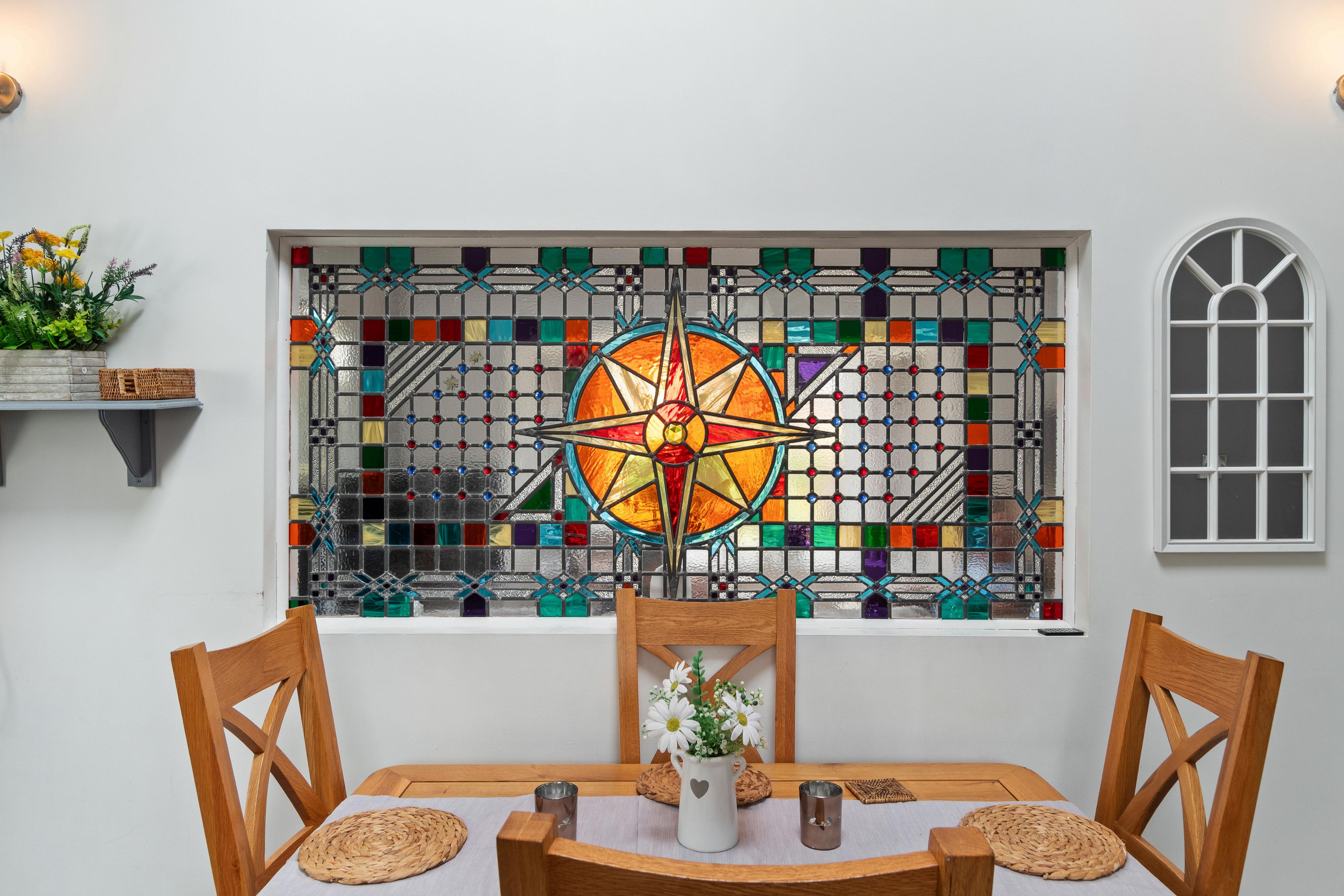 Step inside and be greeted by a welcoming entrance hallway, complete with built-in storage and elegant wood flooring. This space seamlessly connects you to the rest of the property. The stylish lounge boasts a vaulted ceiling and a bay window that floods the room with natural light. A stove fire adds warmth and character, perfect for those cosy evenings. A unique stained-glass window separates the lounge from the kitchen/diner, which also features a vaulted ceiling, ample shaker-style units, tiled flooring, a stable-style side exit door, and space for a dining table. Both double bedrooms offer generous space, with the master bedroom featuring a charming front-facing bay window. The modern family shower room is fully tiled, offering a walk-in shower, a vanity sink and WC unit with built-in storage.