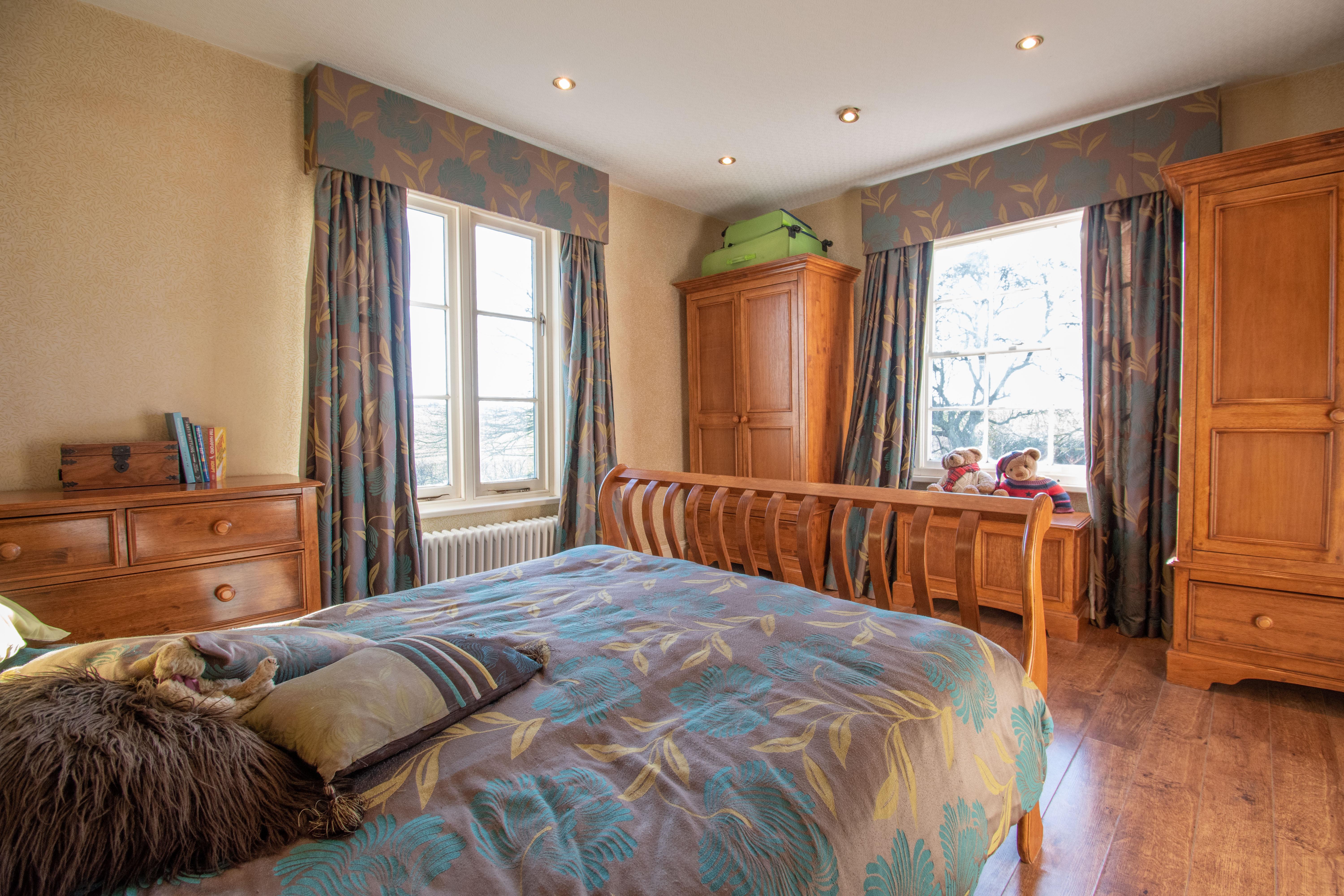 The return staircase leads to a landing with window which is flanked by two large double bedrooms which would have originally been the formal side of the house. Steps lead to a lower-level landing with airing cupboard and to the contemporary styled family bathroom with four-piece suite which includes a whirlpool style bath. Completing the first floor is a third good-sized double bedroom