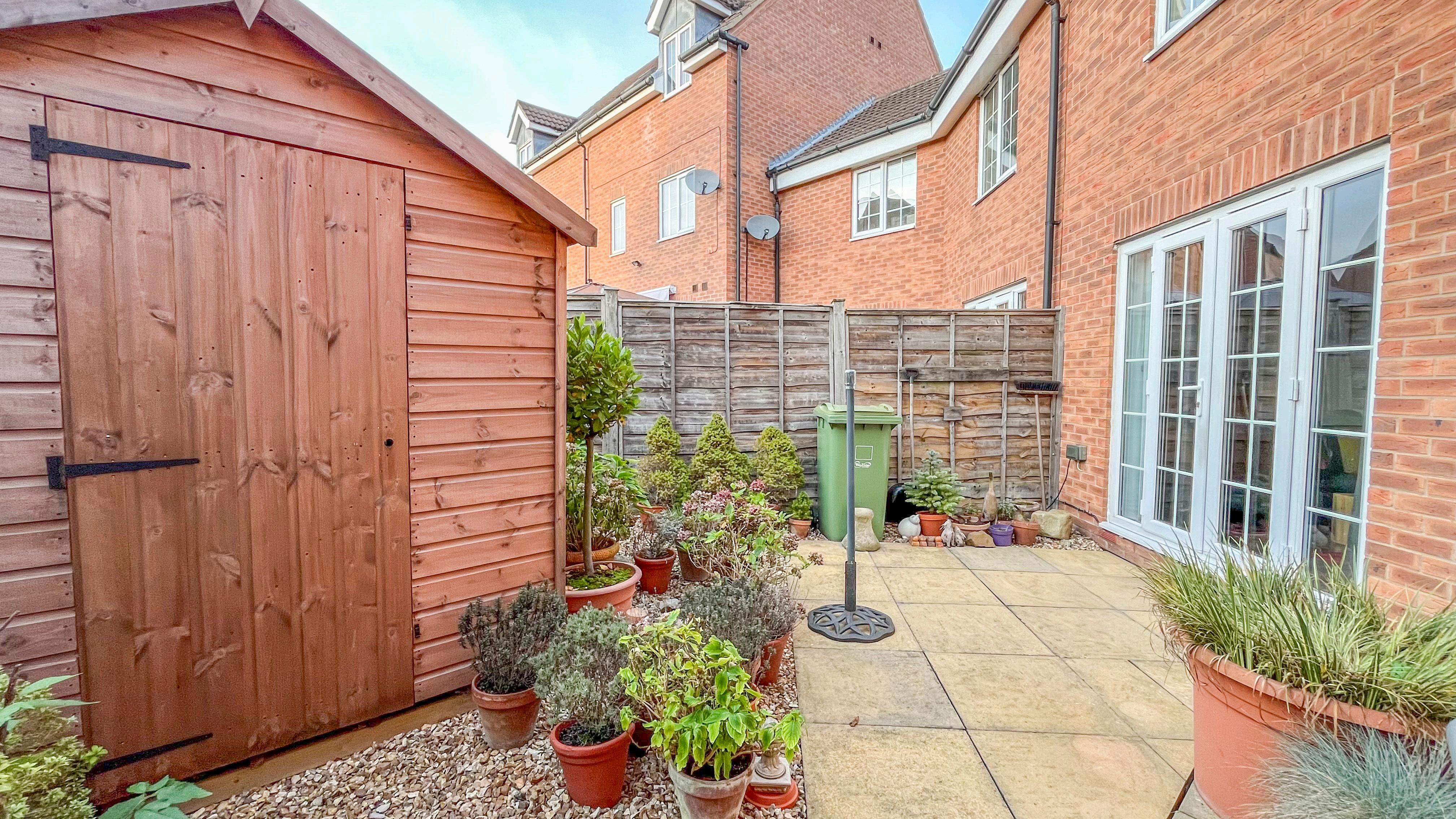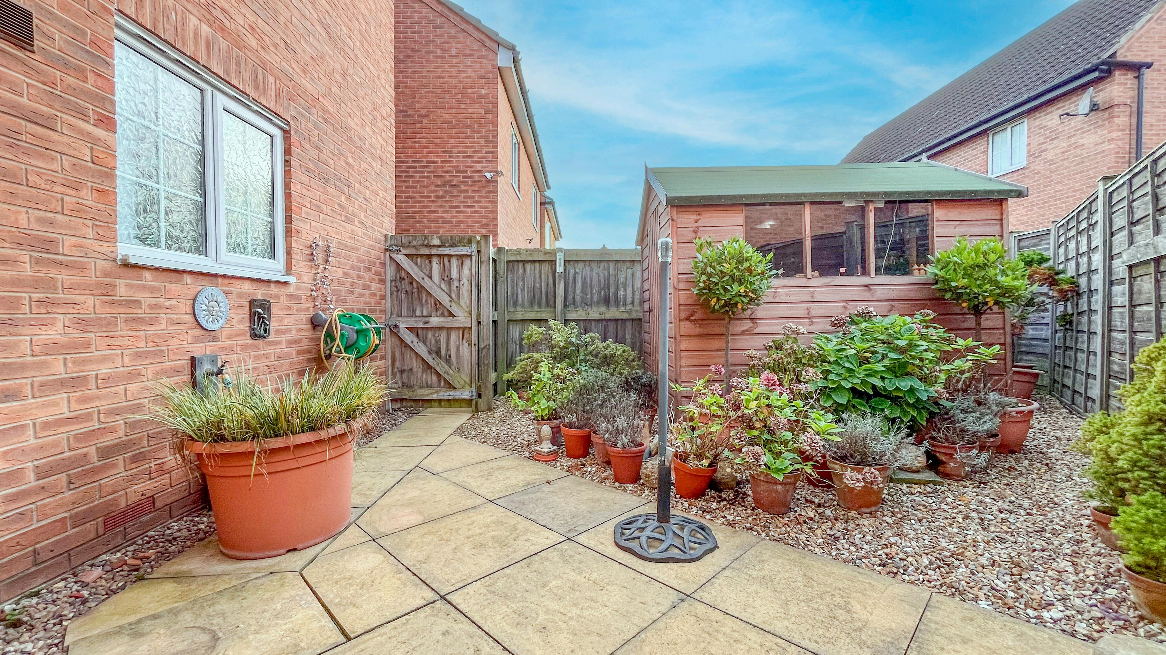 The property benefits from an allocated parking space to the rear and a charming rear garden. The low-maintenance garden features a mix of paving and pebbles, a timber shed, and a gated pathway leading to the parking area.