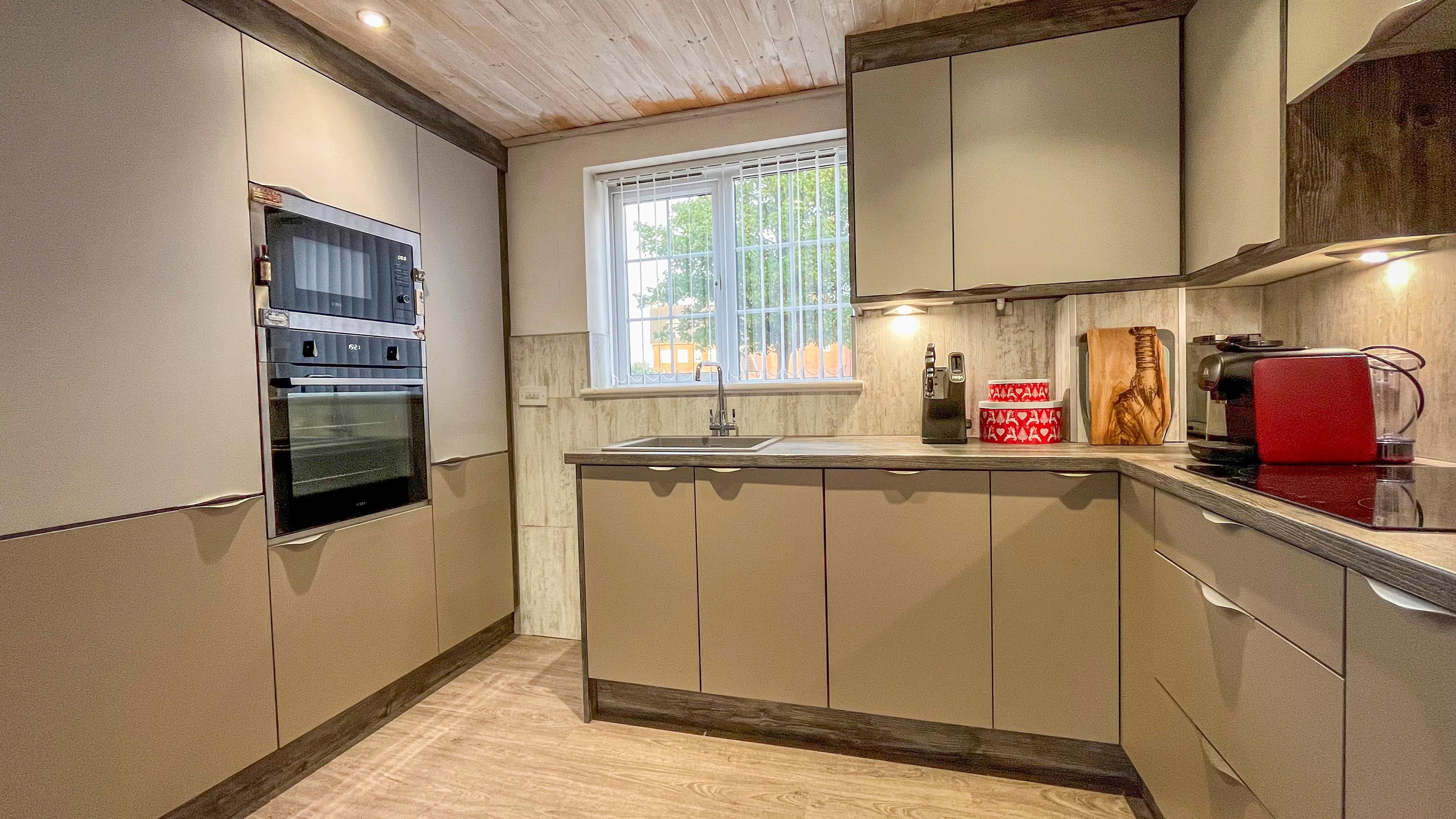 The kitchen is both stylish and functional, equipped with contemporary wall and base units, a complementary countertop, and built-in appliances, including an oven, hob, fridge, and freezer. A front-aspect window above the sink adds a bright and airy feel to the space.