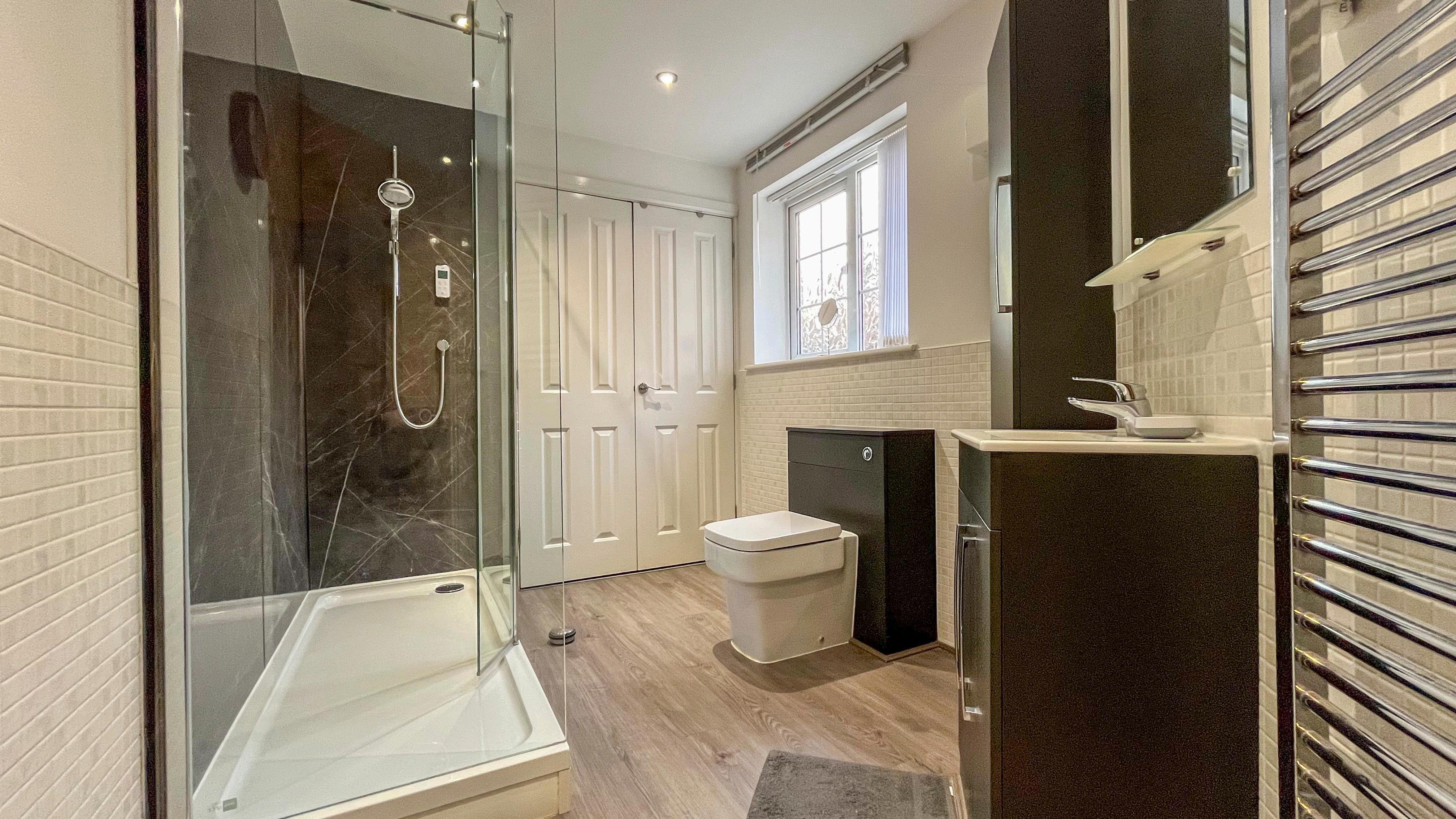 The modern shower room is finished to a high standard, featuring a vanity sink unit, low-flush WC, and a spacious walk-in shower with remote controls. Adjacent to the shower room is a handy storage/utility cupboard with space for white goods.
