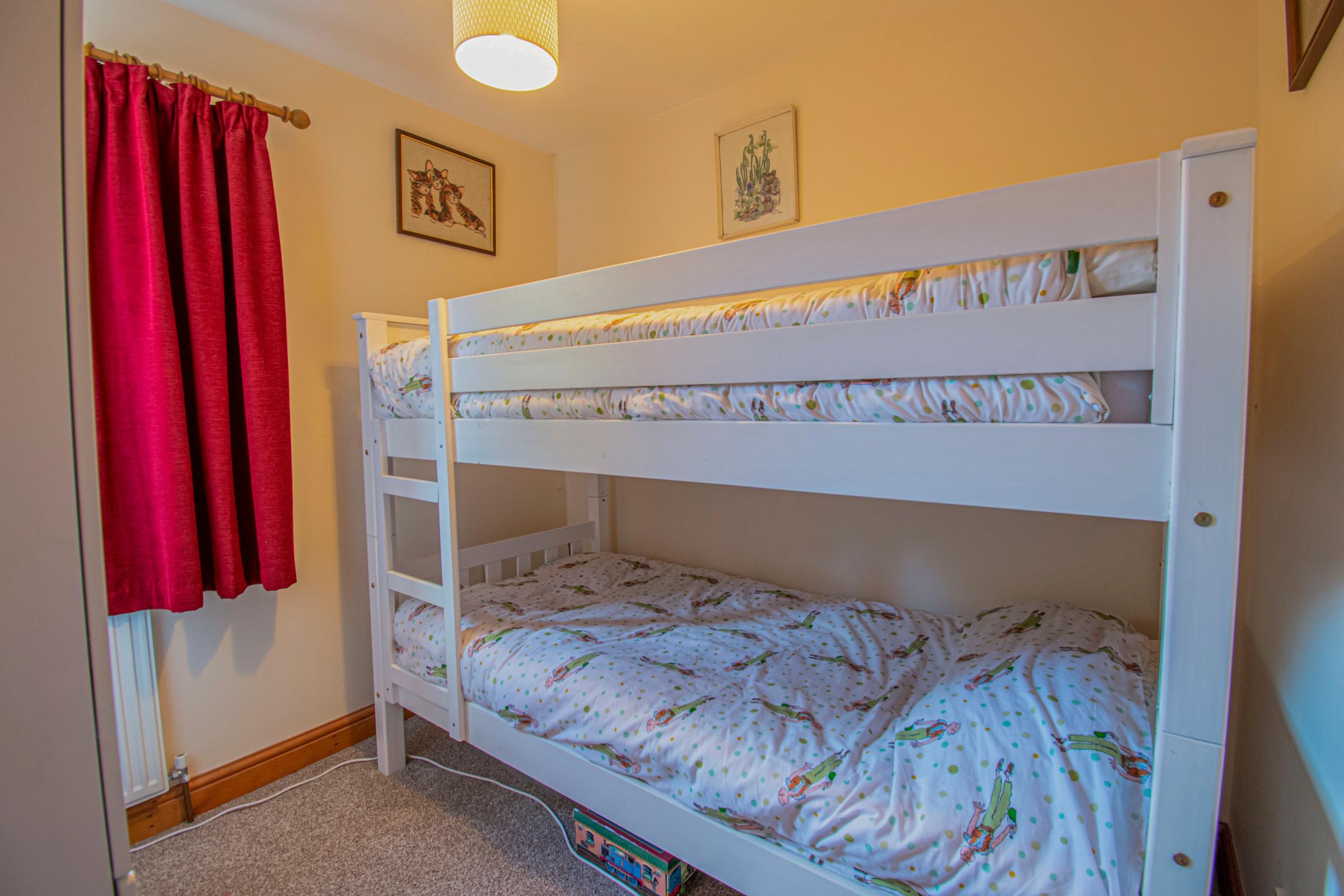 The excellent sized garden is landscaped with established boundaries and an array of small trees which include a fenced area which was used as a vegetable garden with chicken coup. To the rear of the garden is a small woodland area with a children’s play space within.