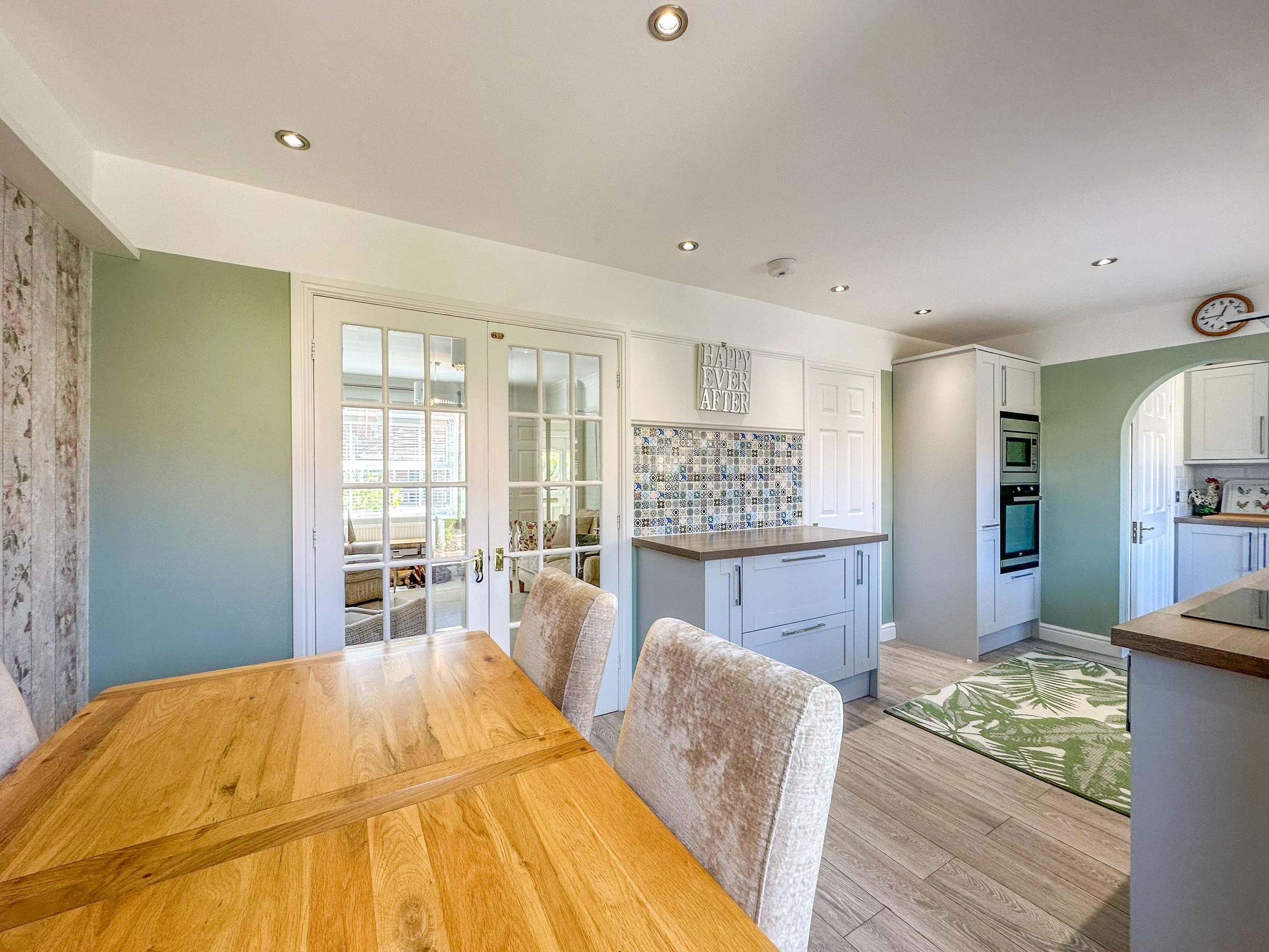 Step Inside A welcoming hallway with stairs leading to the first floor leads into the spacious lounge with a walk-in bay window and French doors leading to the modern fitted kitchen/diner with built-in oven and hob, integrated appliances to include a dishwasher, fridge freezer and microwave, a porcelain sink, a handy pantry, and patio doors leading to the enclosed walled rear garden. Accessed through an attractive archway is the utility room and a handy downstairs cloakroom.