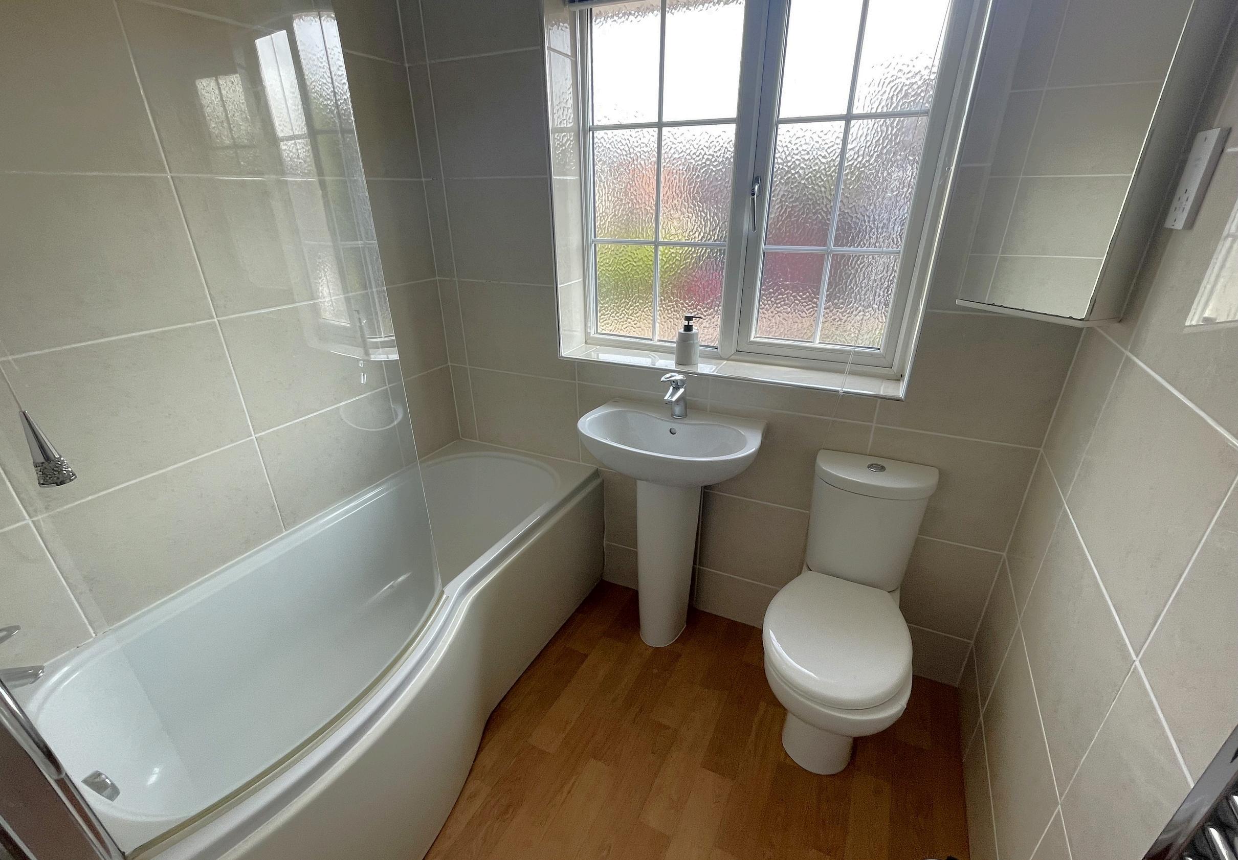The first floor accommodates three good-sized bedrooms, each offering comfortable living space. The modern family bathroom is stylishly finished with contemporary fixtures, including a curved bathtub with an overhead shower, a sleek sink unit, and a toilet, all complemented by attractive tiling and natural light from the frosted window.