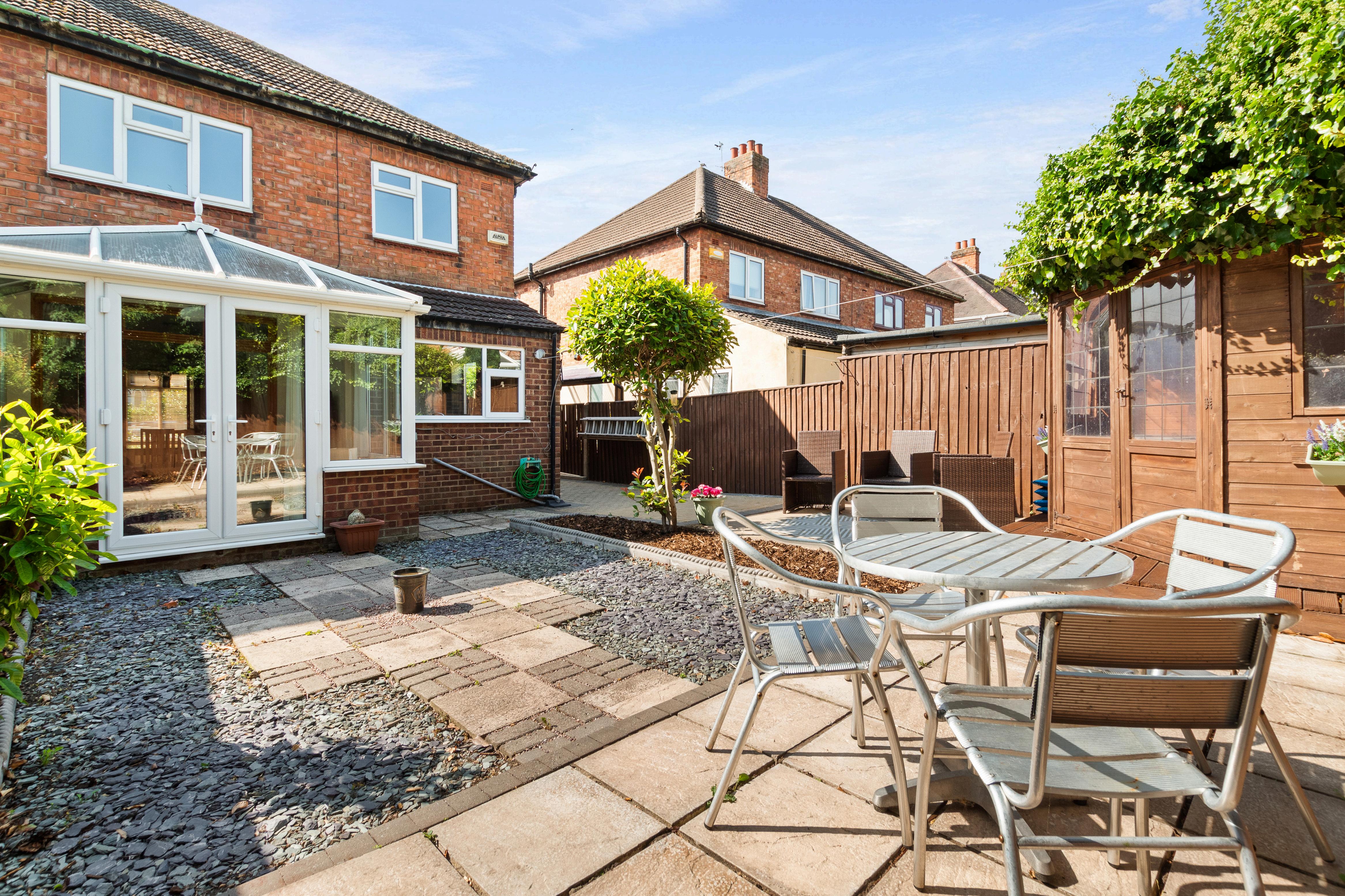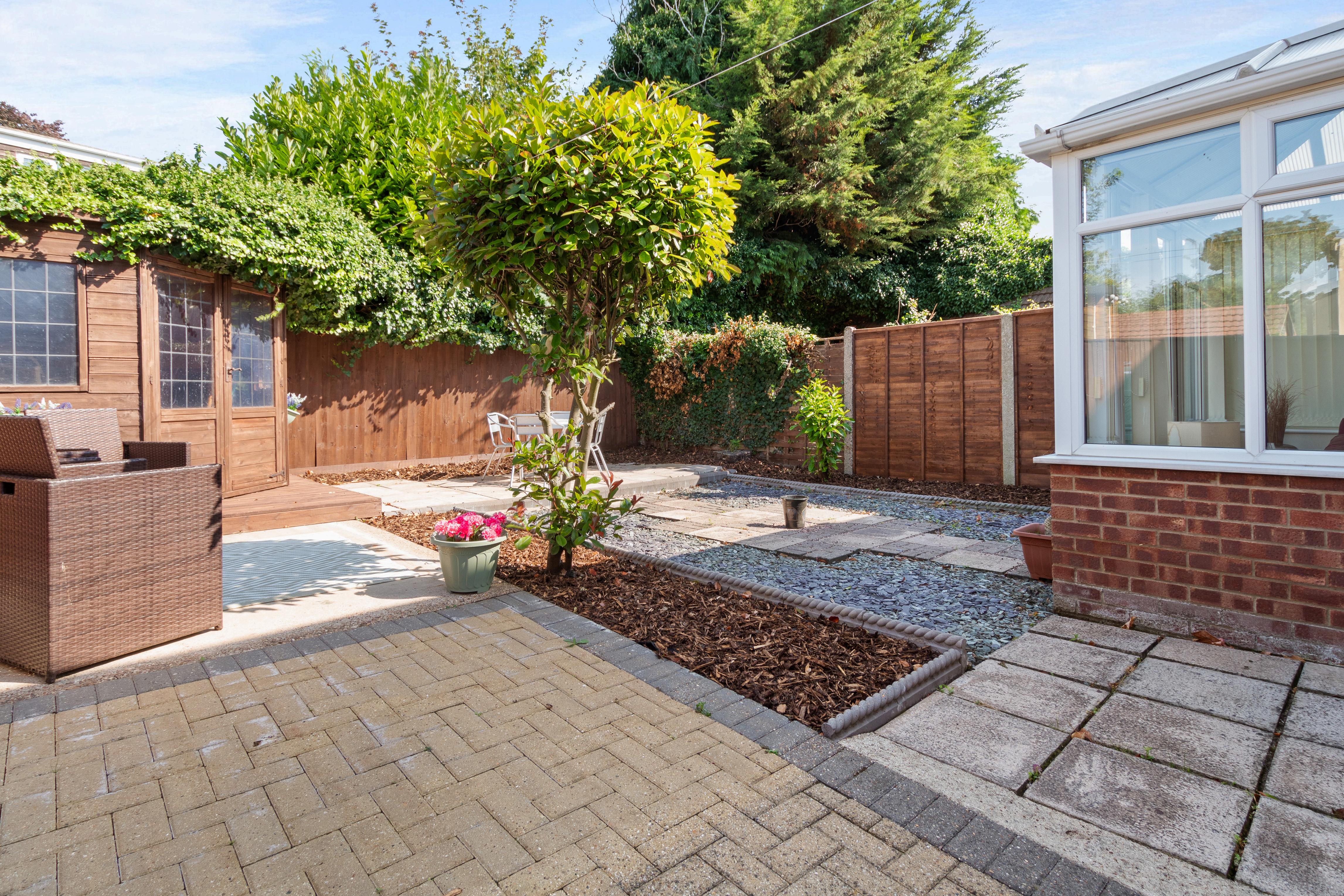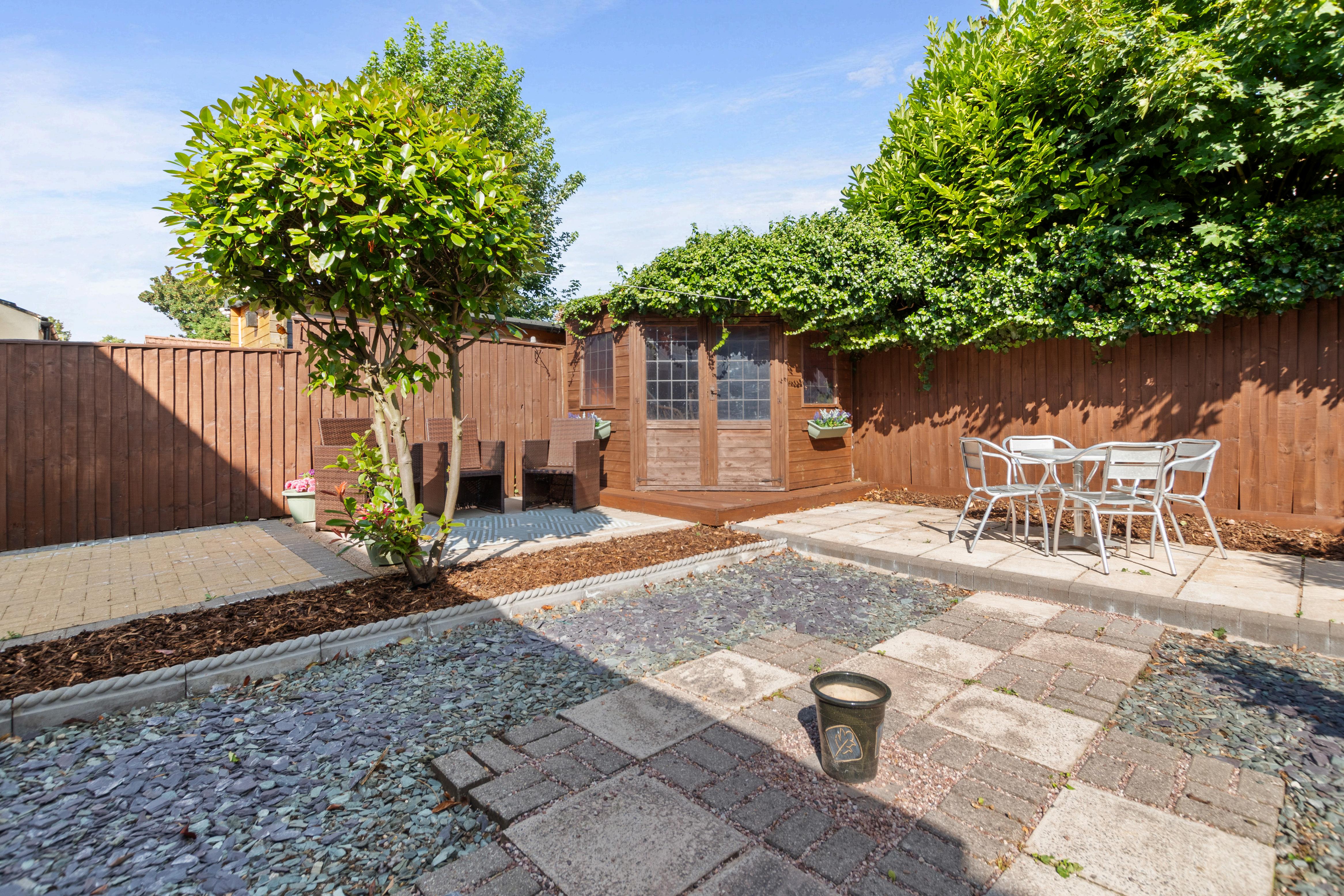 Private Rear Garden: The property boasts a secure, low-maintenance rear garden, featuring a charming corner summer house/shed, a patio area ideal for outdoor dining, and mature greenery that offers a sense of privacy.