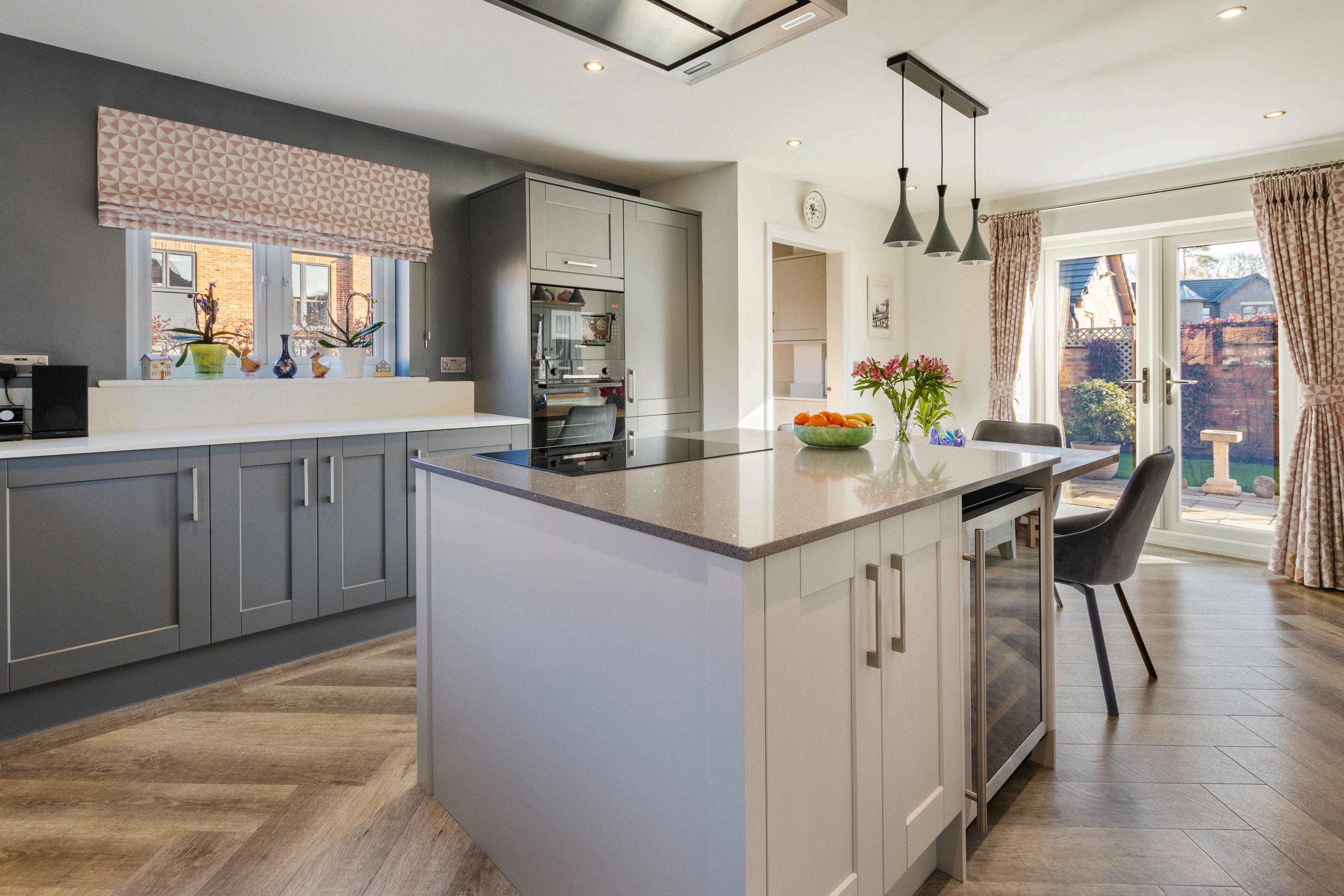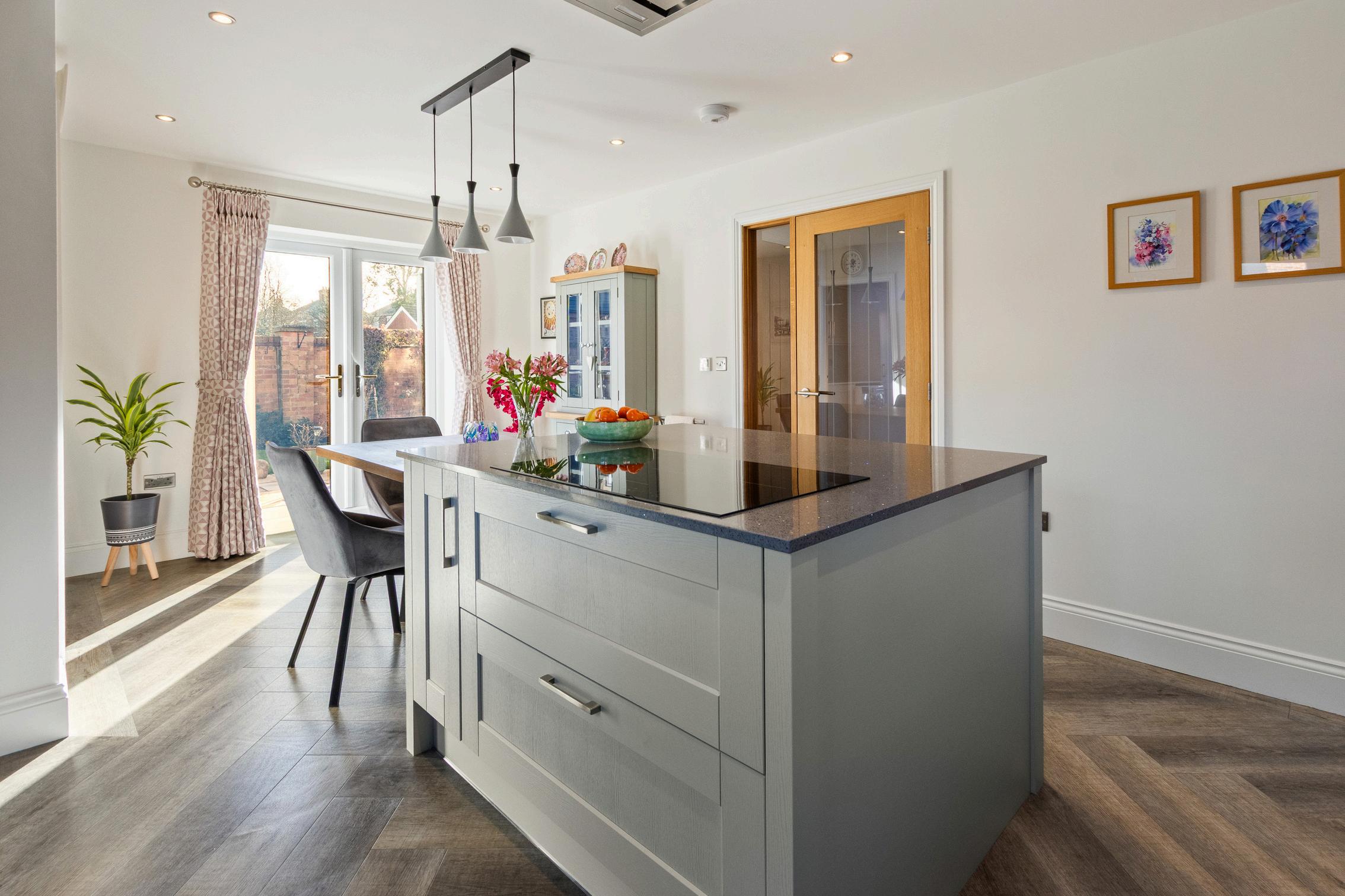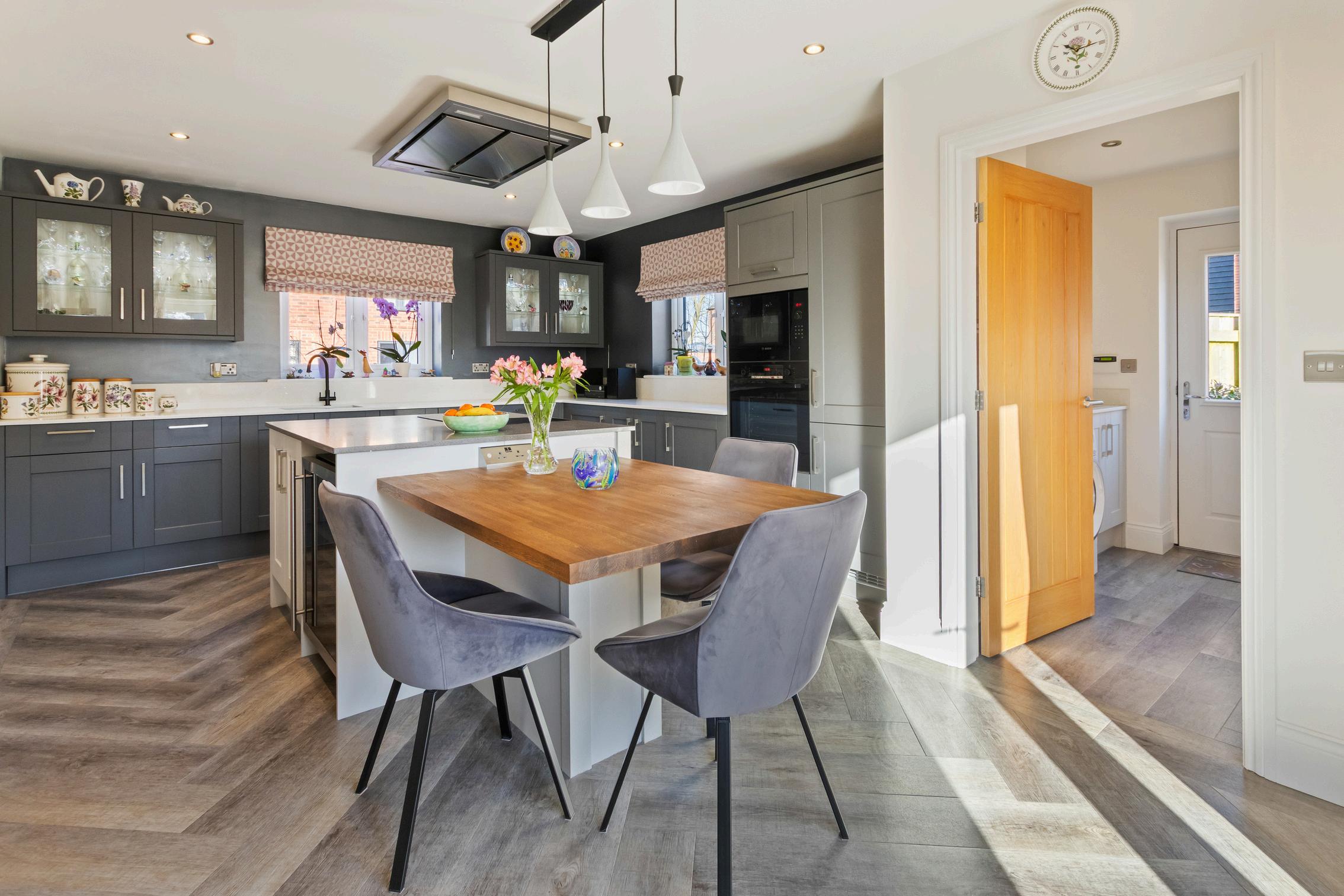 The stylish breakfast kitchen is fitted with modern units, granite worktops, central island, integrated appliances and French doors opening outside, with a separate utility room providing additional practicality.