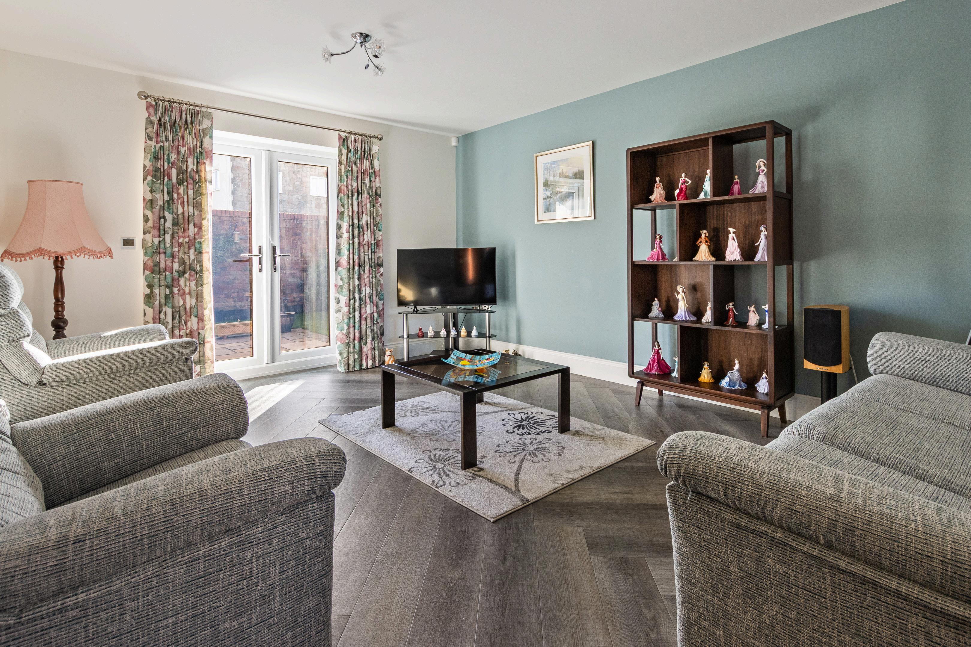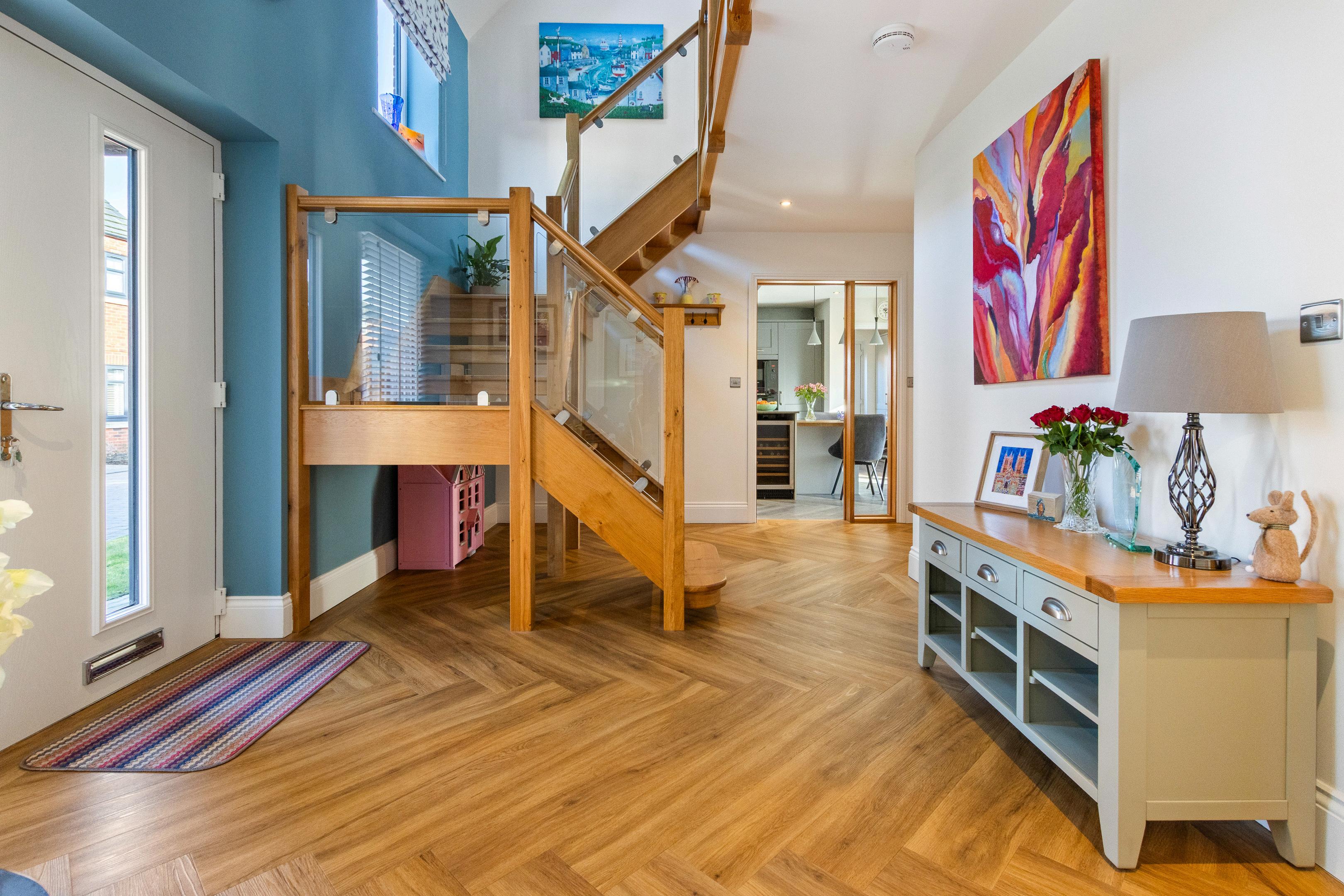 A welcoming reception hall with oak-framed portico entrance leads into beautifully presented accommodation featuring underfloor heating and quality upgrades including Amtico flooring across the ground floor. The generous lounge enjoys dual aspects with French doors to the garden, complemented by a separate dining room ideal for entertaining.