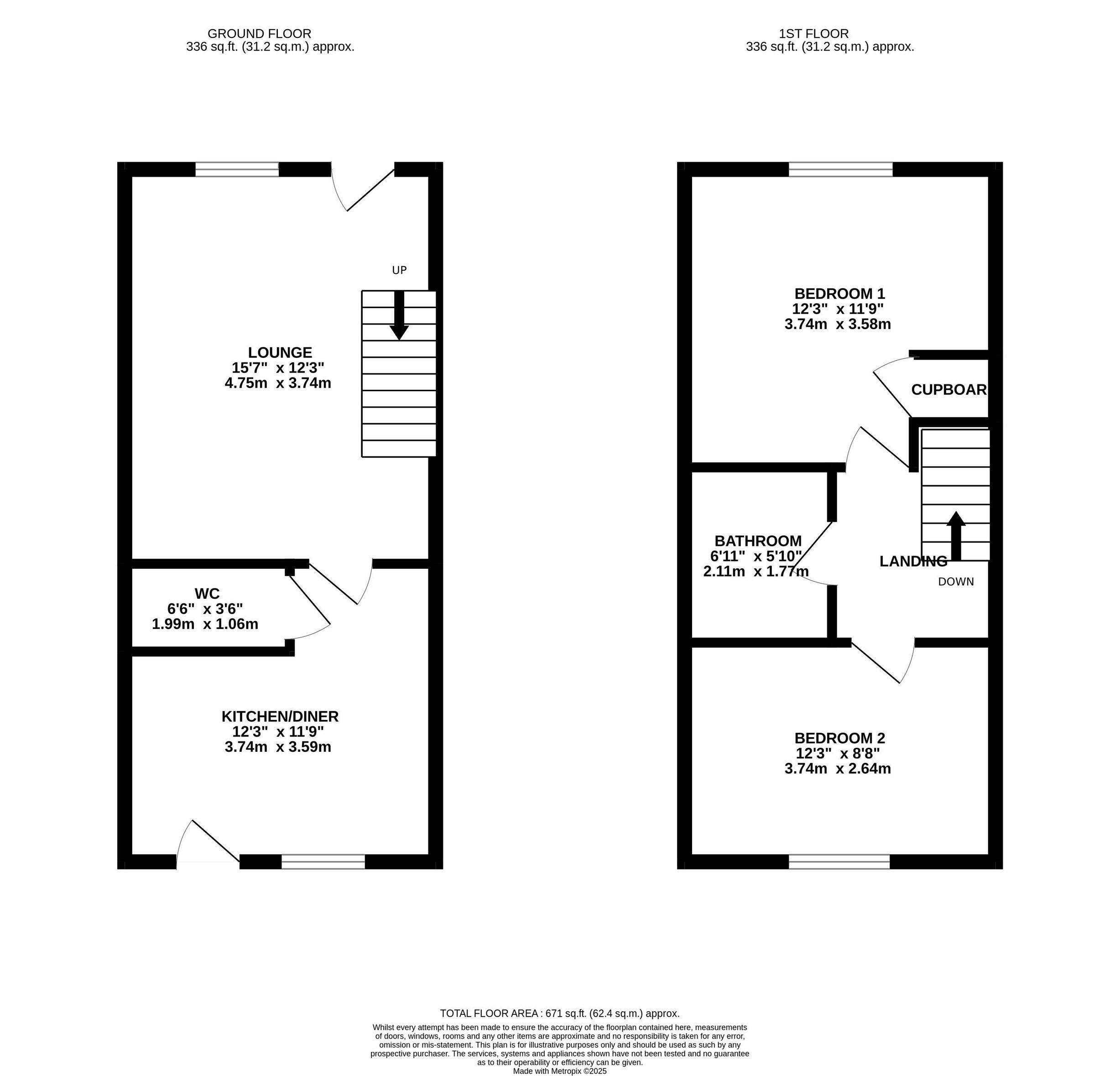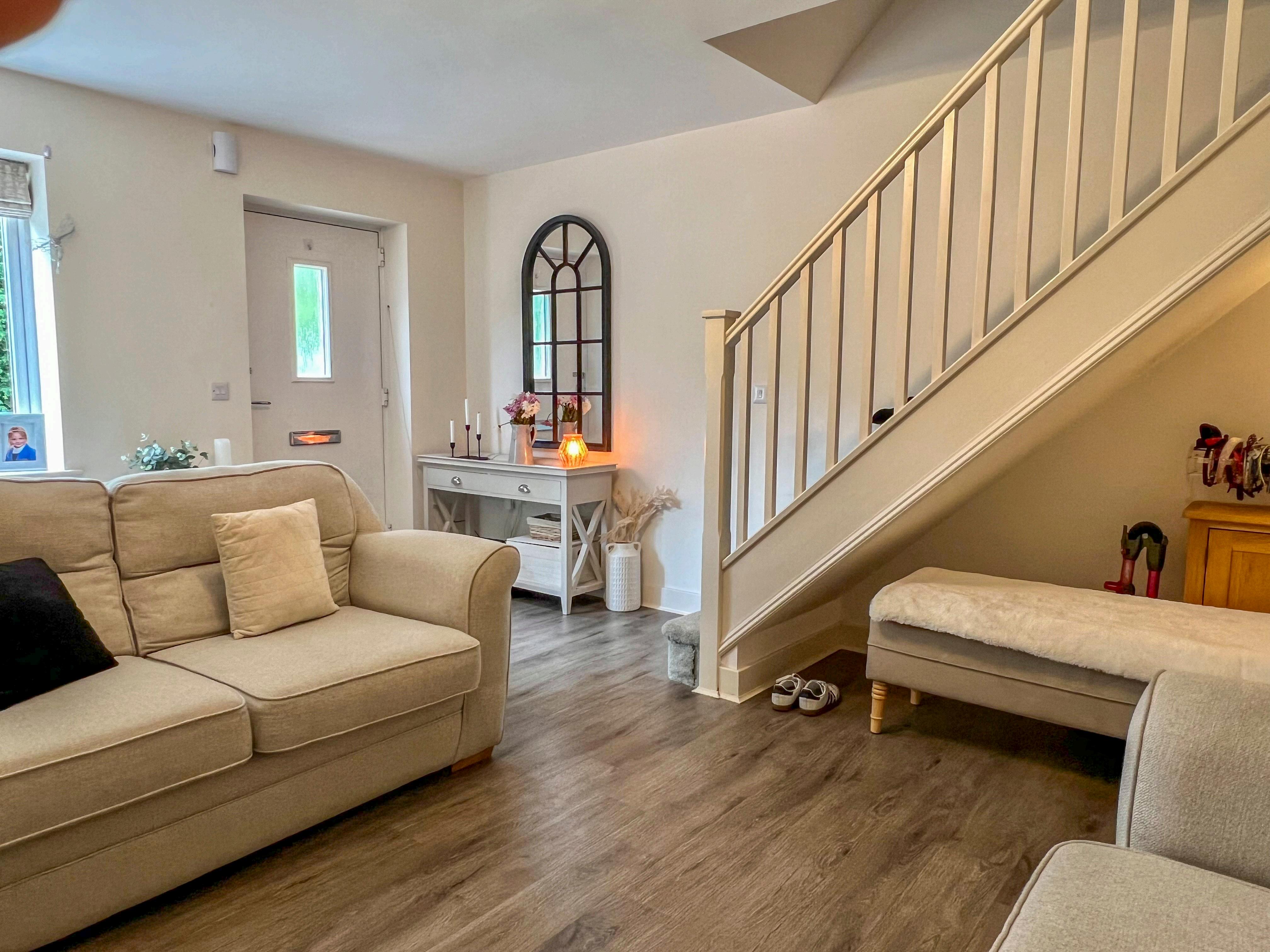 Upstairs, you'll find two generously sized double bedrooms. The front bedroom boasts a built-in cupboard above the stairs, optimizing storage space. A wellappointed family bathroom serves both bedrooms with modern fixtures and fittings. Additional storage needs are catered for with a loft space that has been partially boarded. This space offers ample room for storing seasonal items and more.