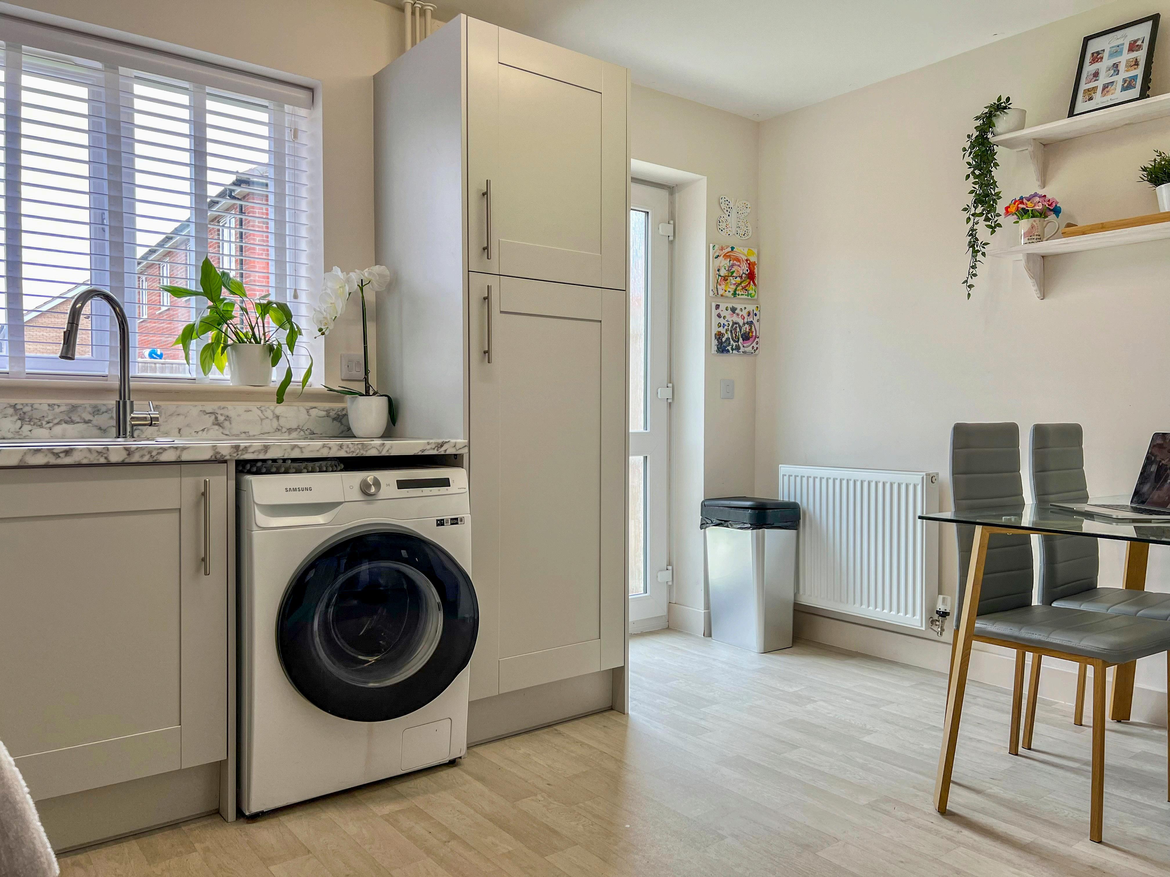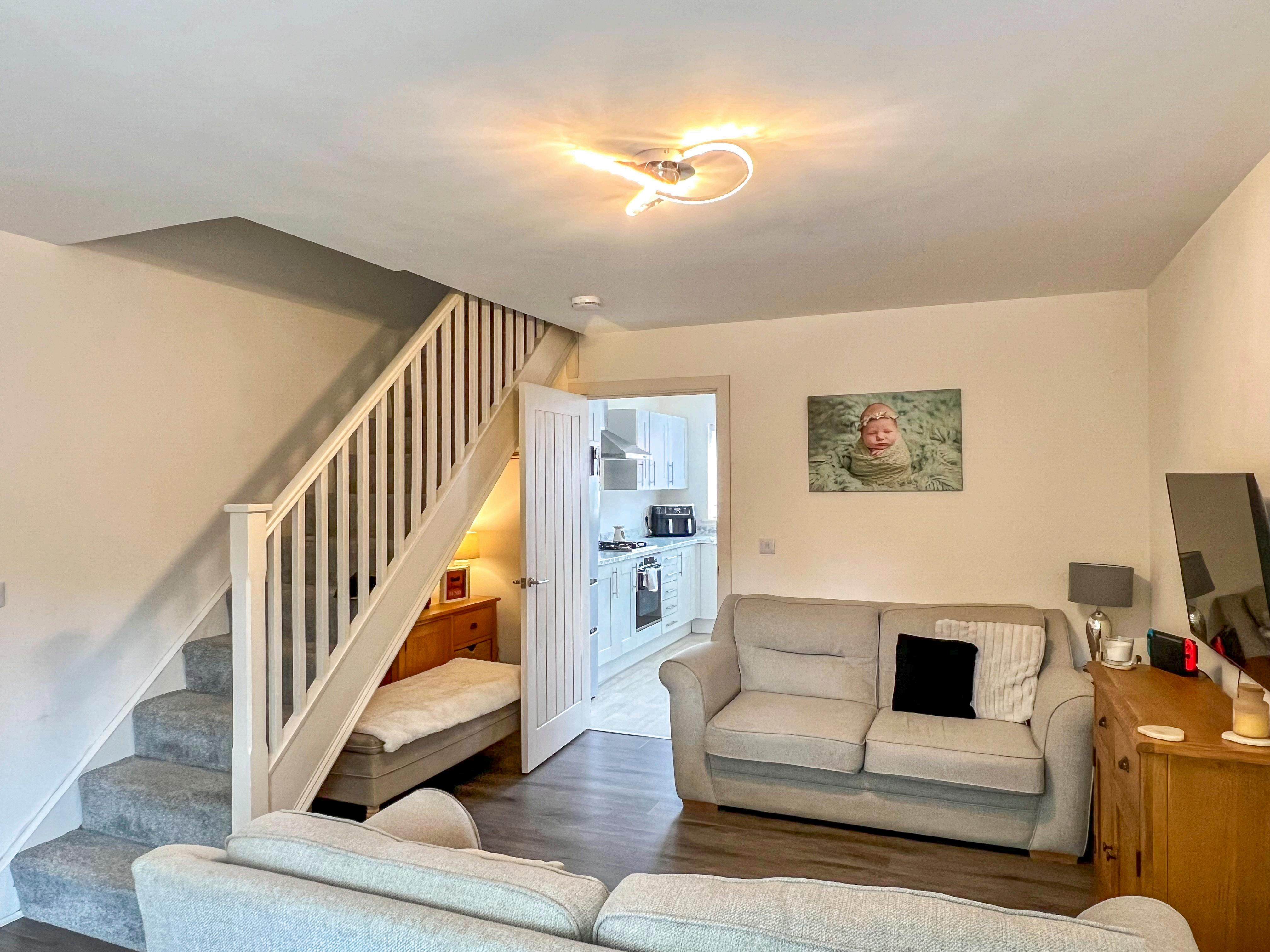 Located in the heart of Healing's Quintessential development, this modern two-bedroom terrace built in 2020 by Cyden Homes offers a blend of contemporary living and convenience. As you enter, the inviting lounge welcomes you with open-plan stairs leading to the first floor, creating a spacious and airy atmosphere. The kitchen diner is adorned with sleek, pale grey units and provides direct access to the rear garden, ideal for outdoor dining and relaxation. Completing the ground floor is a convenient w/c, adding practicality to the layout.