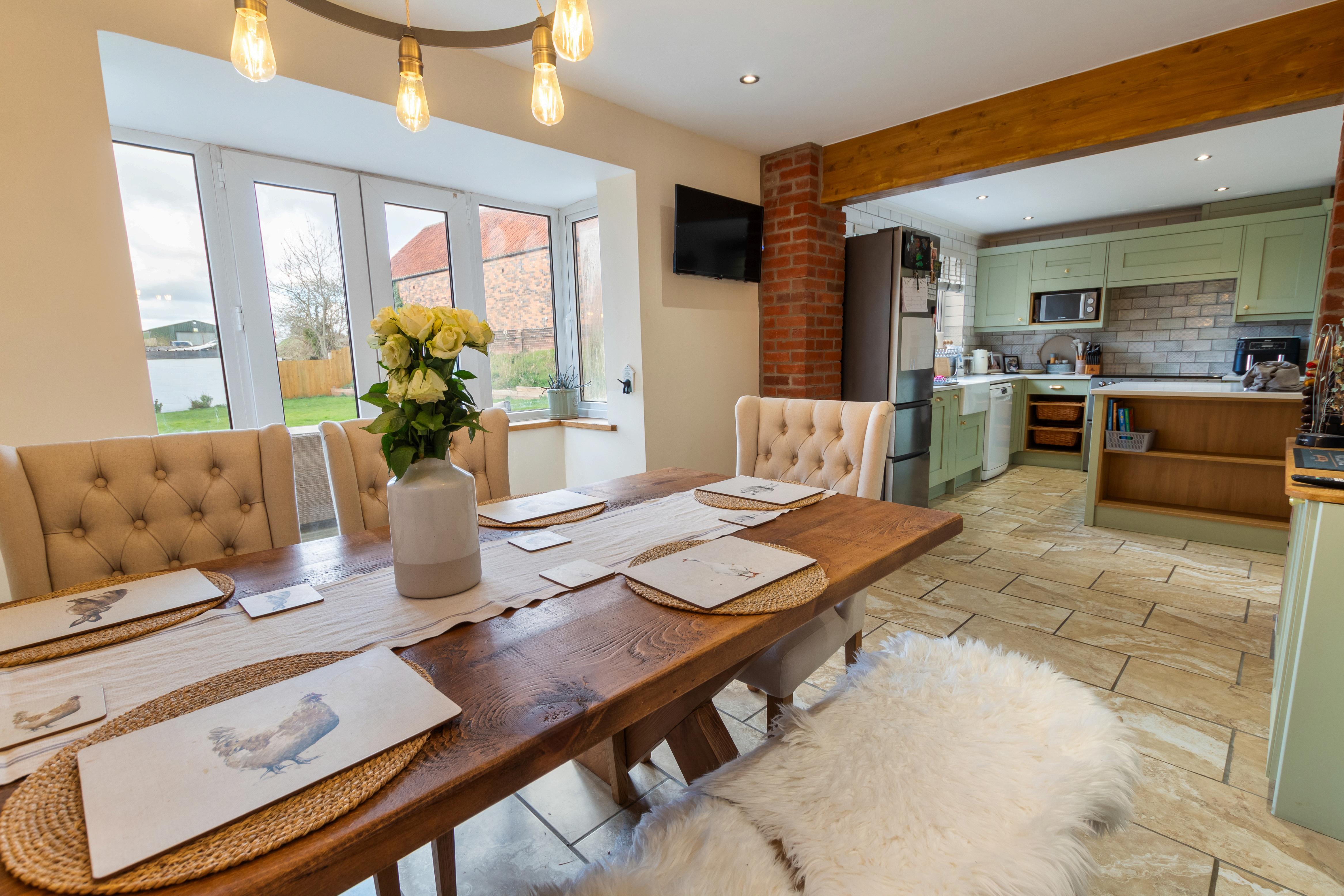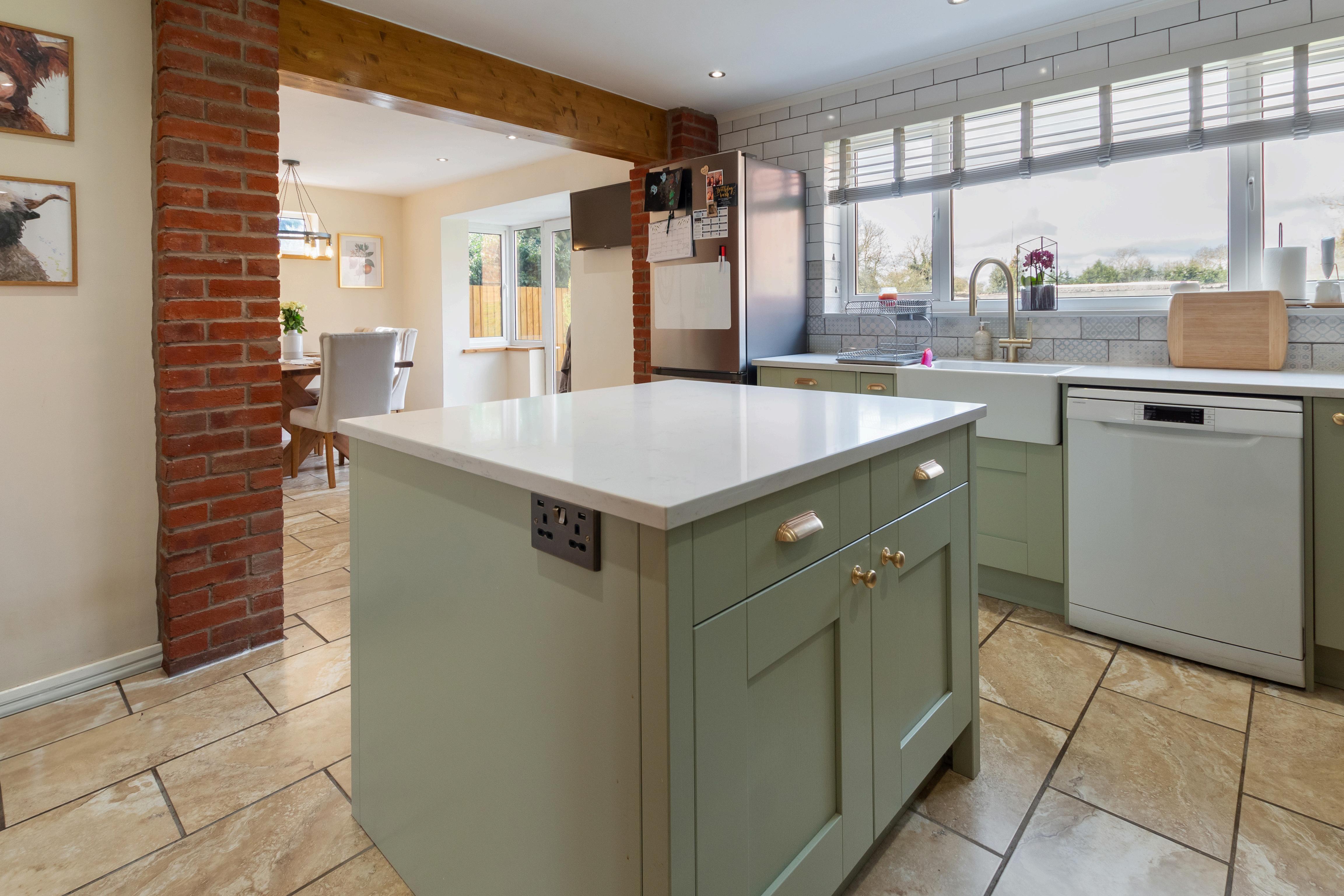 At the heart of the home is the stunning kitchen, fitted with chic green shaker-style units and a central island, providing generous worktop space. The Belfast sink with mixer tap and designated space for appliances enhance both practicality and style. A charming, exposed brick opening leads through to the bright and airy dining area, where French doors open out to the rear garden, seamlessly blending indoor and outdoor living.