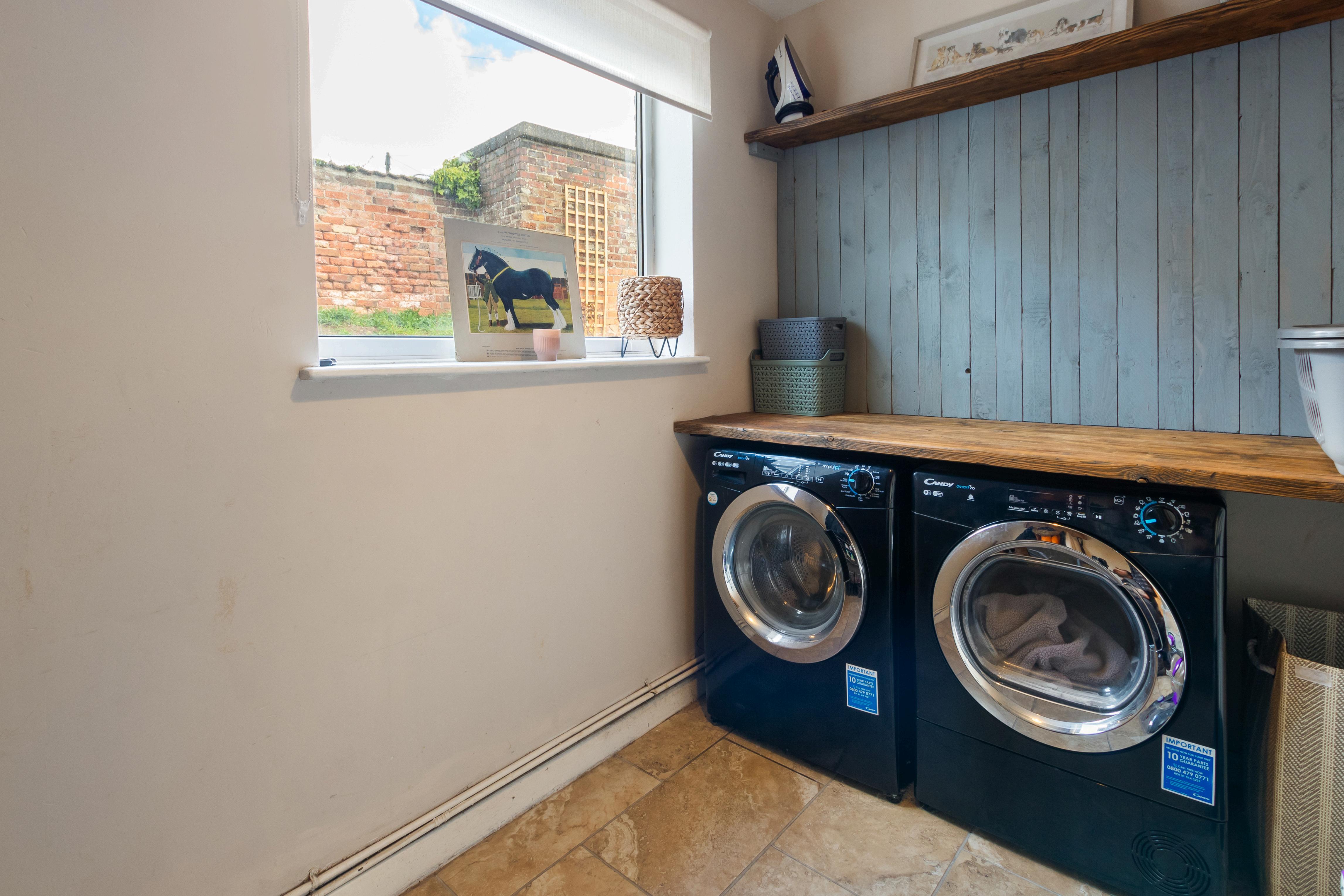 Step inside through the welcoming entrance hallway, where you’ll find stairs leading to the first floor and doors to the ground floor accommodation. The modern front-facing lounge features a stylish TV media wall unit, creating a contemporary yet cozy living space. Further down the hallway, there is a convenient WC and a separate utility room with ample space for white goods.
