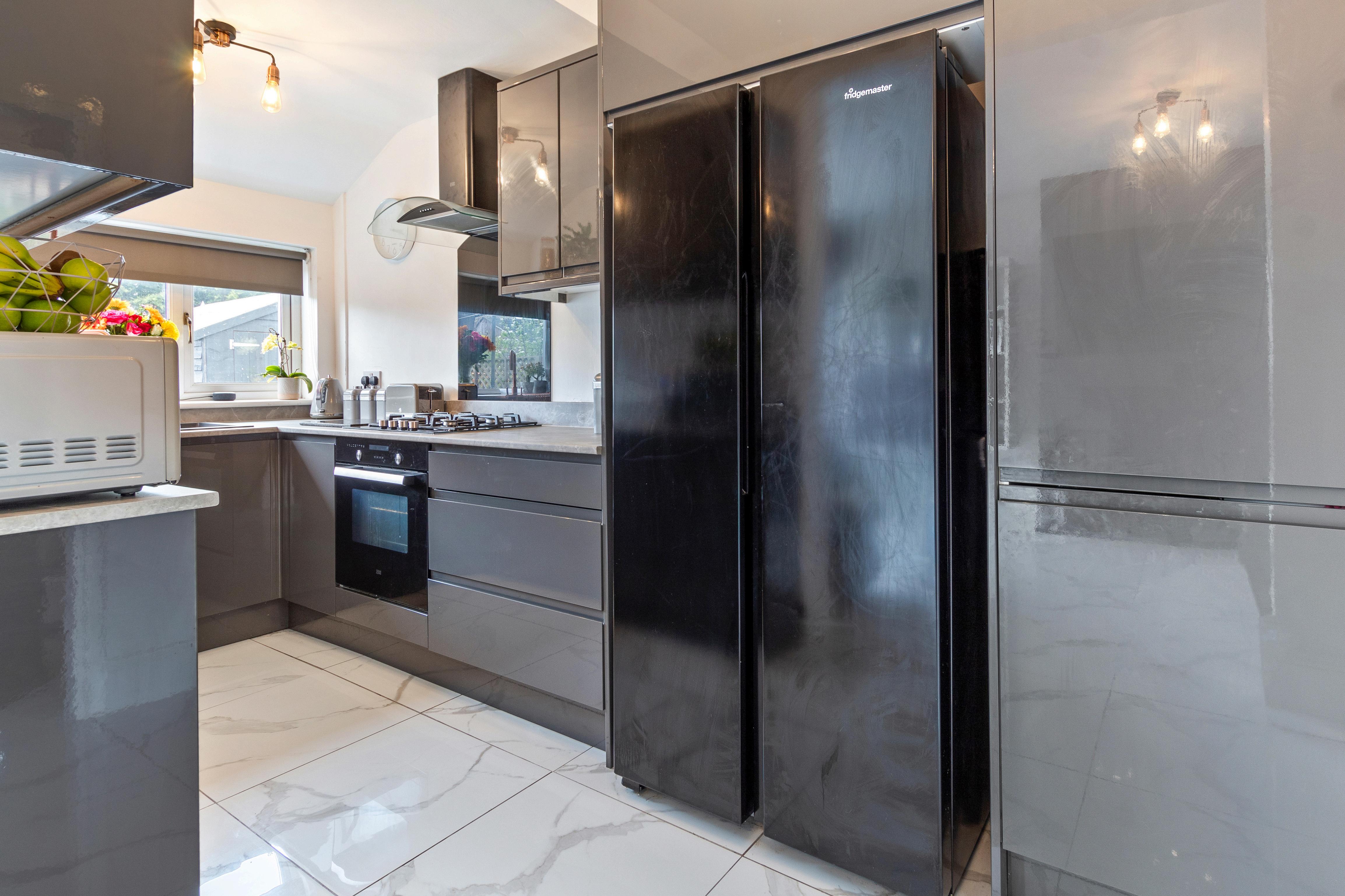 Modern Open-Plan Kitchen, Living, Dining Room: The heart of the home awaits, featuring a contemporary open-plan layout that effortlessly combines the kitchen, living, and dining areas. Adorned with high gloss finish base and wall units, the kitchen is as stylish as it is functional, offering ample storage and workspace. The adjoining living and dining space is perfect for entertaining, with a captivating feature fireplace housing a dry fuel burner and French doors leading out to the rear garden, allowing for a seamless indooroutdoor flow.