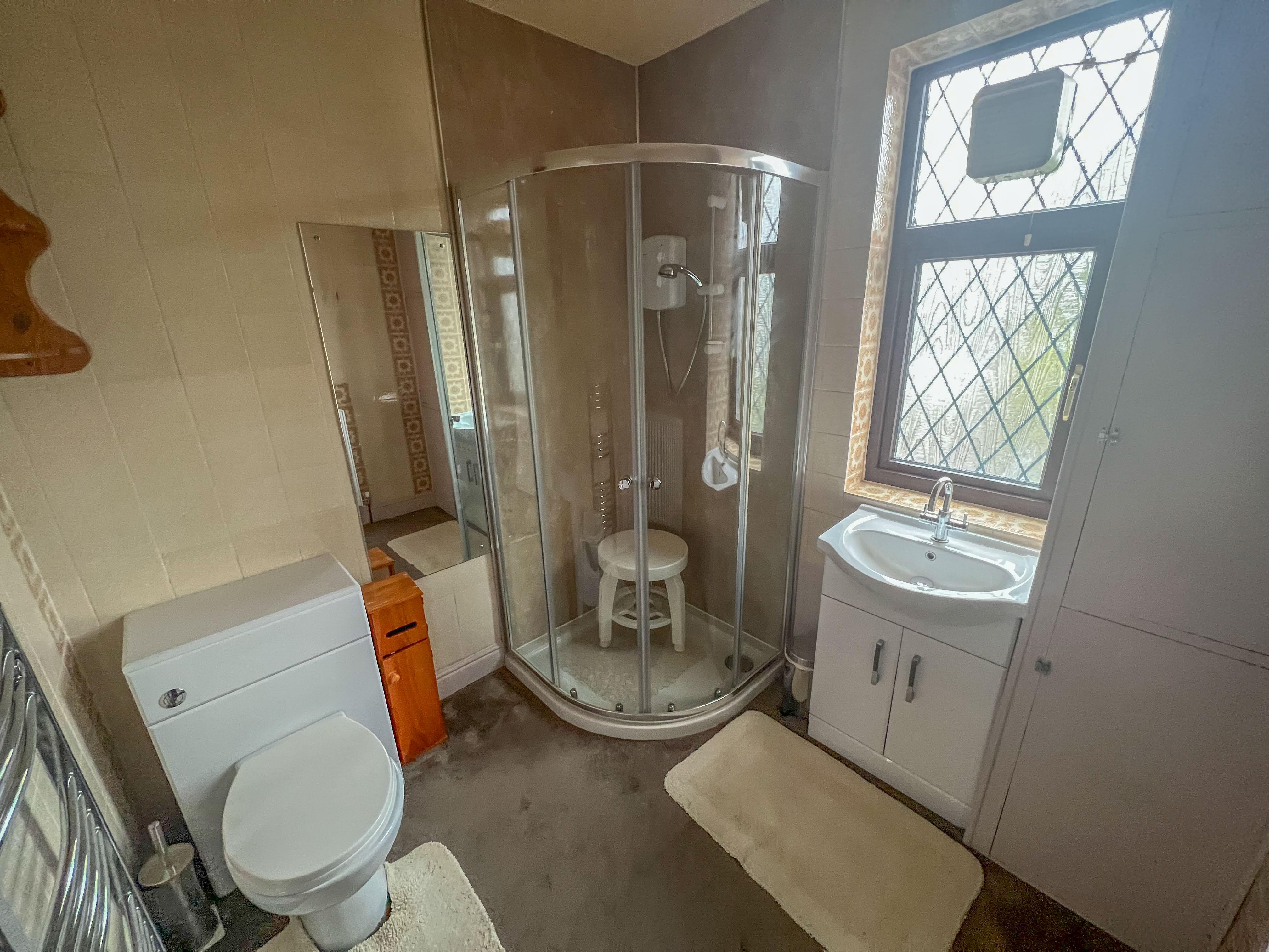 To the first floor is the spacious master bedroom that benefits from two window and an additional double bedroom to the rear of the property and both served by the three-piece family shower room with a walk-in electric shower cubicle, a hand wash basin and W.C.