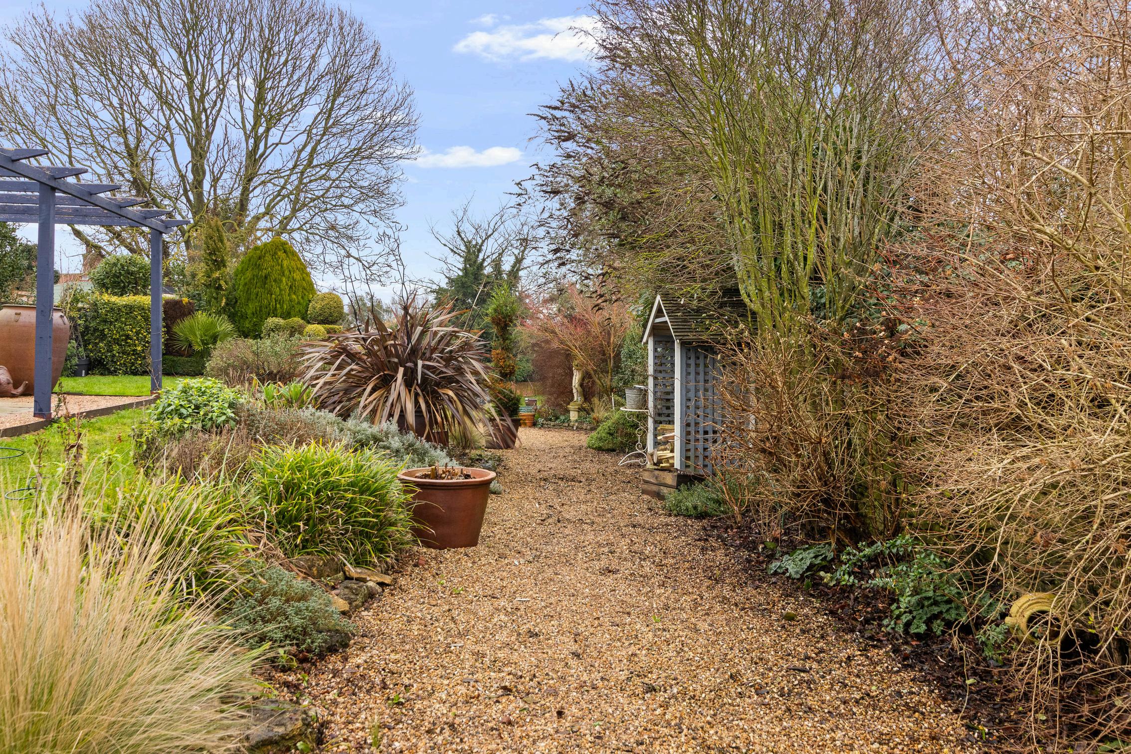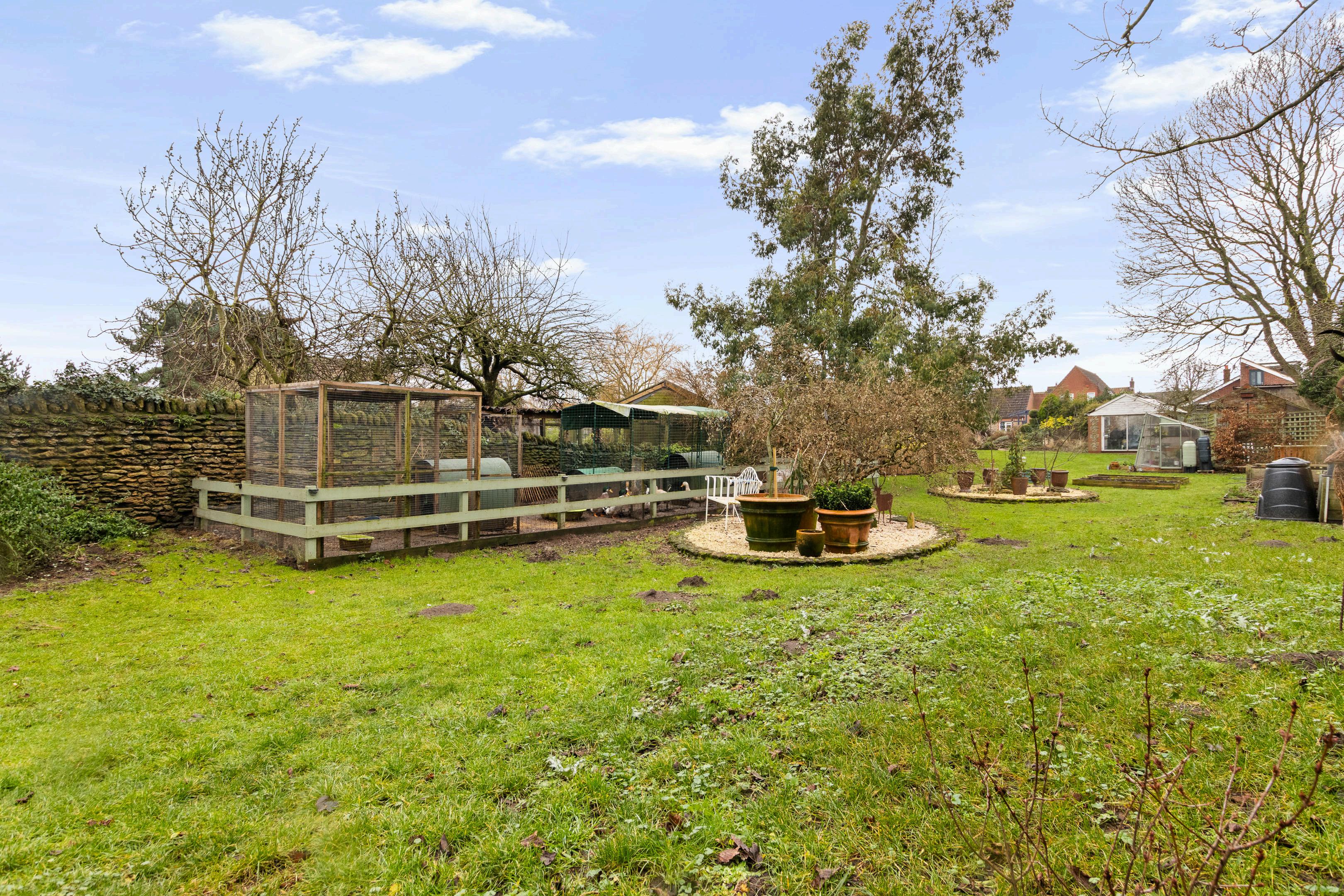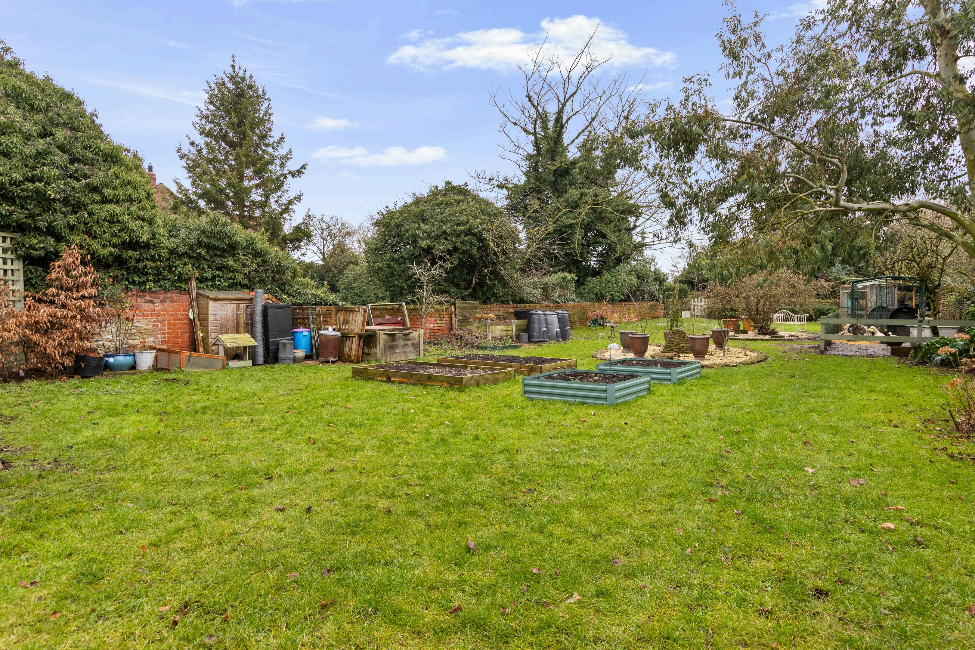 The gardens are generous and well maintained, offering a mix of lawned areas, established planting, and seating spaces ideal for outdoor dining and relaxation. A particularly charming feature is the original stone well located to the side of the property, adding a unique sense of character and heritage.