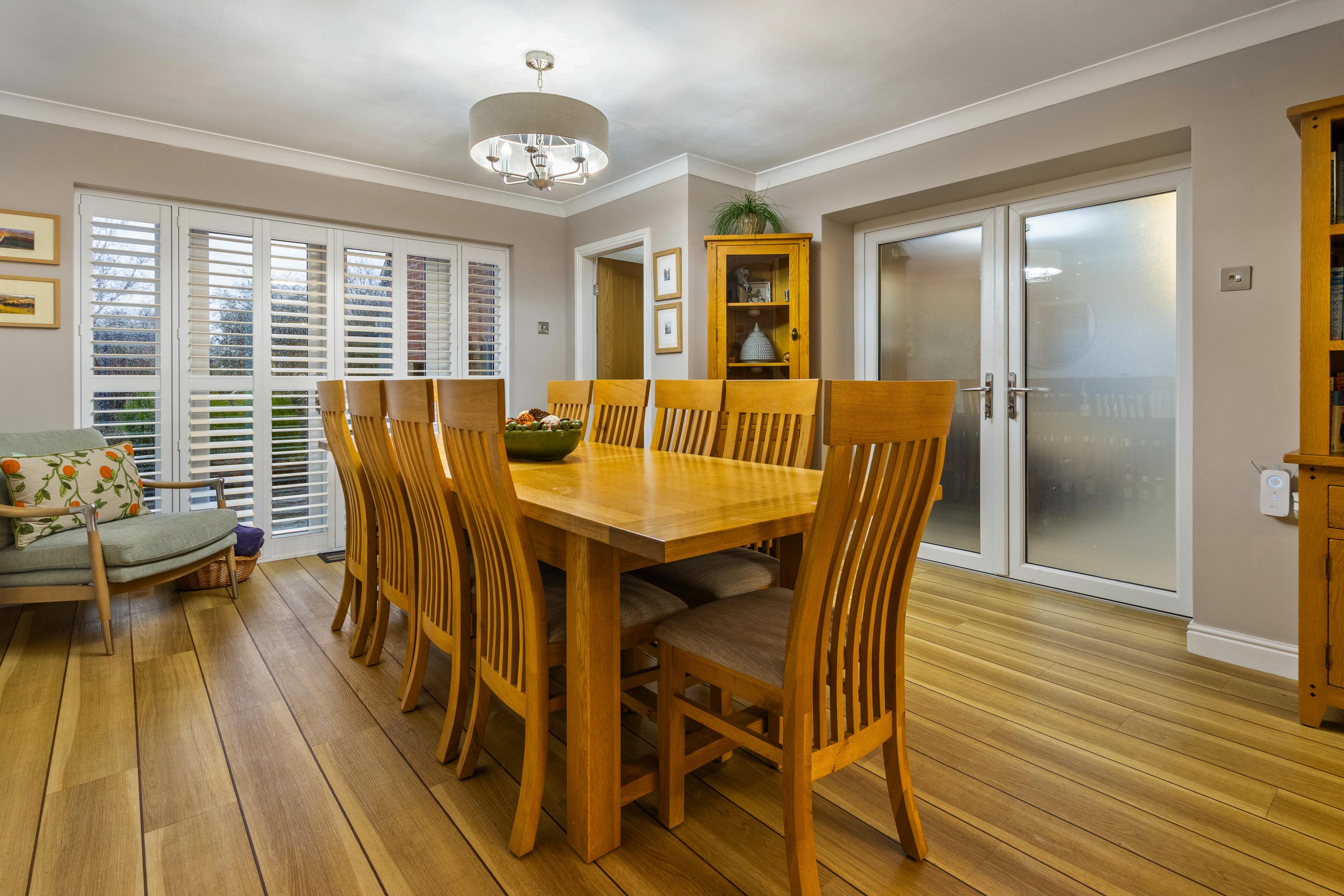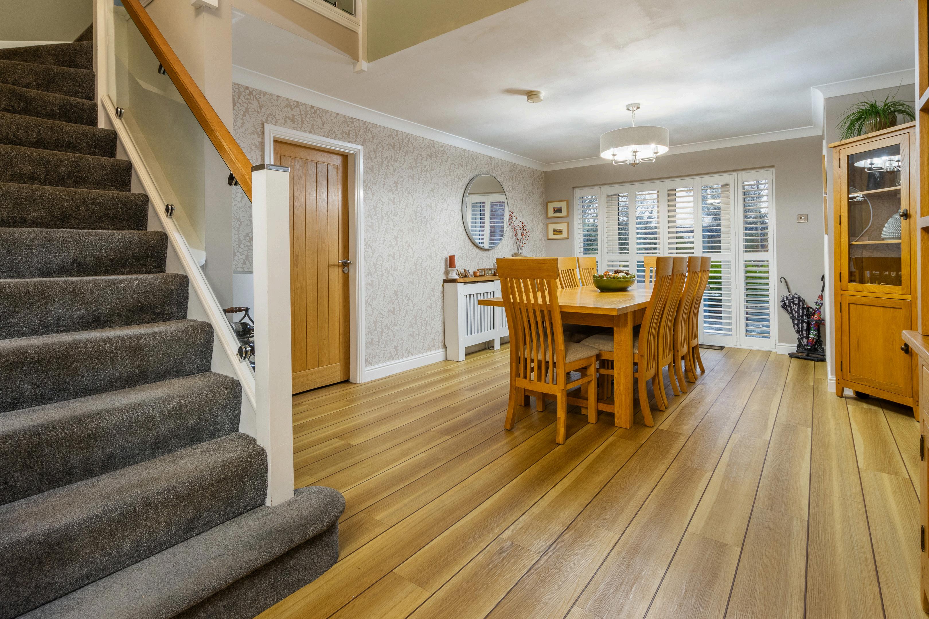The property is entered via a welcoming reception hall/dining area, which forms the central hub of the home and showcases an oak and glass staircase rising to the first floor. This space immediately sets the tone for the quality and thoughtful design found throughout.