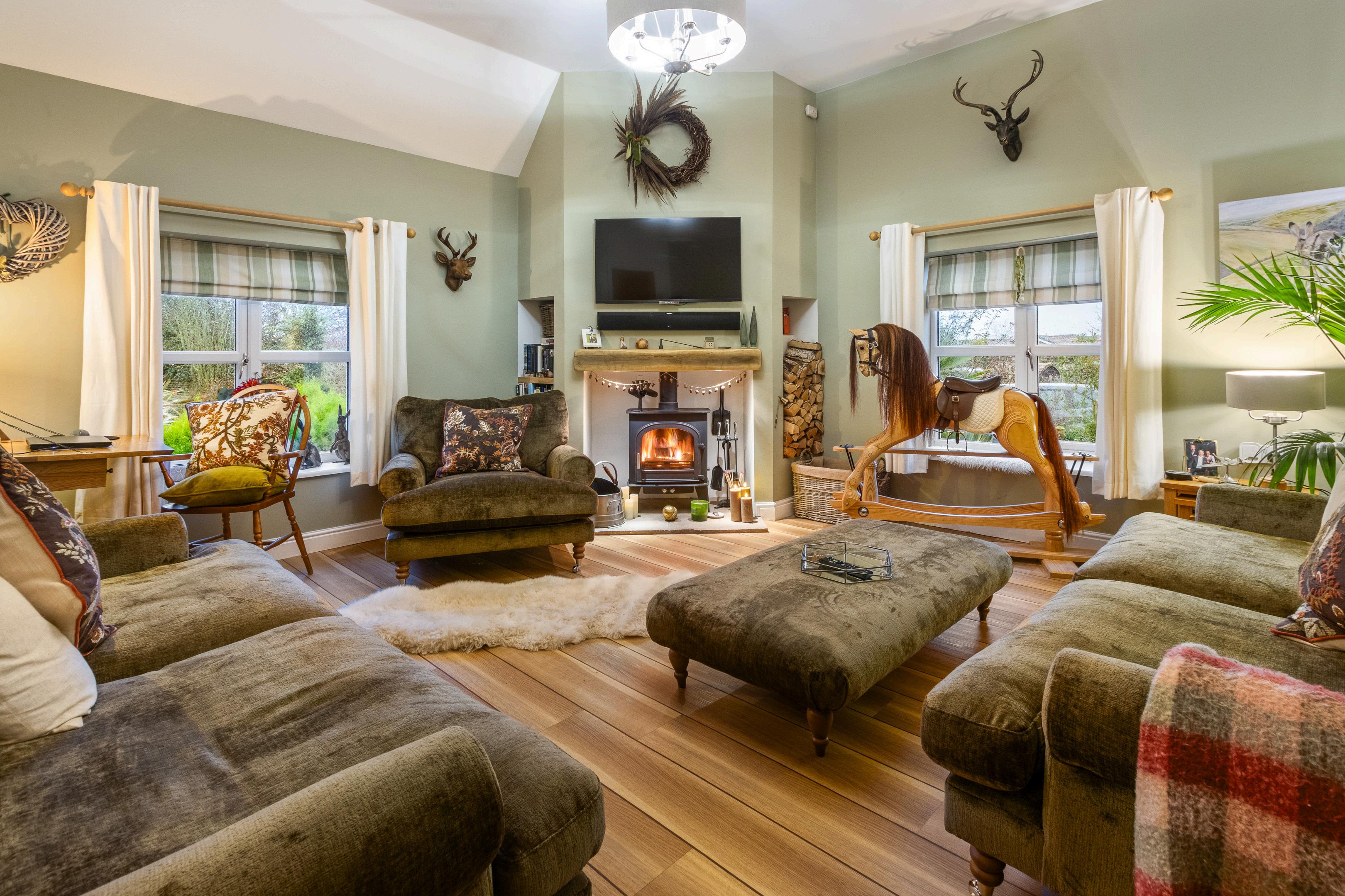The lounge is a standout feature — a spacious and inviting reception room with windows to multiple aspects and a log burner creating a cosy focal point, perfect for relaxing evenings or entertaining. The room enjoys excellent natural light and a warm, contemporary feel that complements the stone-built character of the property.
