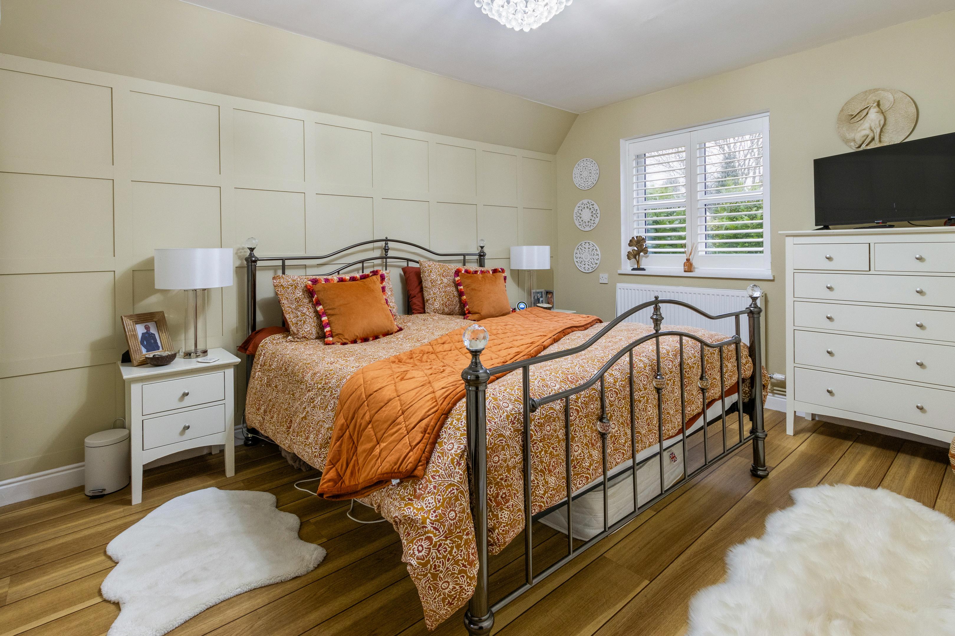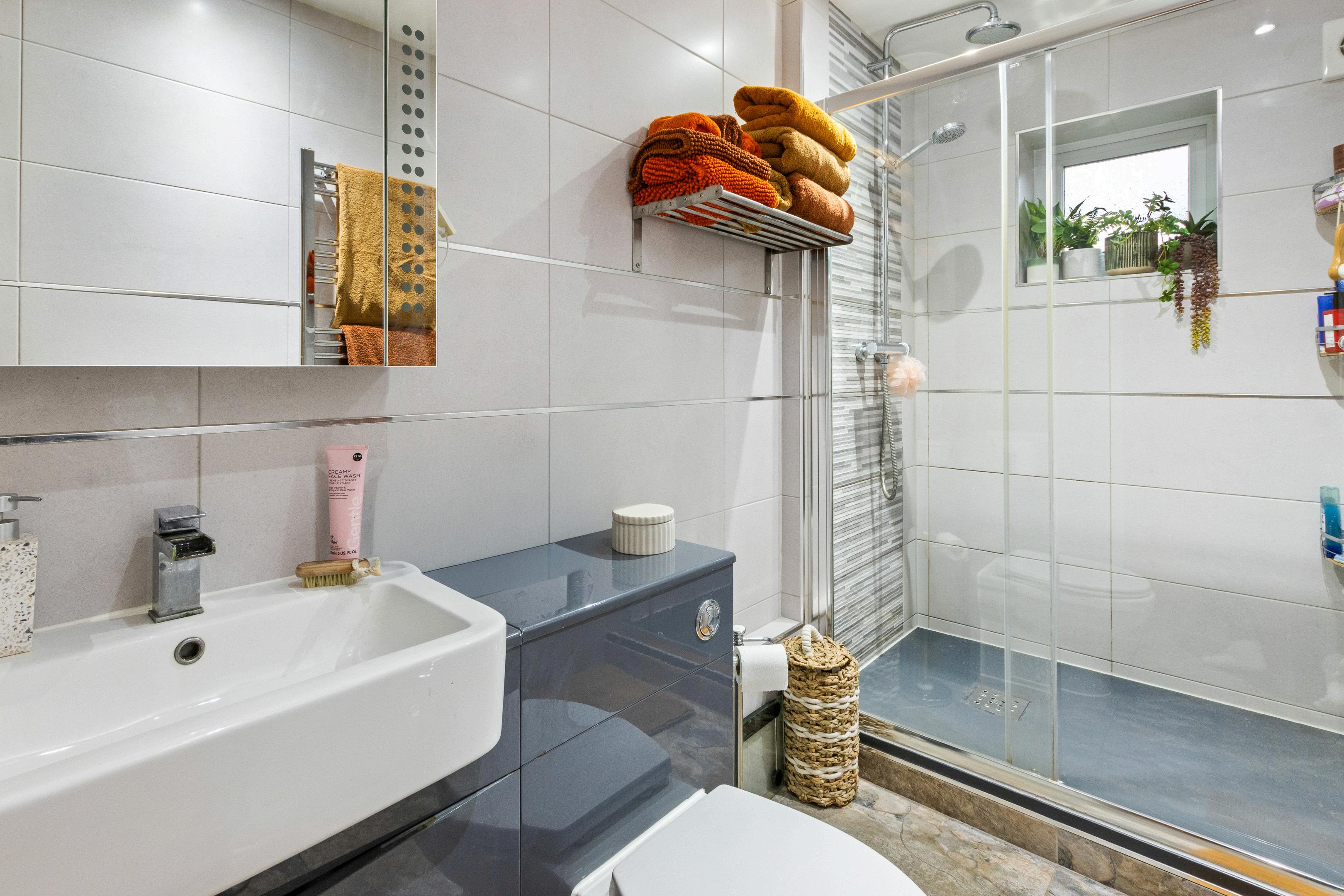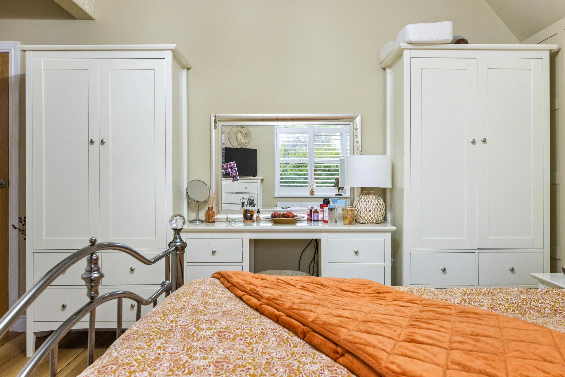 To the first floor are two further well-proportioned bedrooms, both served by their own bath/shower facilities. One-bedroom features Hammonds fitted wardrobes, providing excellent storage without compromising floor space. The presence of bathrooms for each bedroom enhances privacy and convenience for family members or guests.