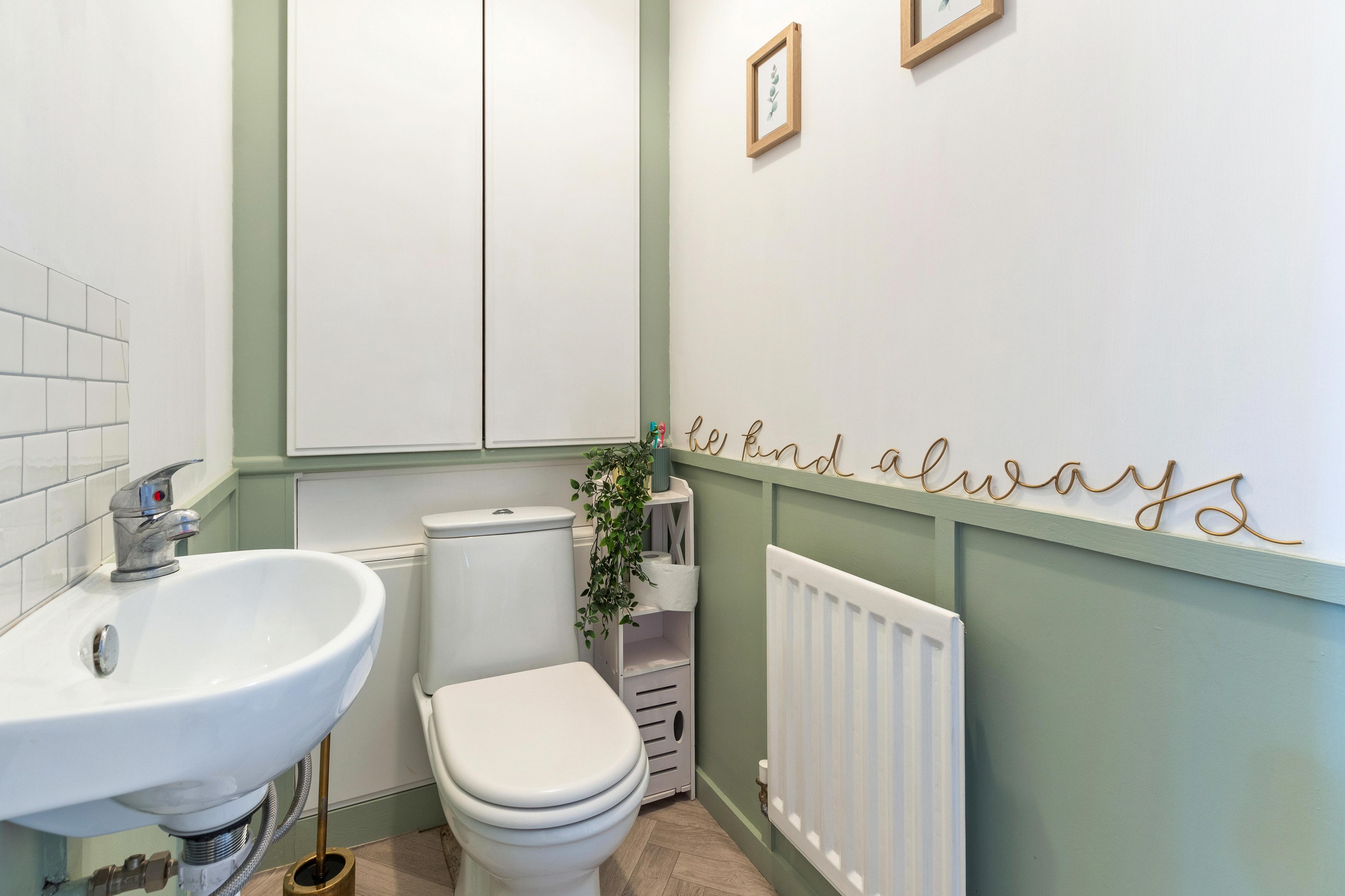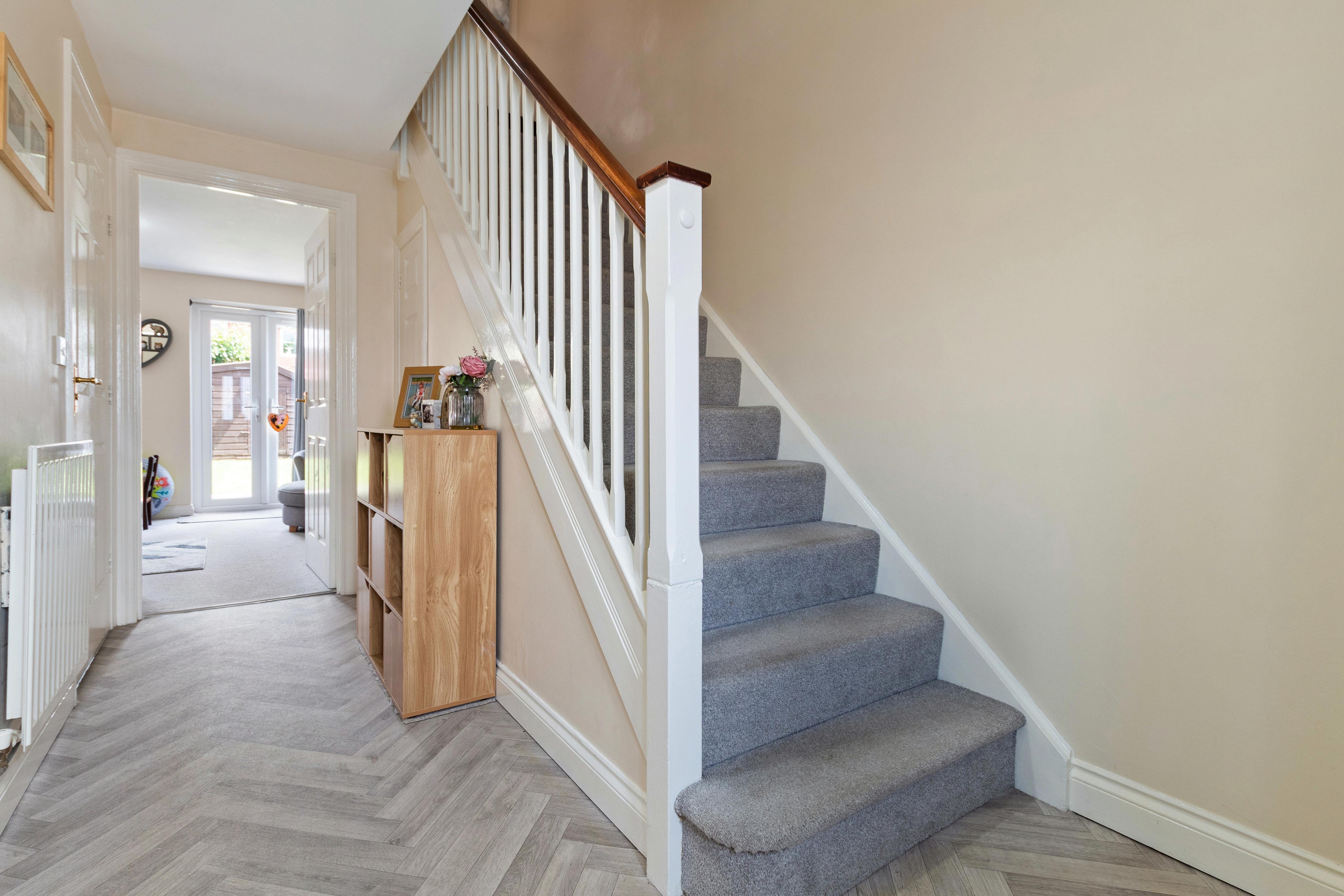 Through the front door you are greeted by a welcoming entrance hallway with access to the first floor. Firstly, the kitchen is located at the front of the property, with ample cupboard space and fitted with a built-in oven and hob with extractor hood. The kitchen also provides three convenient spaces for your additional appliances such as fridge-freezer and washing machine. Through the hallway, the property benefits from a large downstairs W.C and plenty of understairs storage space. The hall then opens to the modern, spacious lounge, full of natural light, with French doors that provide convenient access to the rear garden.