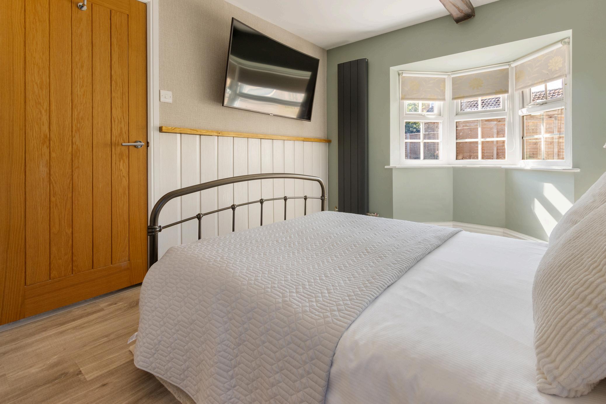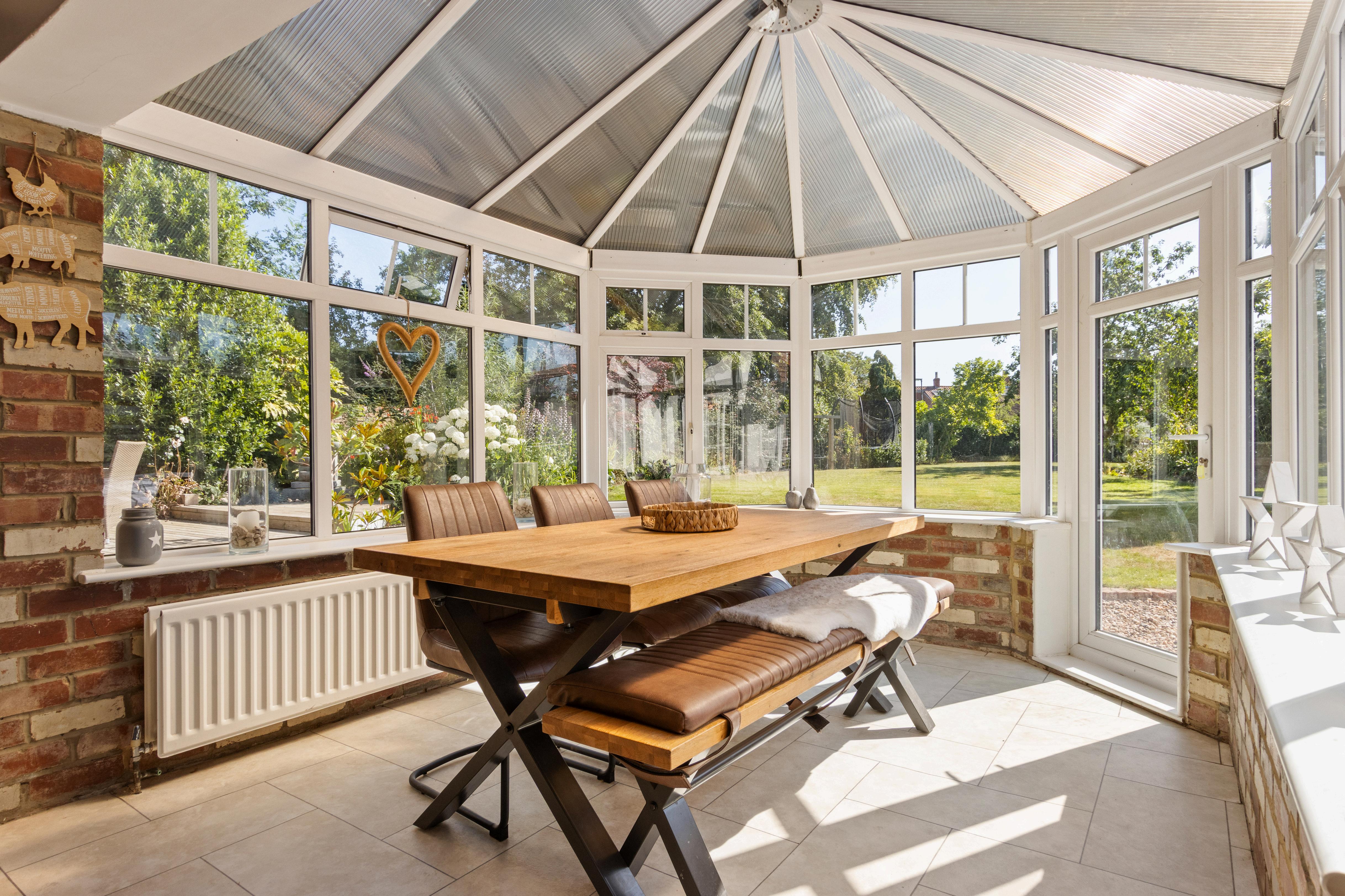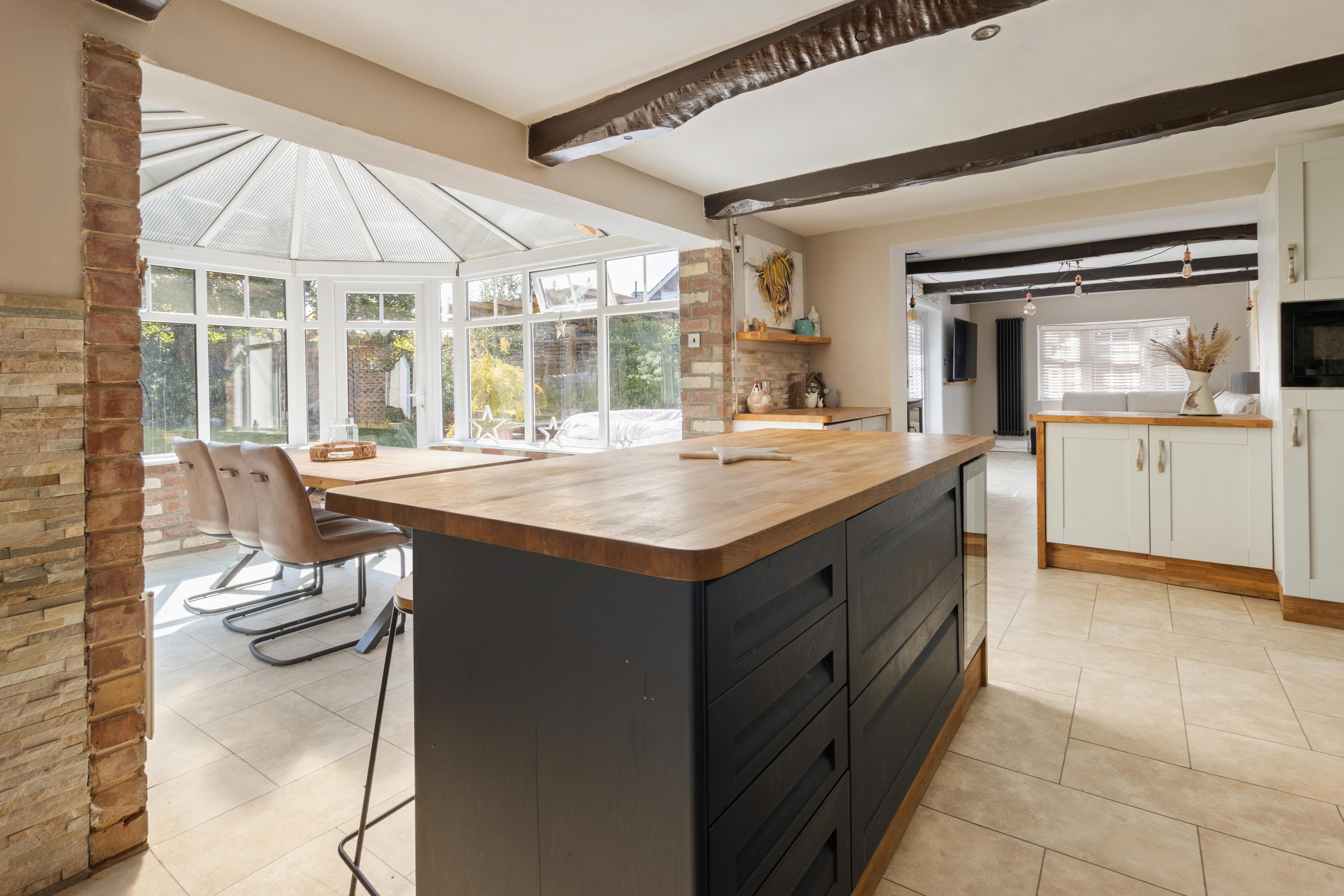 The open-plan kitchen/living/dining space is a true standout—boasting exposed beams, a second log burner, and a light-filled conservatory-style dining area with access to the garden. The kitchen is finished in a tasteful blend of modern and traditional styling, with ample wall and base units offering excellent storage and functionality.