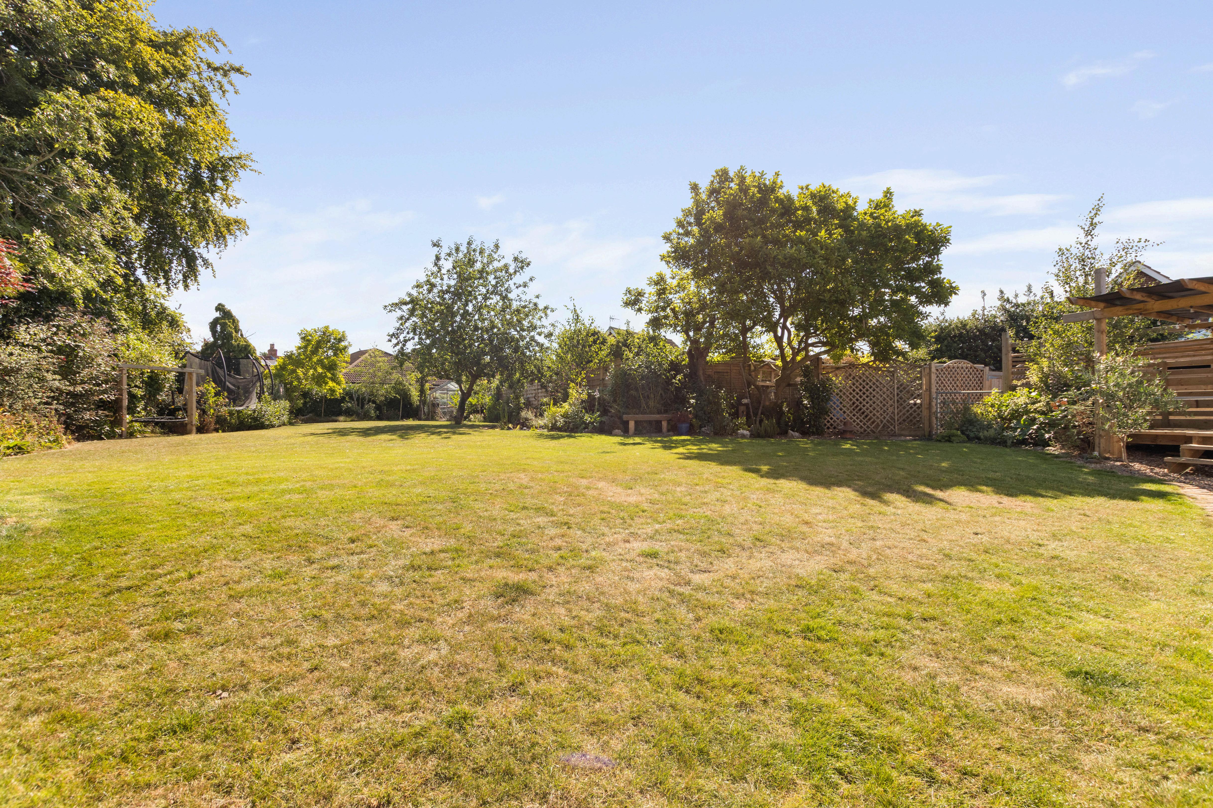 Outside, the rear garden is a peaceful haven, featuring multiple seating or dining areas linked by a manicured lawn and surrounded by established shrubs and planting. The generous driveway provides off-road parking for several vehicles and leads to a detached double garage.