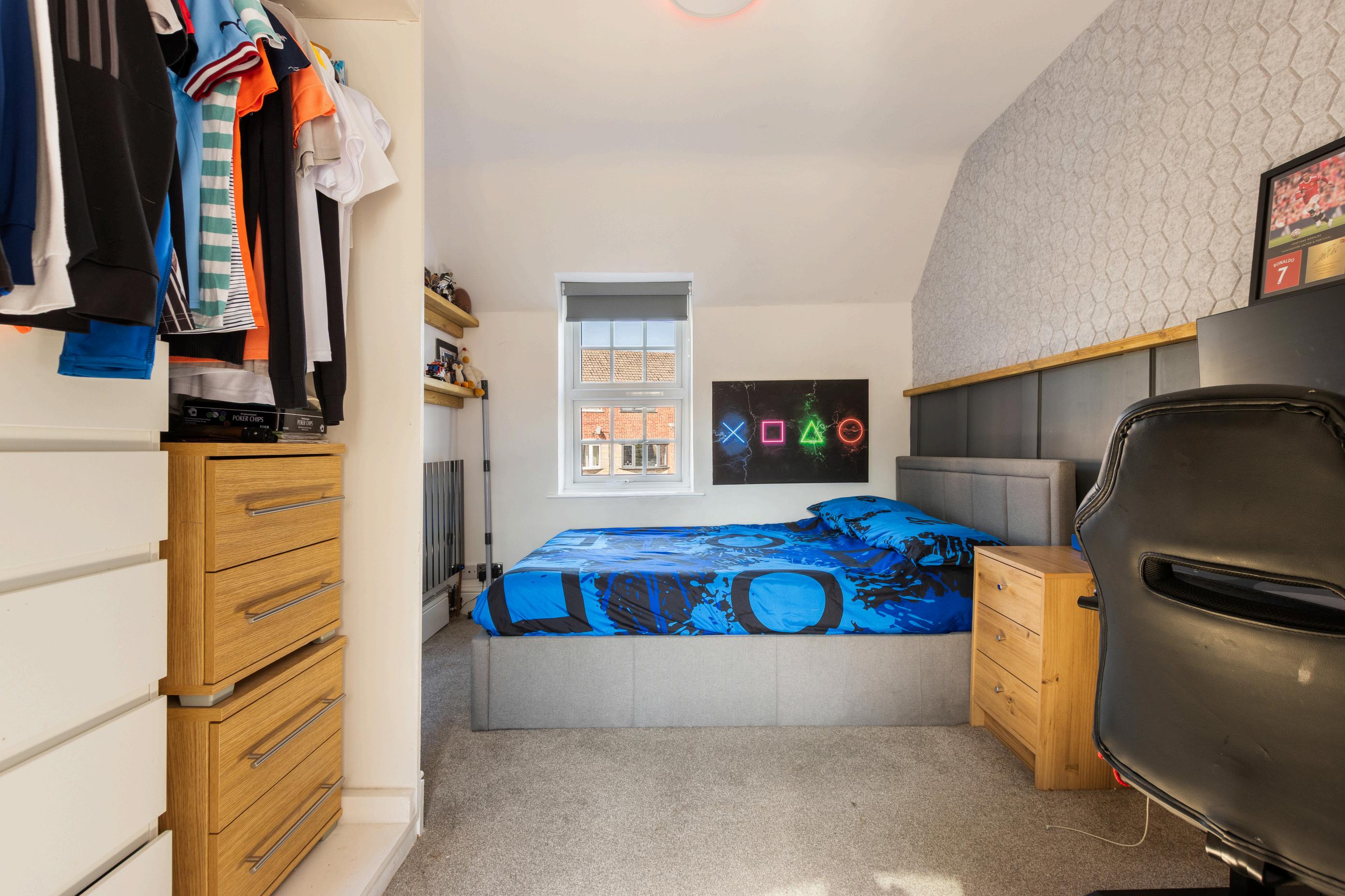 Upstairs, three spacious bedrooms provide ample accommodation, including one with dual aspect windows and another with built-in storage. A contemporary family bathroom serves the upper level, ensuring comfort and practicality for the whole household.