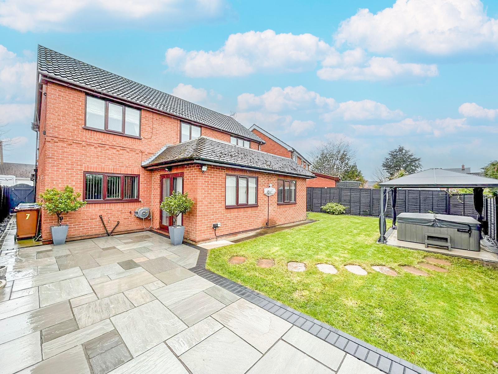 The rear garden is a well presented large area that offers both grass, and patio area. The front garden compliments the house with a nice grass area and double driveway leading up to the double garage.