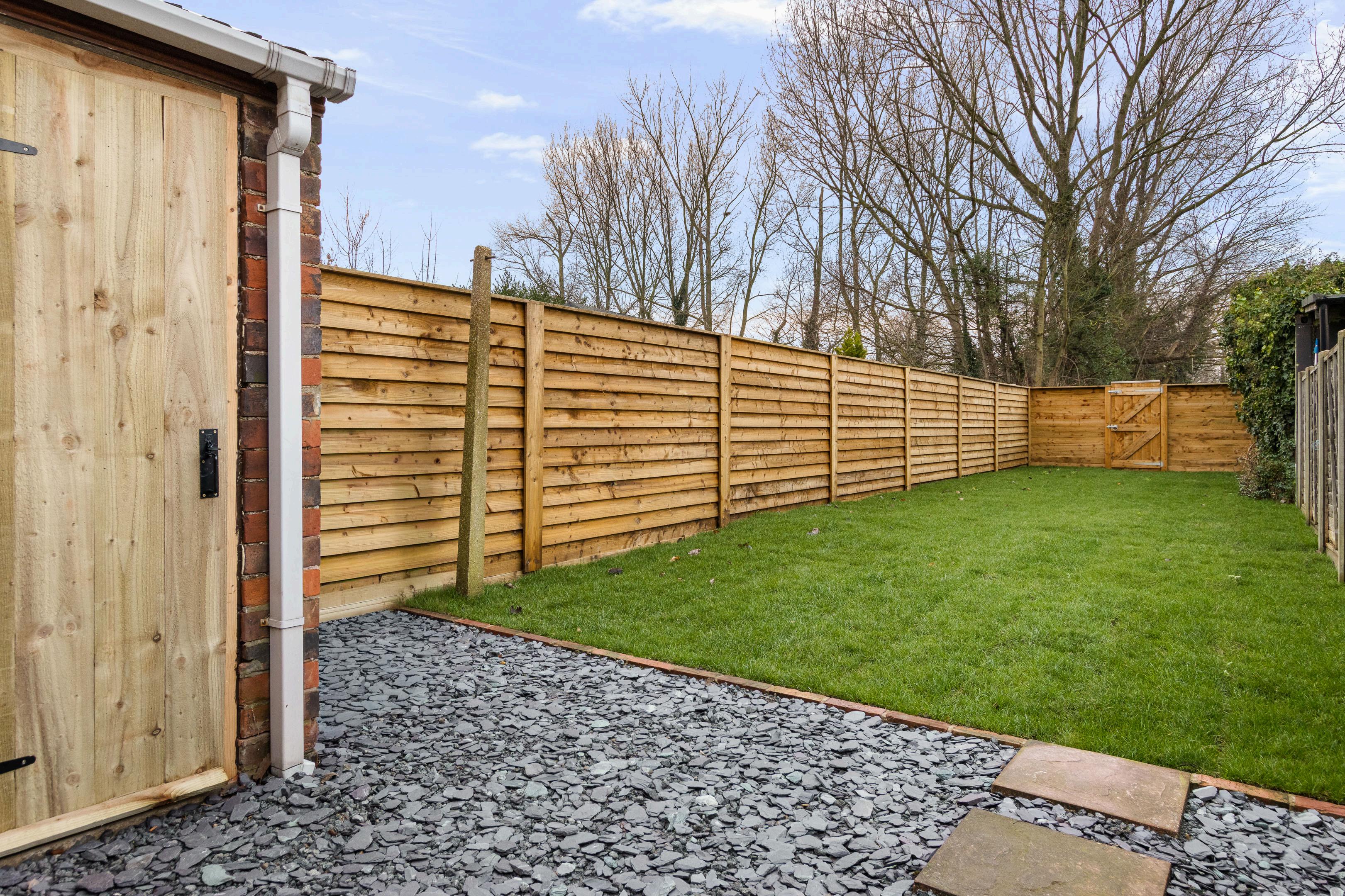 Closer to the house, a gravelled seating/utility area with stepping stones provides a practical spot for bins, bikes and muddy boots, while also working nicely as a low-fuss place to sit out with a coffee. There’s also a useful external store/outbuilding, perfect for garden tools, outdoor furniture, or that ever-growing collection of “life stuff” that you don’t want living in the dining room.