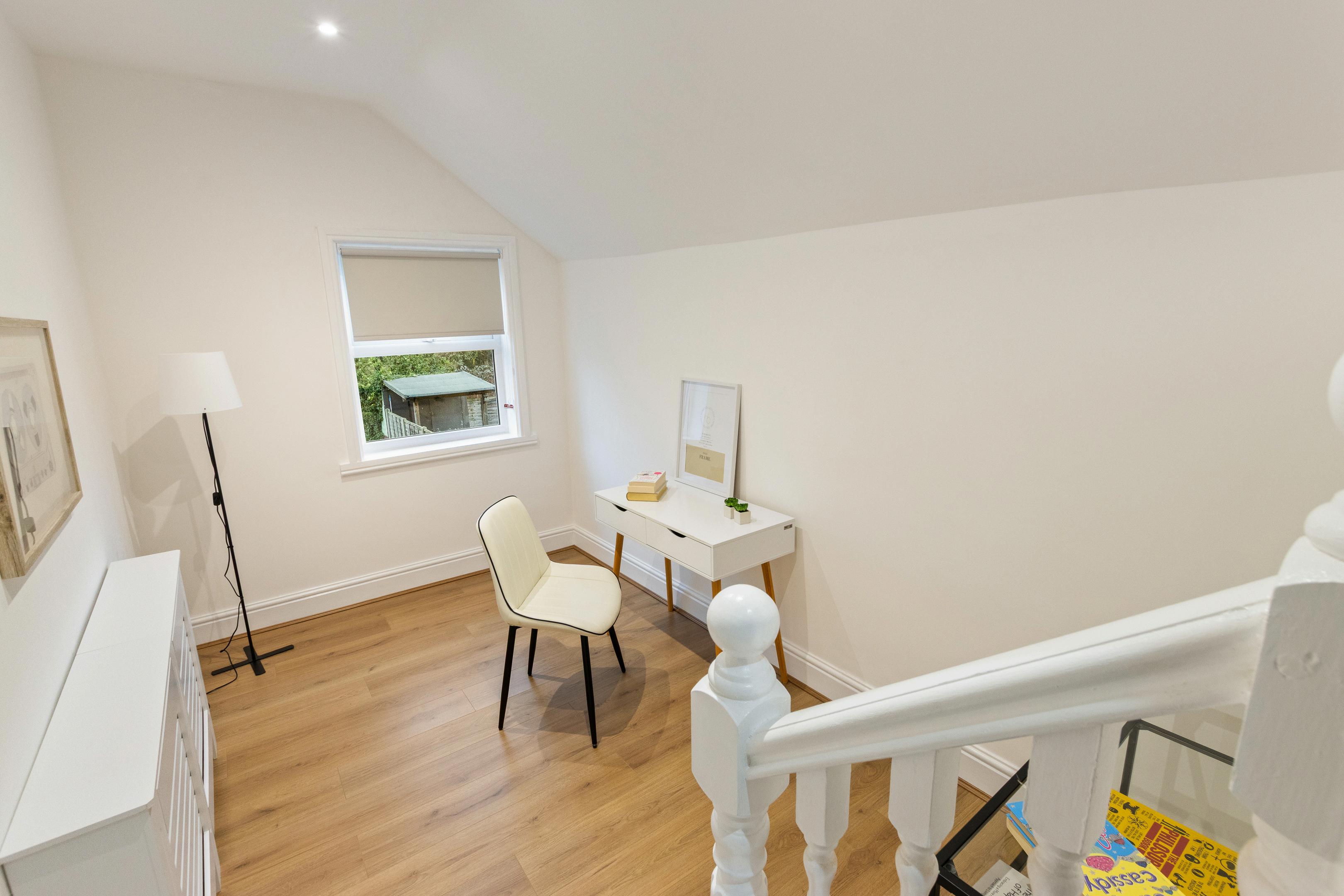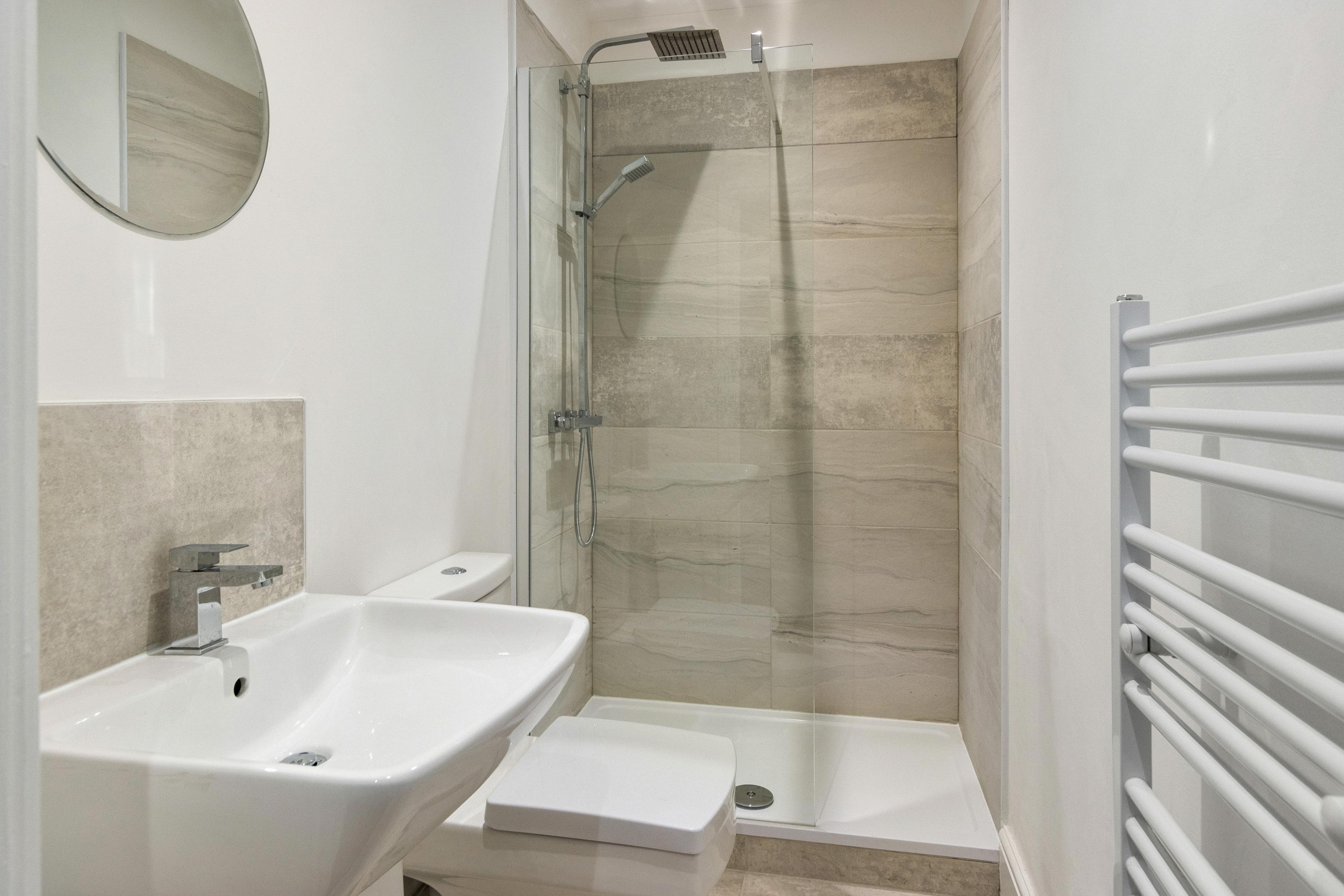 Upstairs, the first floor offers three bedrooms, led by a generous main bedroom with plenty of room for a double bed and additional furniture. Bedroom two is another comfortable double, while the third bedroom makes an ideal nursery, child’s room or home office. The accommodation is served by a stylish, updated shower room finished with modern tiling, a sleek white suite, a rainfall-style shower and a heated towel rail, all combining to create that fresh, hotel-clean feel buyers love.