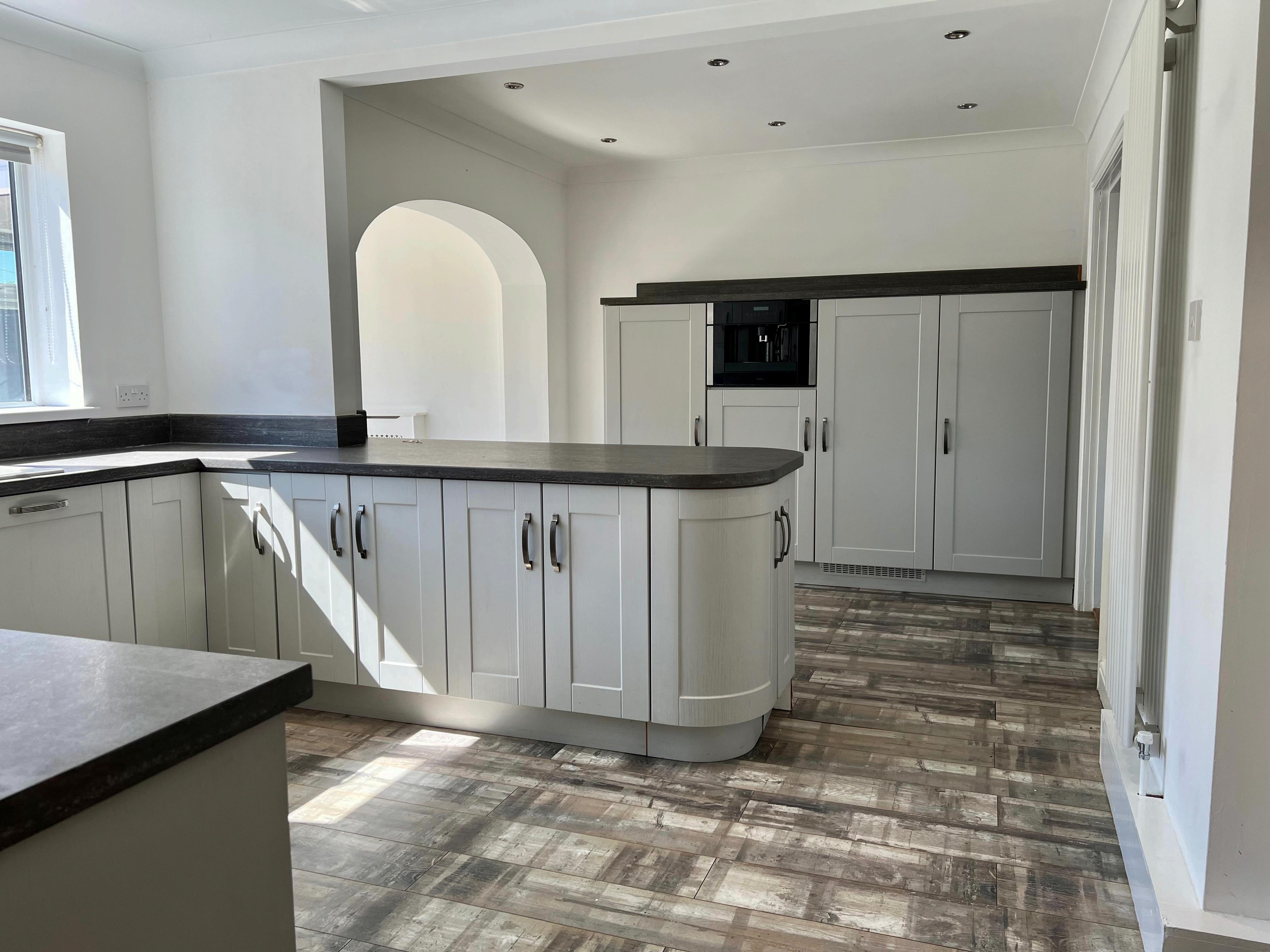 The real heart of the home is the impressive L-shaped open-plan kitchen, dining, and living area. The kitchen is fitted with contemporary units, integrated appliances, and a central island that doubles as a convenient breakfast bar. This flows seamlessly into the sun-filled sitting/sun room with double doors opening out onto the rear patio, making it perfect for entertaining or relaxing.