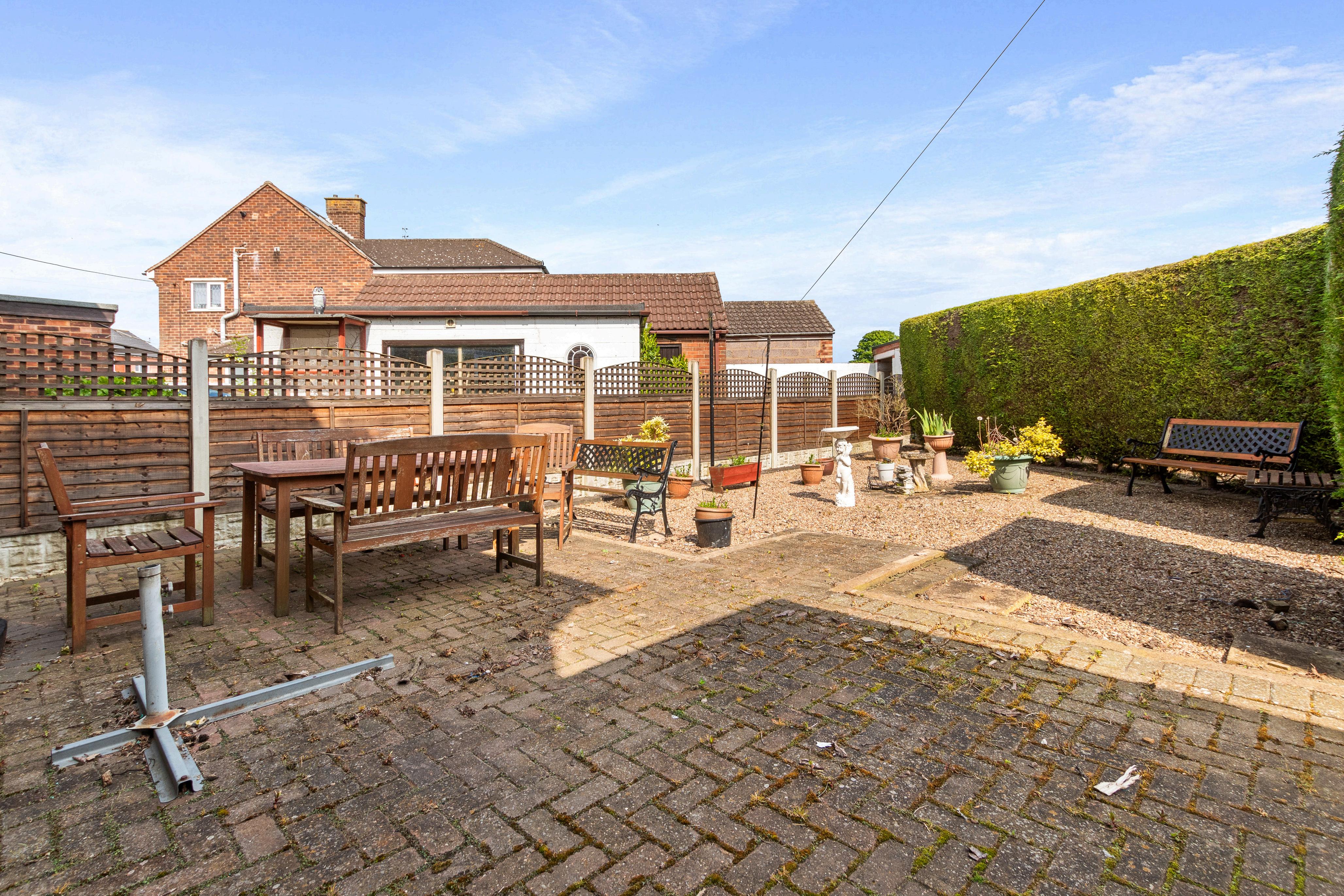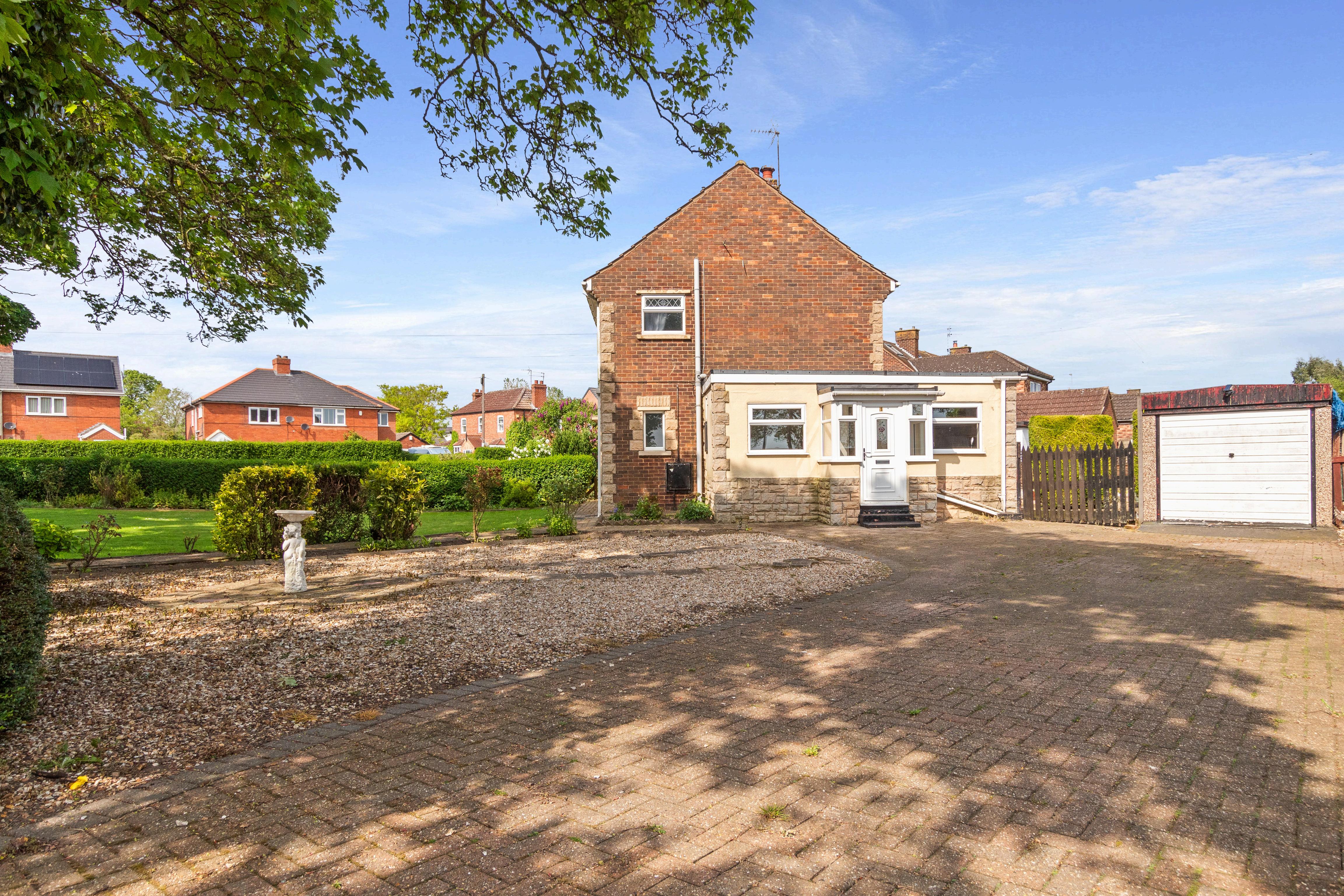 Externally, the property boasts further potential for enhancement. The expansive corner plot offers wraparound gardens to three sides, providing ample space for extension possibilities. The side driveway provides ample off-road parking for multiple vehicles, including a caravan or motorhome. The large front garden, predominantly laid to lawn with mature shrubs and bushes, adds to the property's curb appeal, while the low-maintenance rear garden features gravel and block paving. Concealed behind a conifer hedge, a timber garden shed offers storage space for garden tools, while a detached garage provides additional parking and storage options.