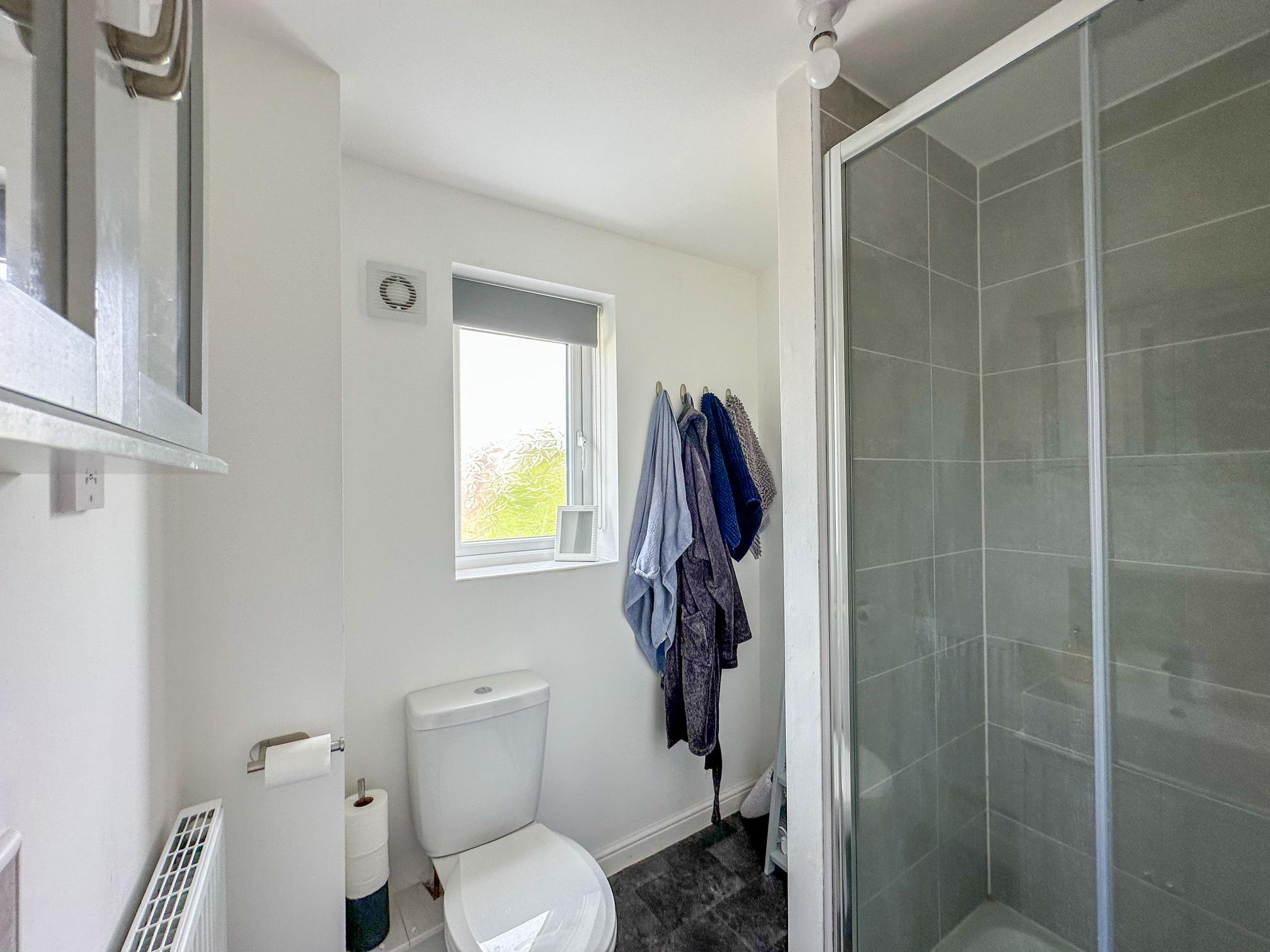 To the first floor are two good-size double bedrooms with the master benefitting from sliding door wardrobes and an additional single bedroom that is currently utilised as a study by the current owner. All are served by the modern family shower room with a white three-piece suite with a walk-in shower cubicle, a hand wash basin and a W.C.