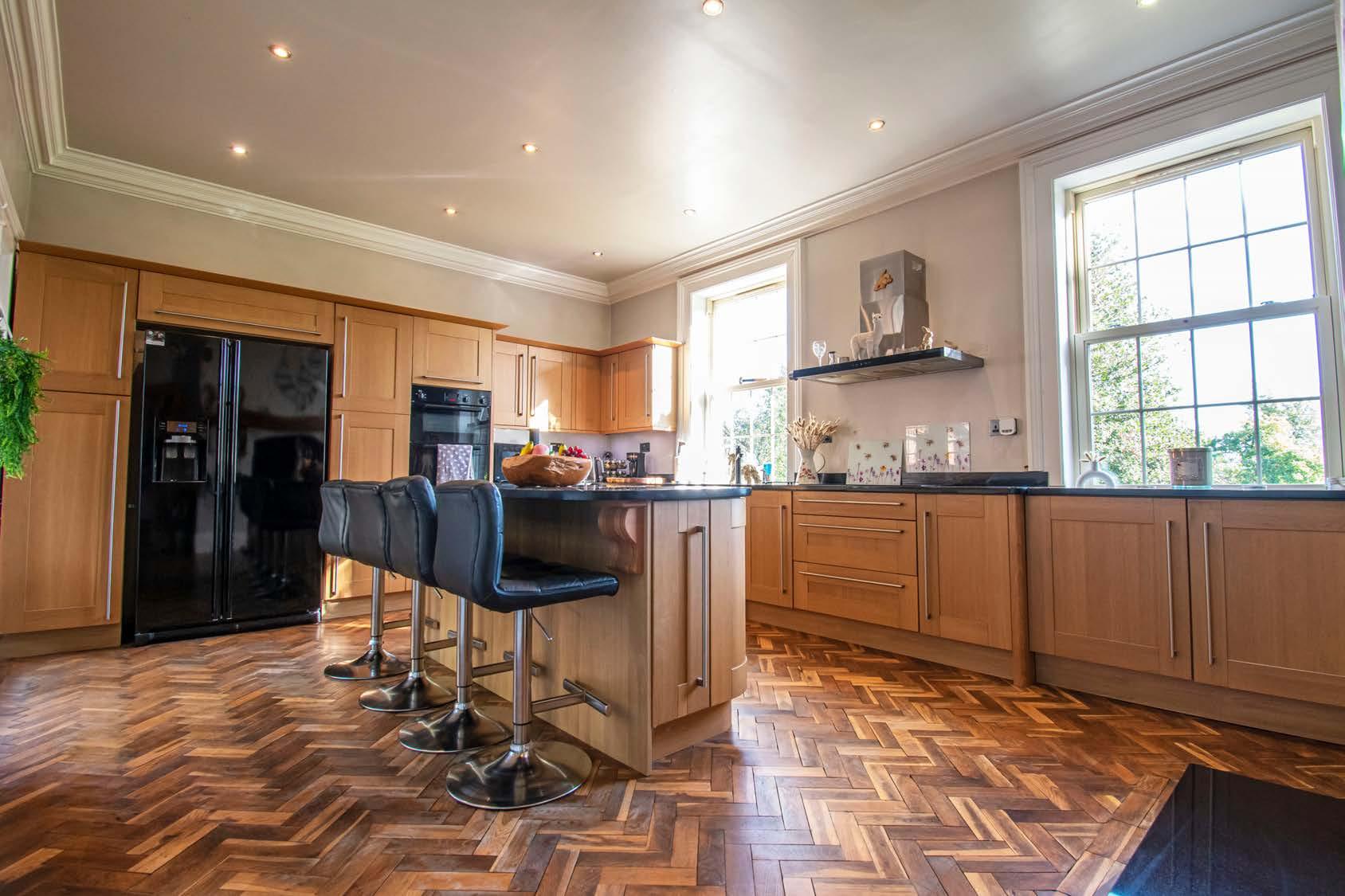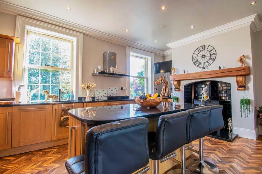 Theimpressivekitchenhasfeatureoakblockherringboneflooringandisfittedwitharangeofquality oakshakerstyleunitswhichincludesacentreIslandwithcurvedsidesincorporatingabreakfastbar whicharefinishedwithquartzworkingsurfacesandincludesarangeofintegratedappliances.Amulti fuelburningstovewithbackboilerissetintothechimneybreastwithoakbeammantleover.Asetof Frenchdoorsopentotherearaspect.
