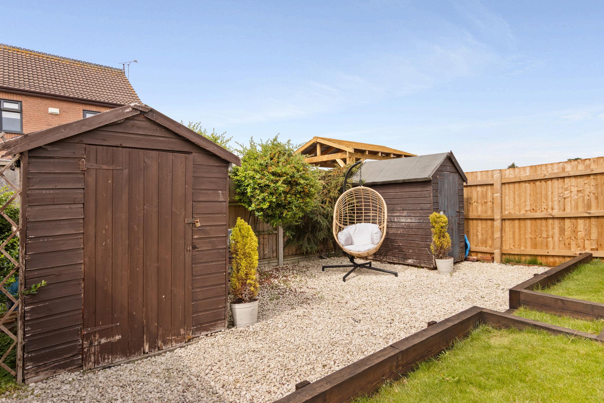 To the front, a block-paved driveway offers parking, with a neat lawn and planted borders, along with a pathway to the front door and gated side access. The generous rear garden is mainly laid to lawn with a paved patio area for outdoor seating, a low-maintenance gravel section, and two timber garden sheds.